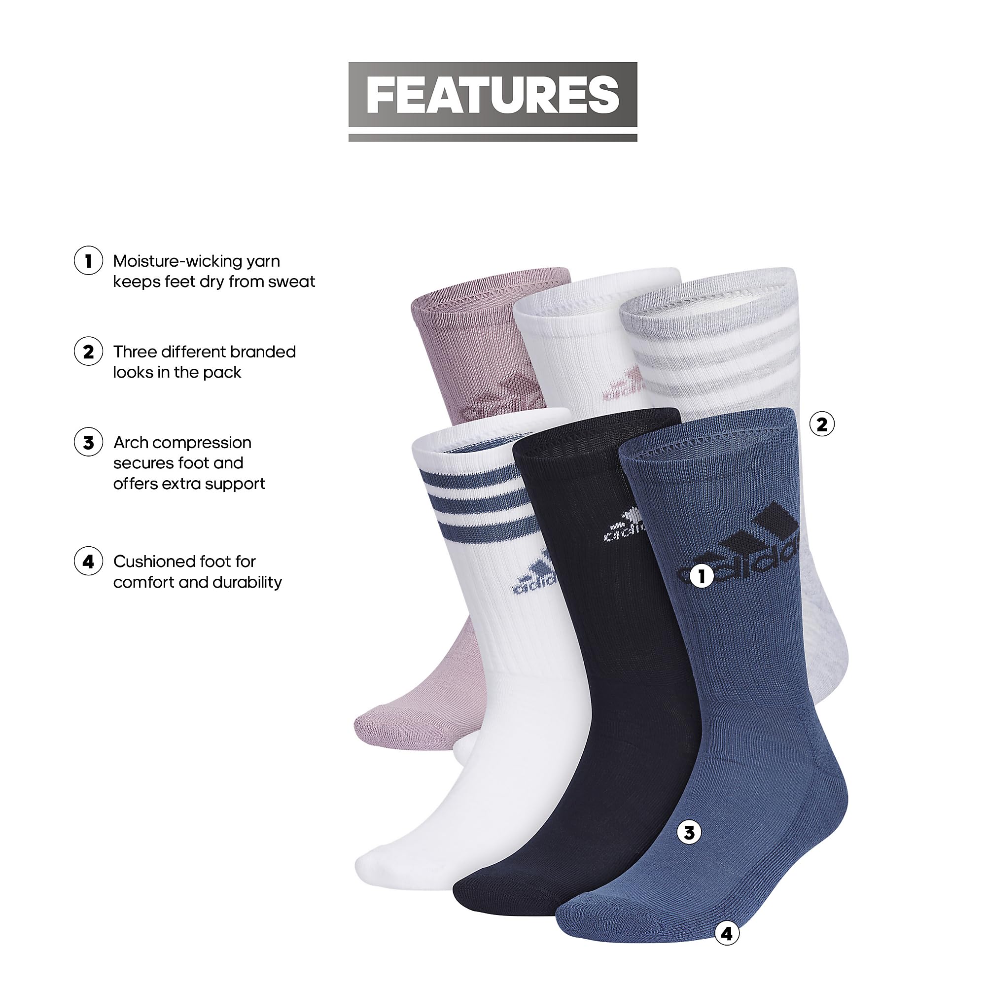 Description Discover a blend of comfort and performance with adidas Men's Athletic Cushioned Crew Socks. These mens socks come with arch compression for a secure fit, making them ideal as arch support socks. Whether you're searching for running socks men or long socks for men, this six-pair pack offers versatility and durability. Crafted from moisture-wicking yarns, these athletic socks for men keep feet dry, giving a comfortable experience all day. The cushioned foot provides extra comfort, while the secure fit supports daily activities, making them suitable as men socks. Experience comfort with a thoughtful design and durability to support your active lifestyle. Whether for everyday wear or intense athletic routines, adidas delivers quality mens socks to meet every demand.