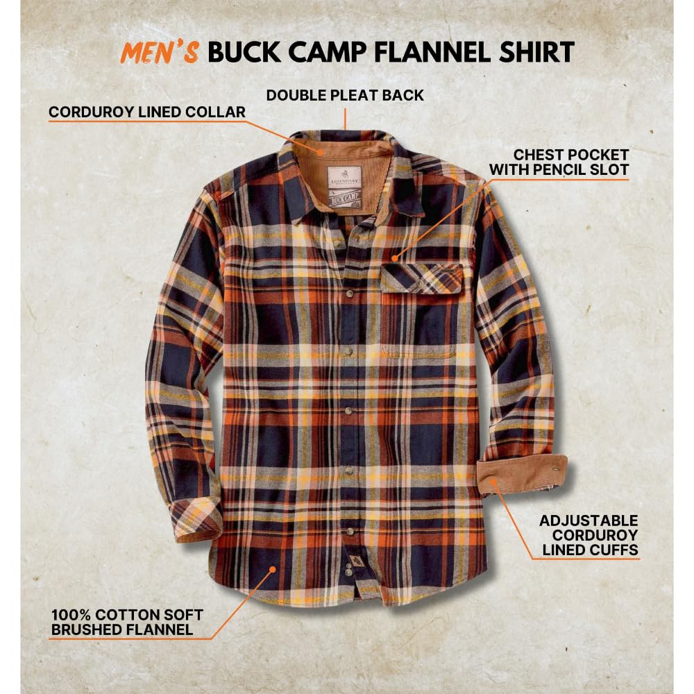 Description Our original single pocket flannel - The Buck Camp Flannel Shirt is the perfect weight to wear alone or layered over a t-shirt or under a shirt jacket. The traditional style and signature corduroy details offer unmatched durability, while the relaxed fit and brushed cotton flannel provide ultimate comfort. With multiple exclusive plaids and solids, they're suitable for any occasion from the woods to the office. The Buck Camp Flannel Shirt gives you an incredible "bang for your buck"! Big & Tall sizes are designed for men over 6'2" and add 2" in body length and 1-1⁄2" in sleeve length.