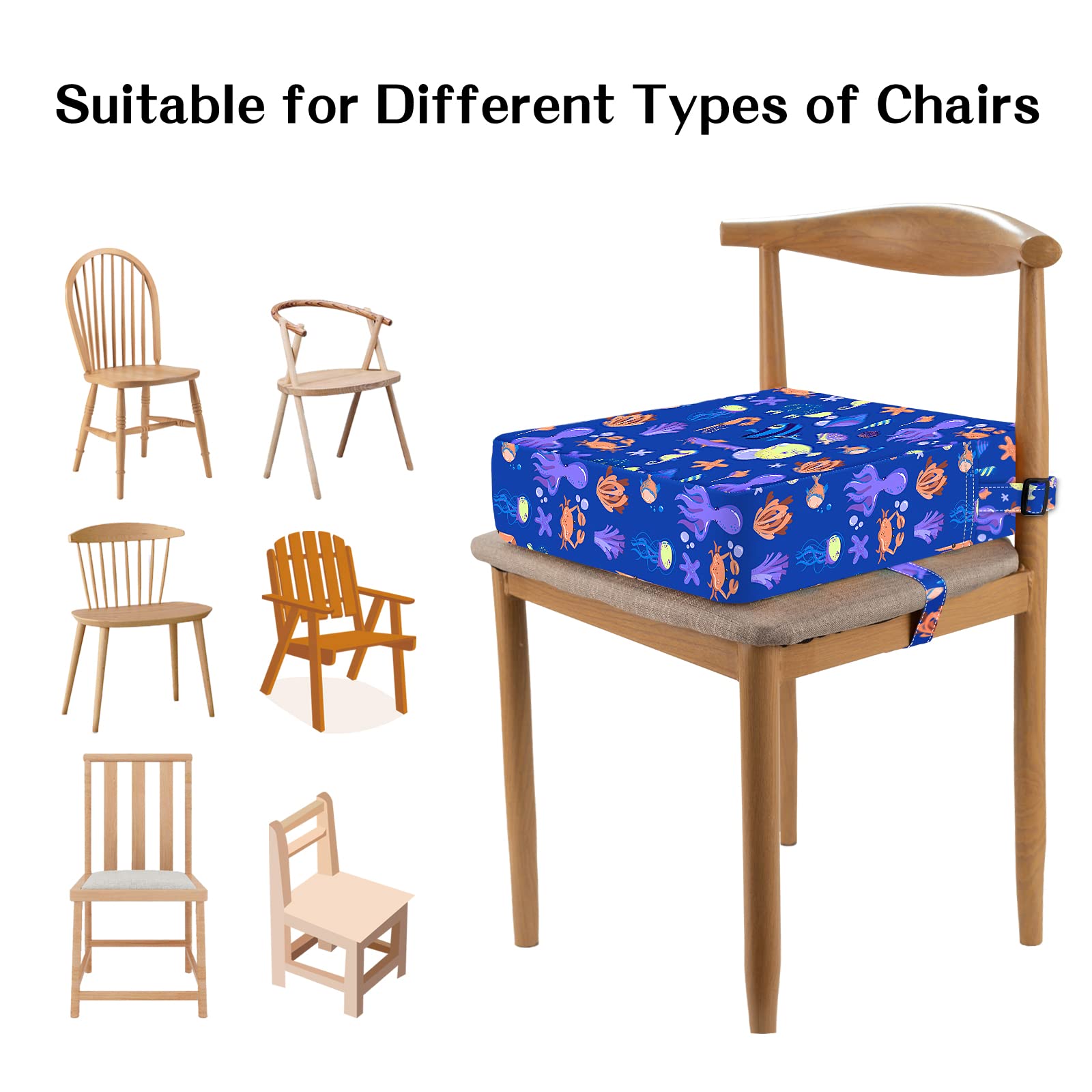ATTRACTIVE PATTERN: This toddler booster seat for dining table adopts an interesting animal pattern. Different types of marine life patterns can attract children's attention, let them quickly like the booster cushion that can help them increase their height