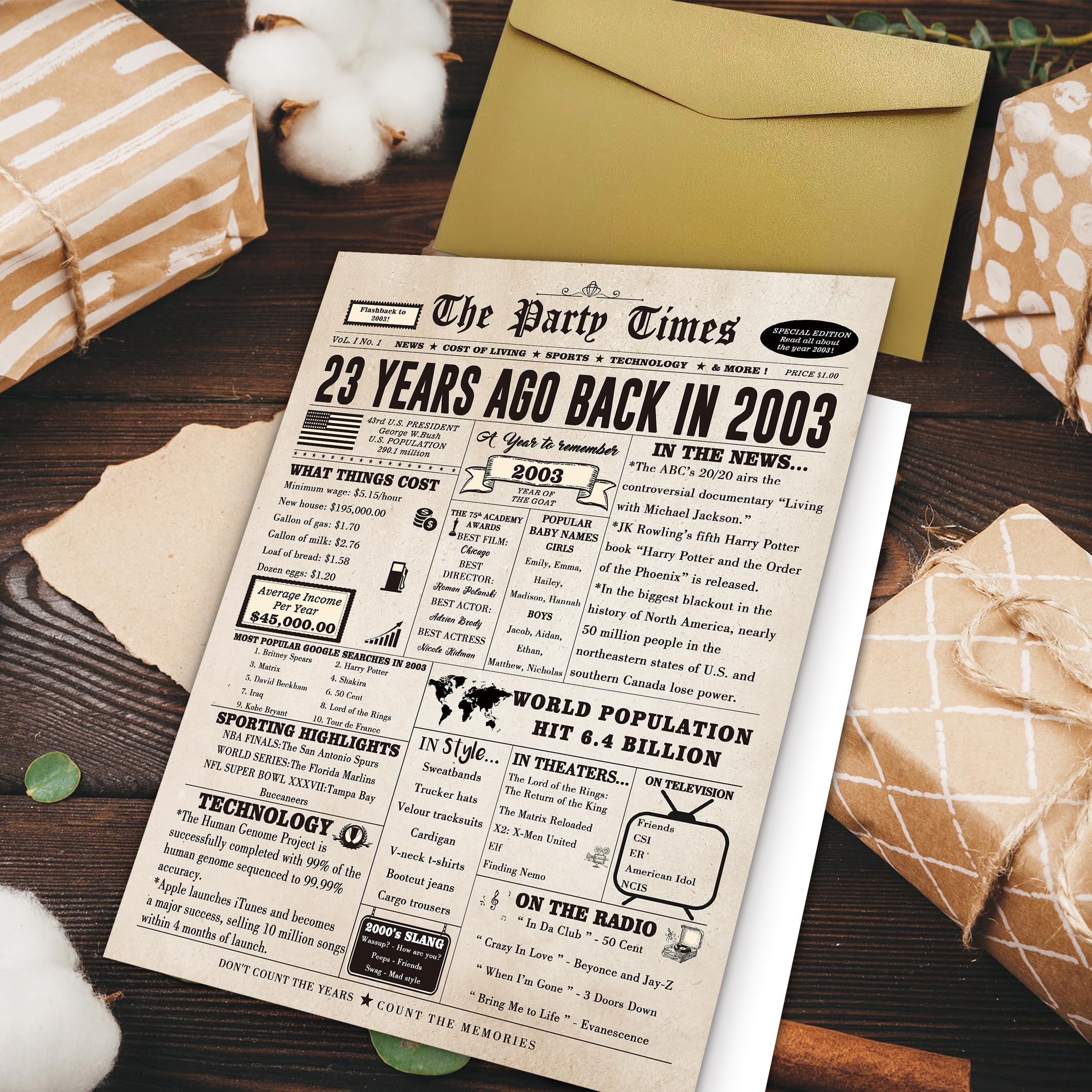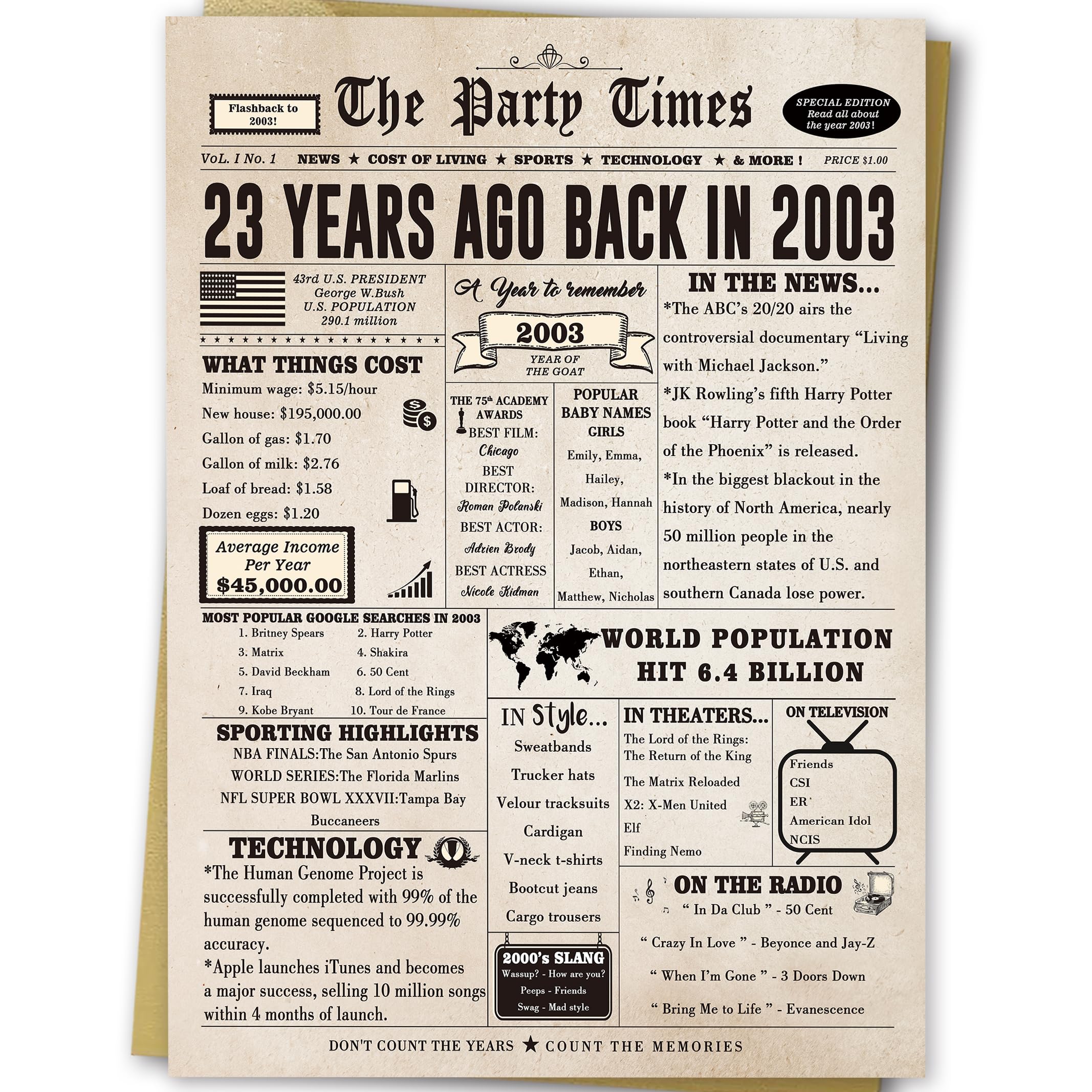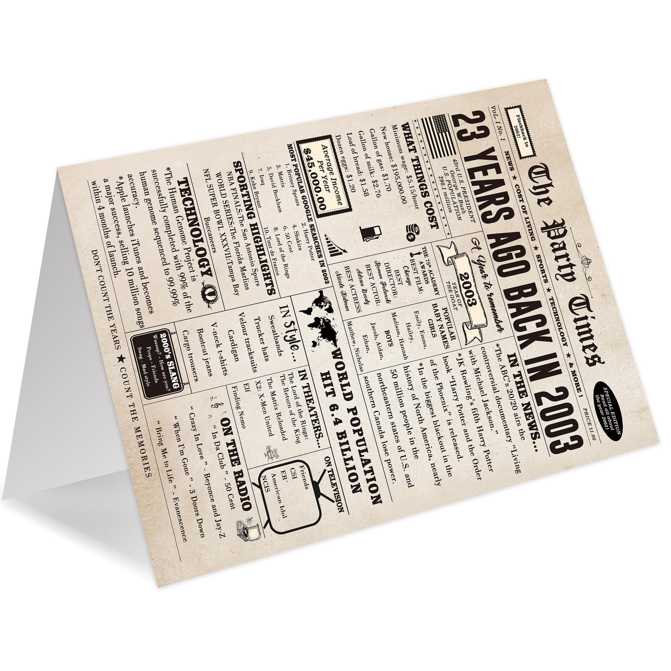 This large 23rd birthday card features a vintage newspaper design, showcasing important events, movies and sports events from 23 years ago