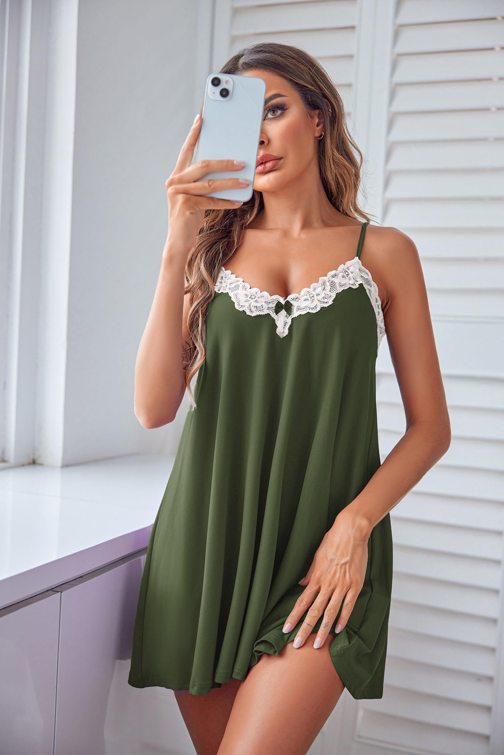 Unique Design. Ekouaer womens pajama dress,featured as adjustable spaghetti straps, unique V tie bow decoration, lace stitching design at the neckline, length at the middle of the thigh, make you more charming and elegant.