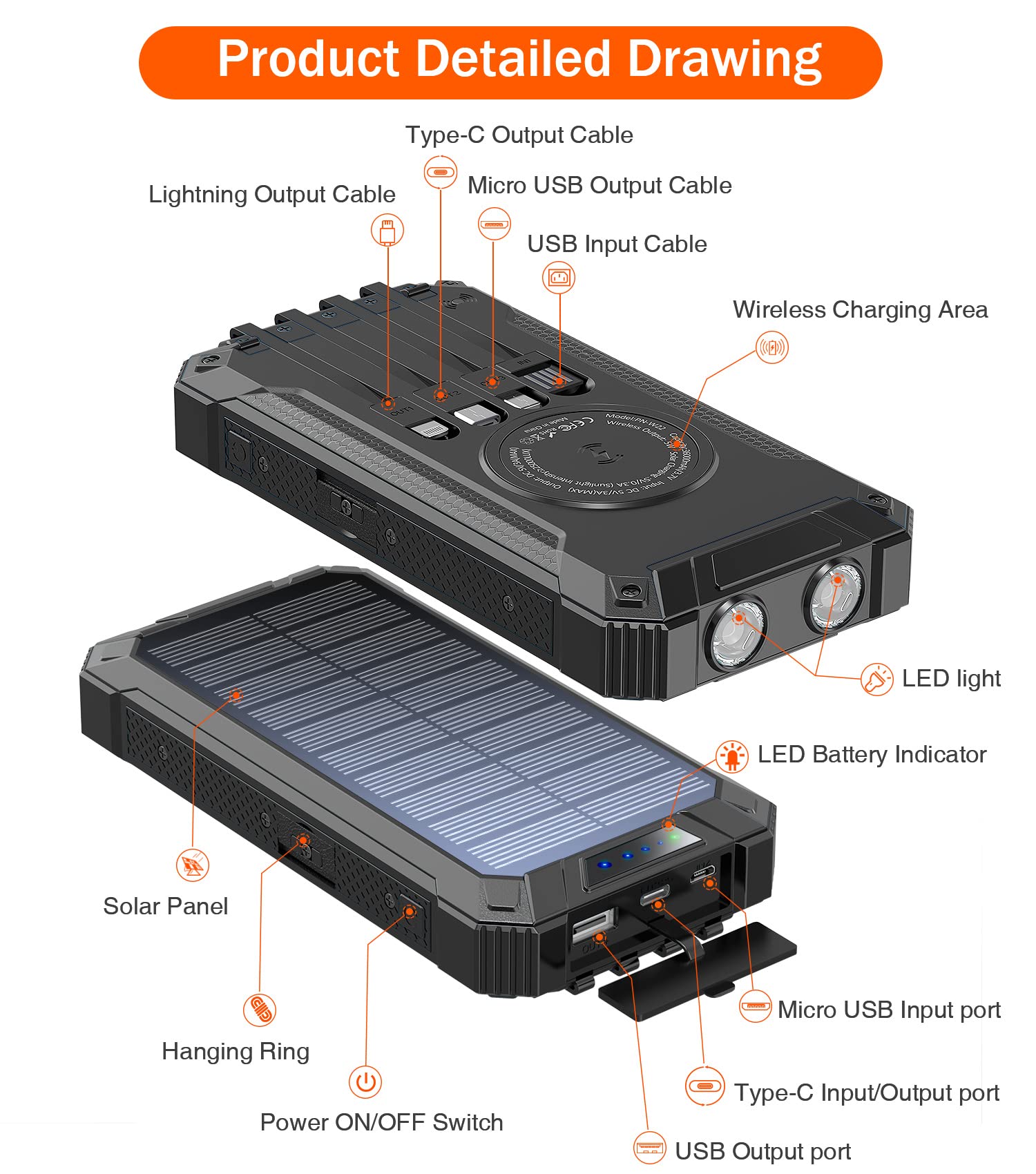 [Power 6 Devices at Once] This solar charger is also equipped with 4 ports (iOS input, USB A output, USB C input/output), providing 5V/3A high-speed charging to save time. Along with 4 charging cables and wireless charging, it supports charging 6 devices simultaneously. Keep all your devices alive. Sharing with families and friends is perfect.