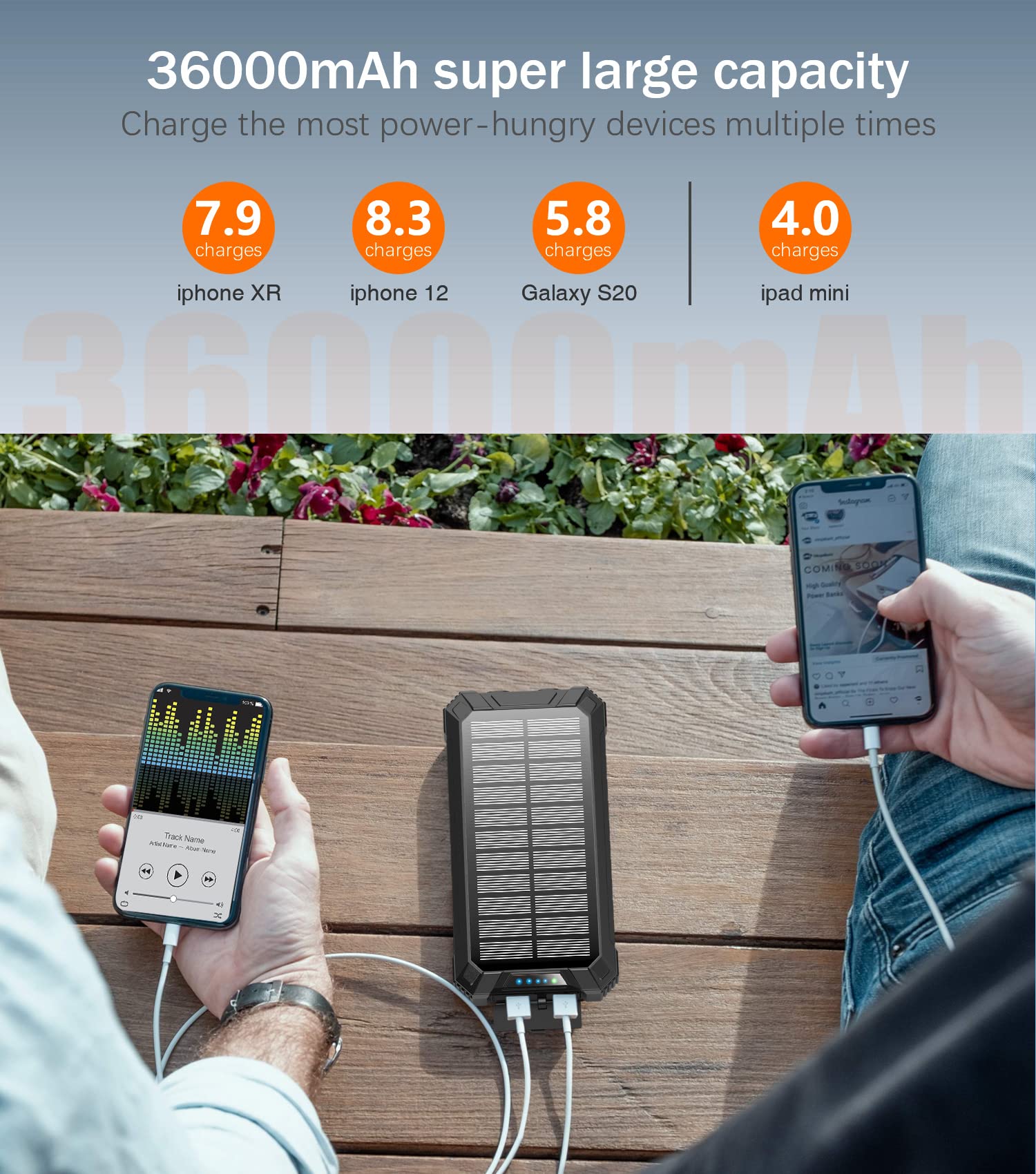 [Super Large Capacity] With 36000mAh premium Li-polymer battery, this solar power bank can charge your devices multiple times. It can be recharged via adapter and solar power, free your worries of poweroff. Equipped with smart protection IC chip, it guarantees charging safety intelligently.