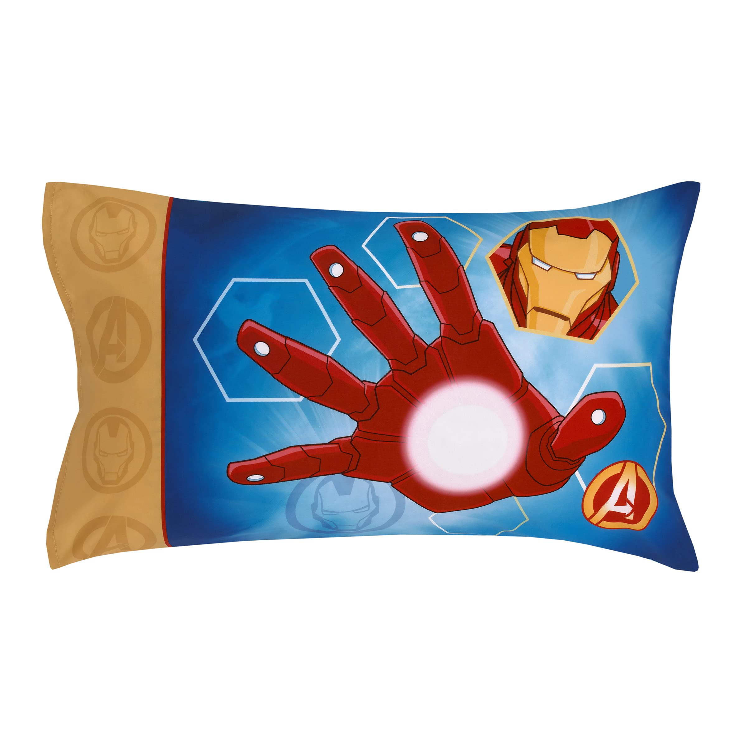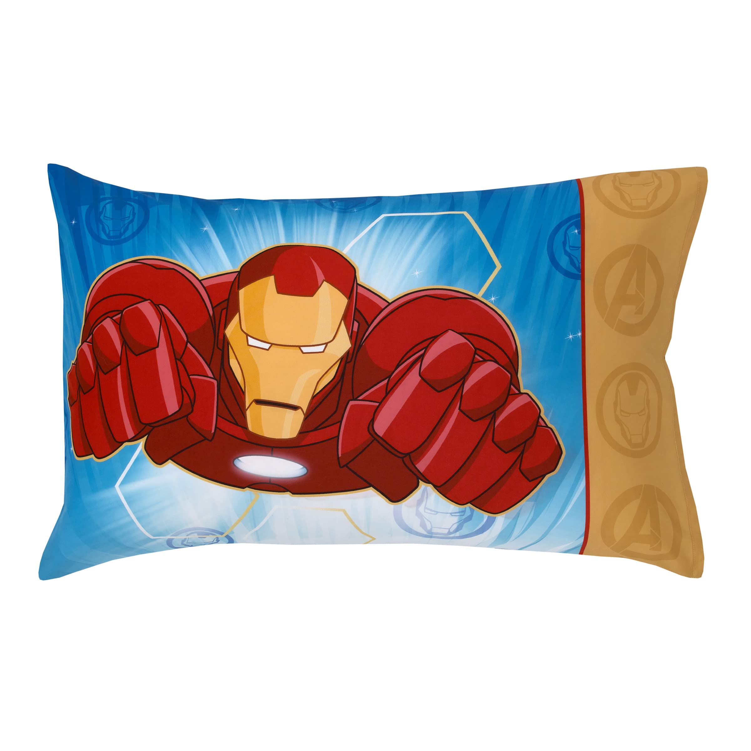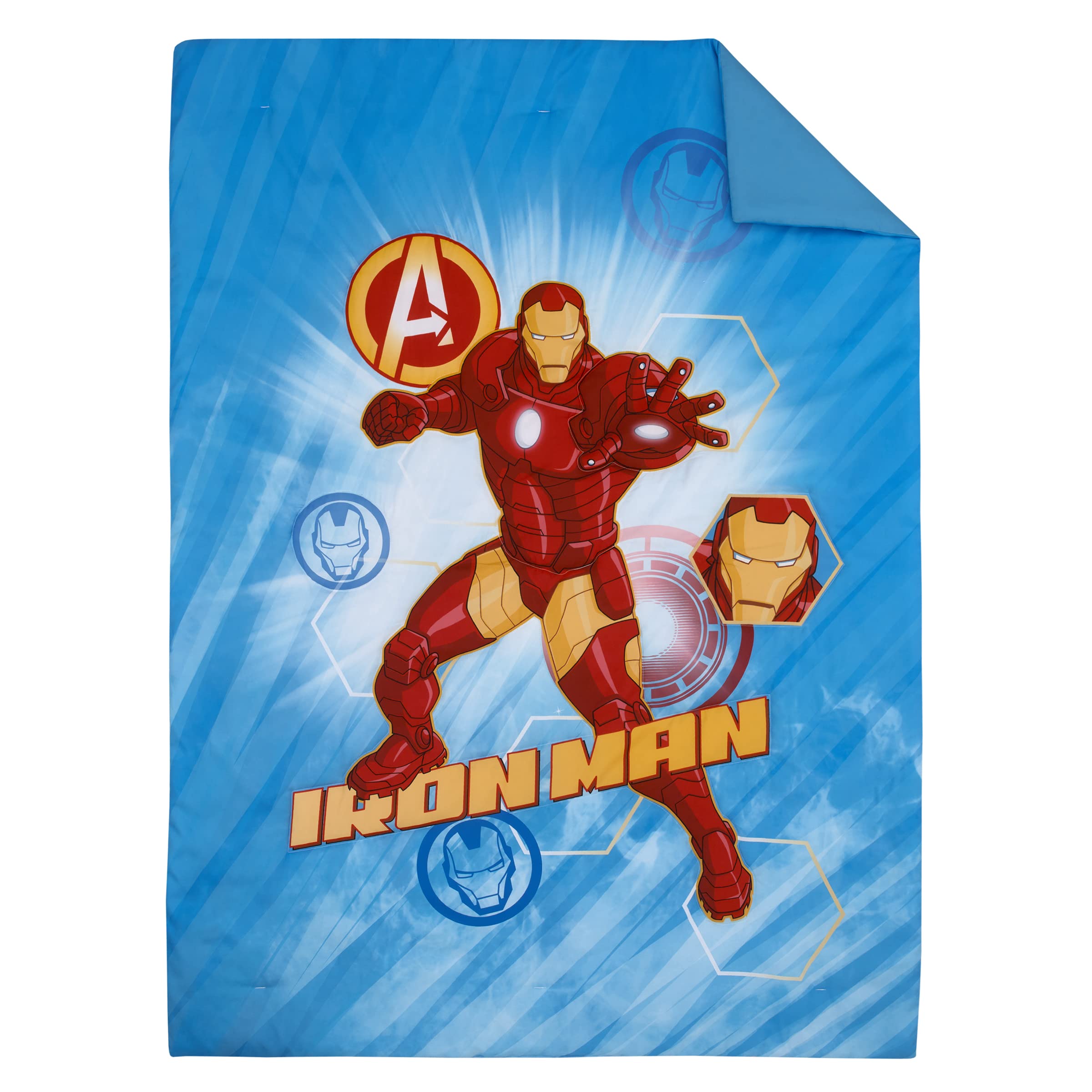 The Marvel's Avengers Iron Man 4 Piece Toddler Bedding Set includes a comforter, fitted bottom sheet, flat top sheet and reversible pillowcase. Measuring 42" x 57", this comforter features a light blue ground with a bold red and gold Iron Man posed ready to fight off evil! Detailed with "A" for Avengers and powerful words "IRON MAN". Both the fitted bottom sheet and flat top sheet are featured in a solid light blue. The top sheet measures 45" x 60". The fitted bottom sheet measures 28" x 52" and features full elastic for a safe and snug fit. The reversible pillowcase details Iron Man soaring through the air and measures 20" x 30". Made with snuggly soft fabrics. Machine washable for easy care! Your little superhero will dream of great adventures with this exciting Marvel collection!