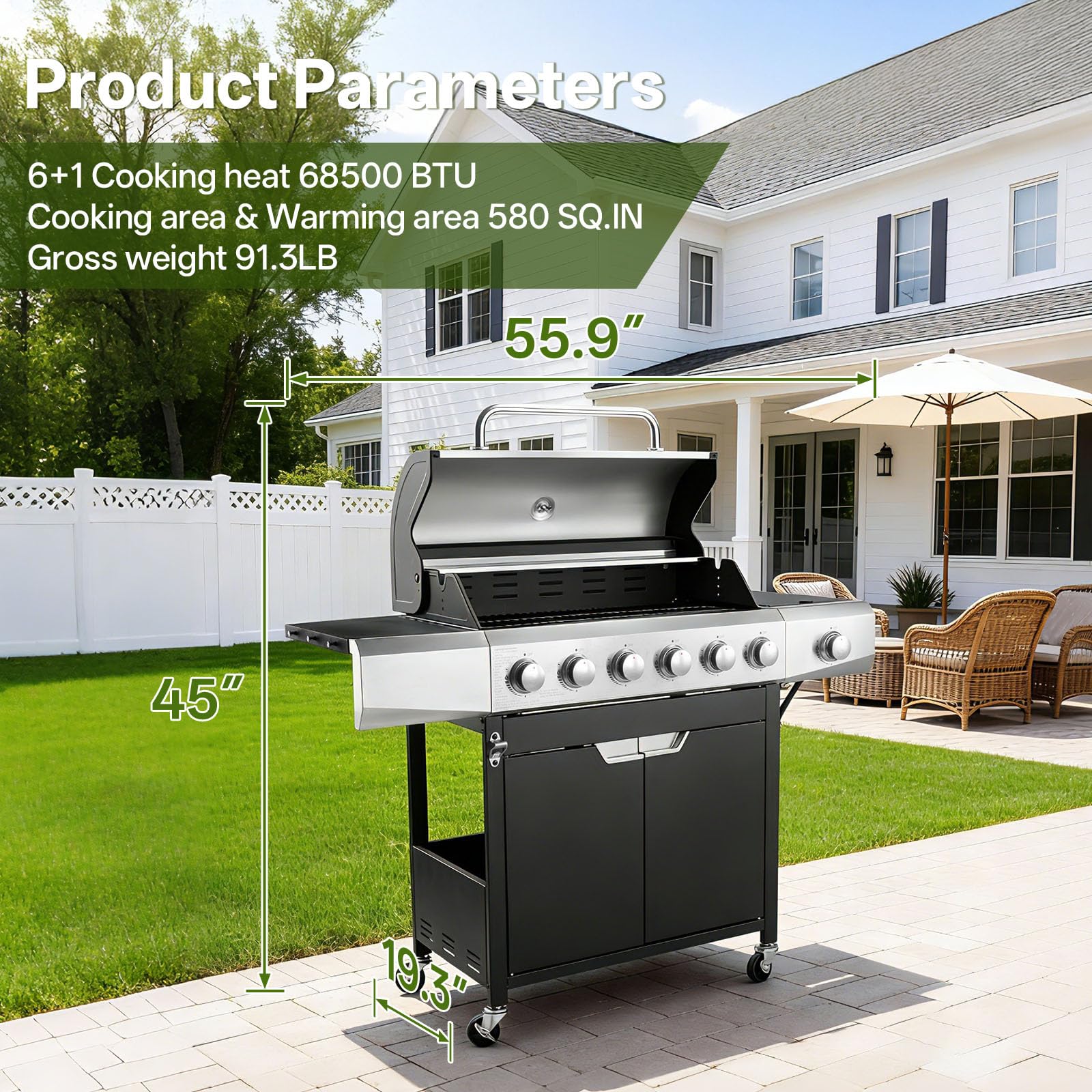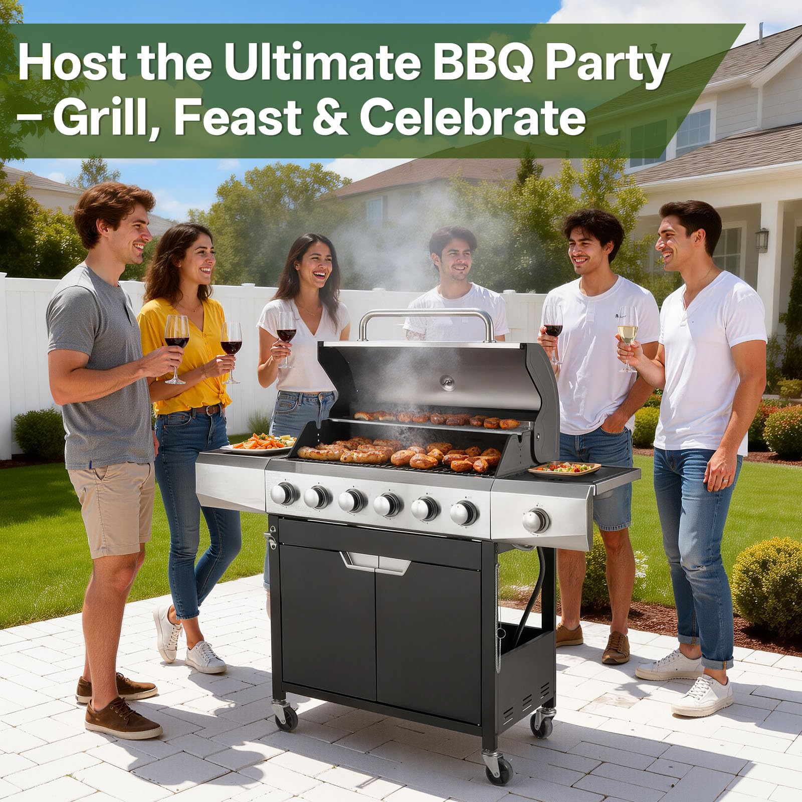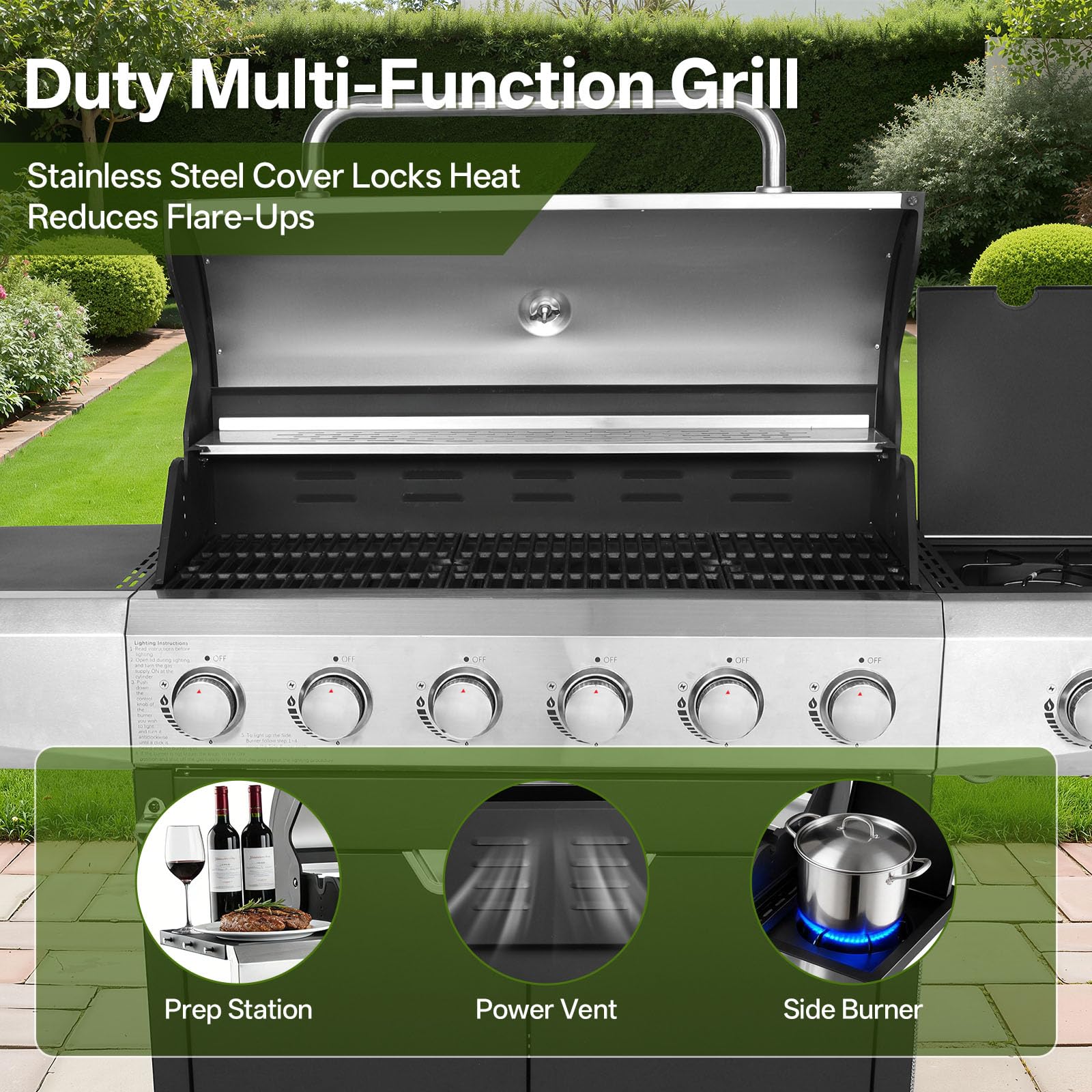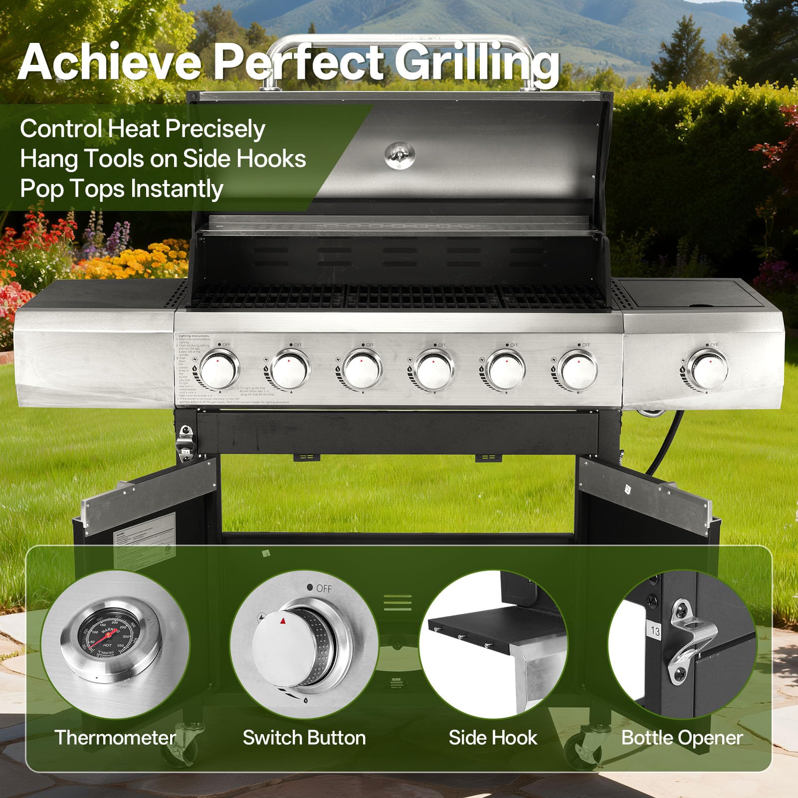 [Powerful Burners] Engineered for robust performance, this Gas Grill delivers 68,500 BTUs across six stainless steel burners for uniform searing, plus an 8,500 BTU side stove burner—making it a true gas grill with side burner for sauces or boiling water. With piezoelectric ignition and precision knobs, this propane grill excels in outdoor cooking, ensuring flawless flame control every time