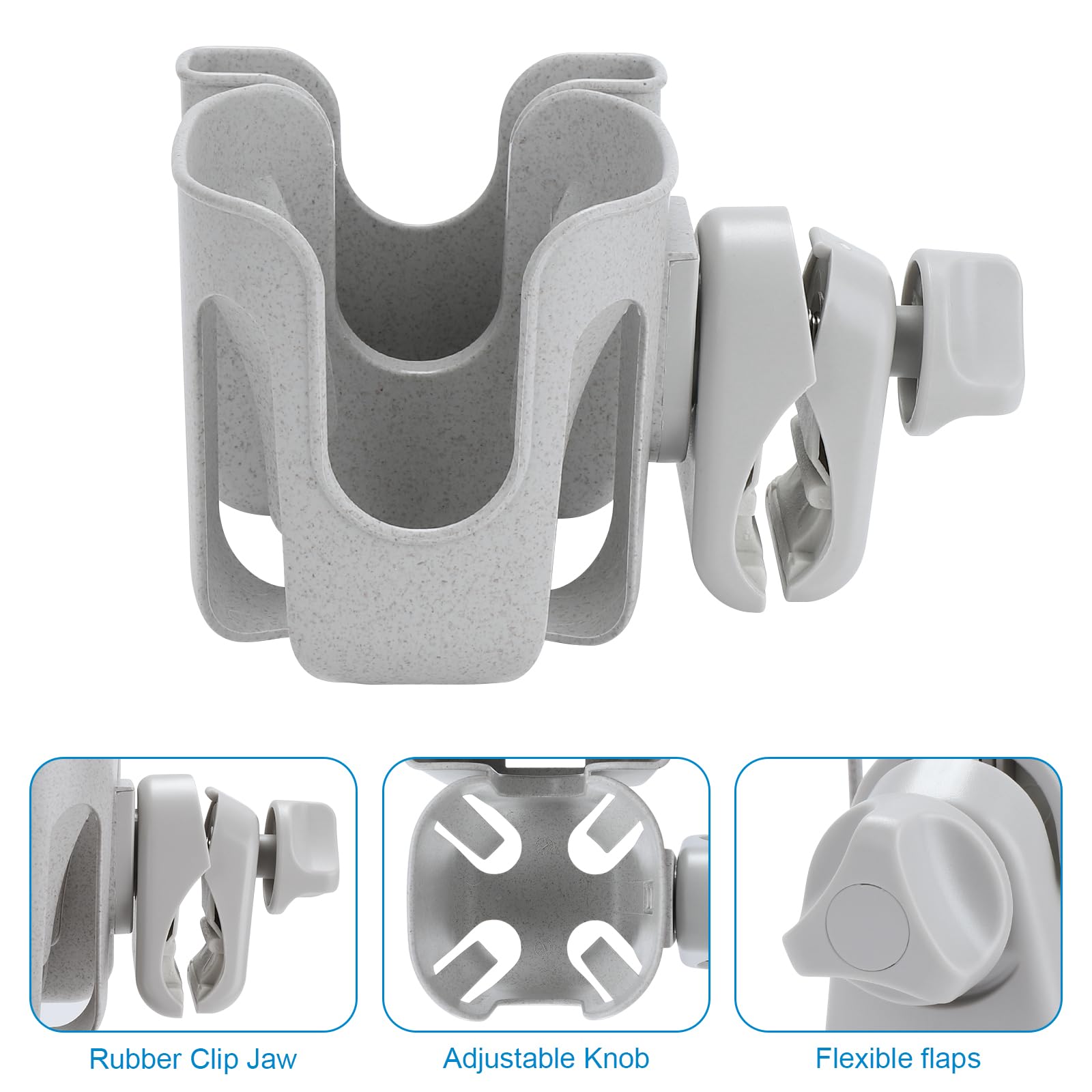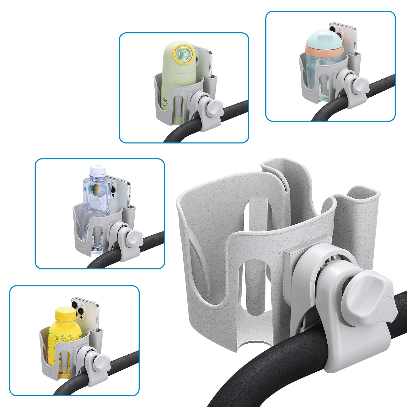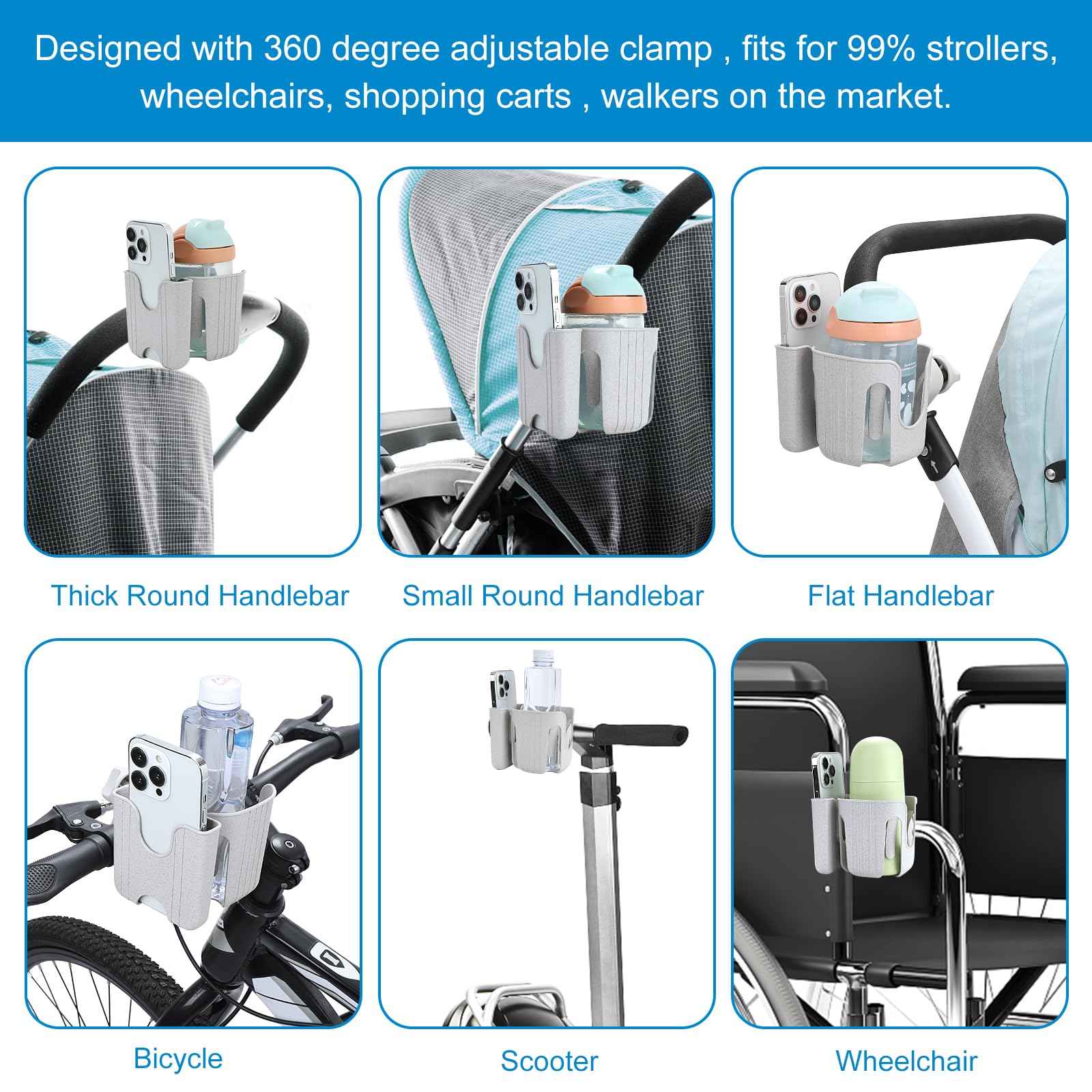 Multifunctional cup holder could be used for stroller, wheelchair, walker, bike, scooter, armrest, trolleys, pushchair, lawnmowers, ATV, treadmill, golf cart, shopping cart, kayak, boat handlebar, motorcycle, beach chair etc.