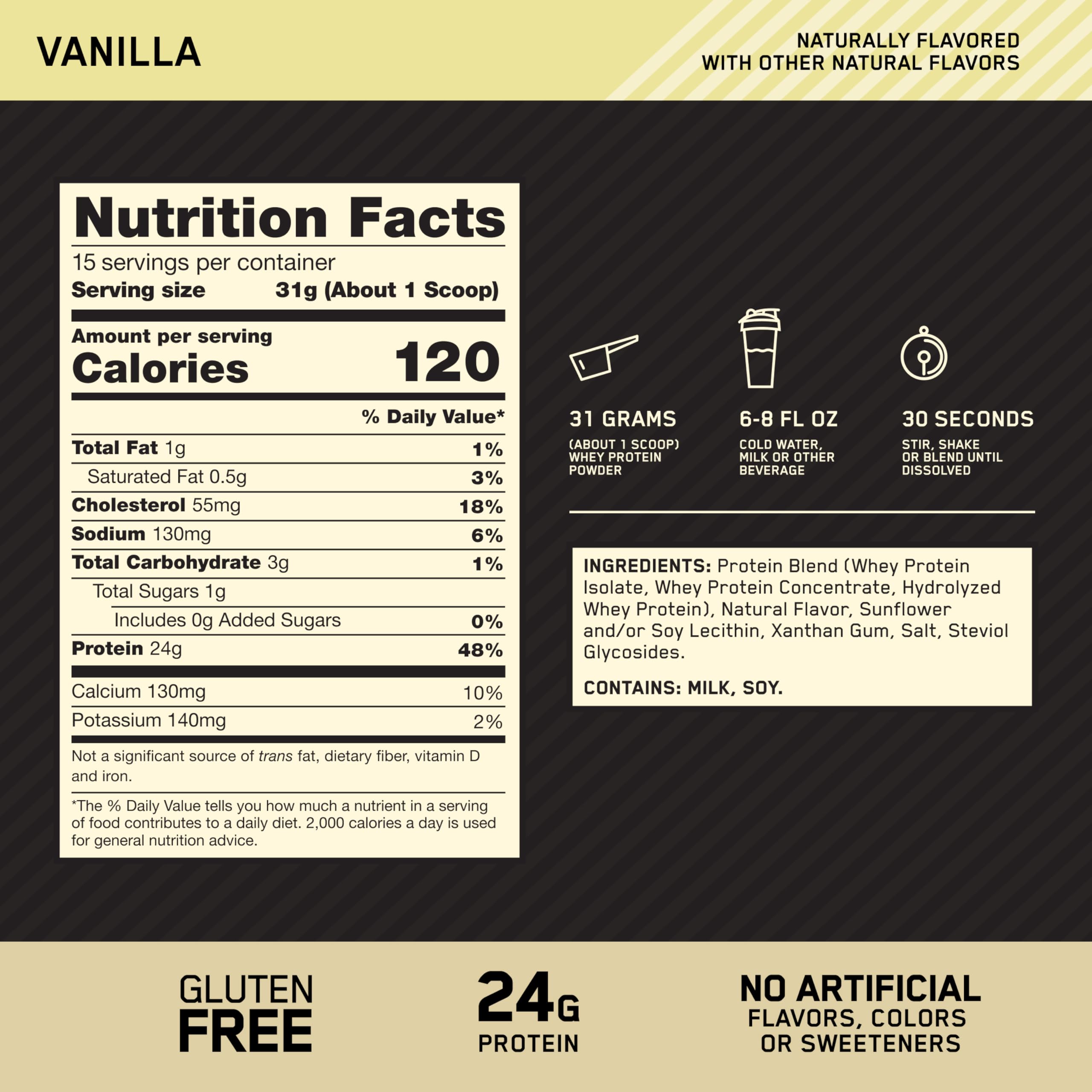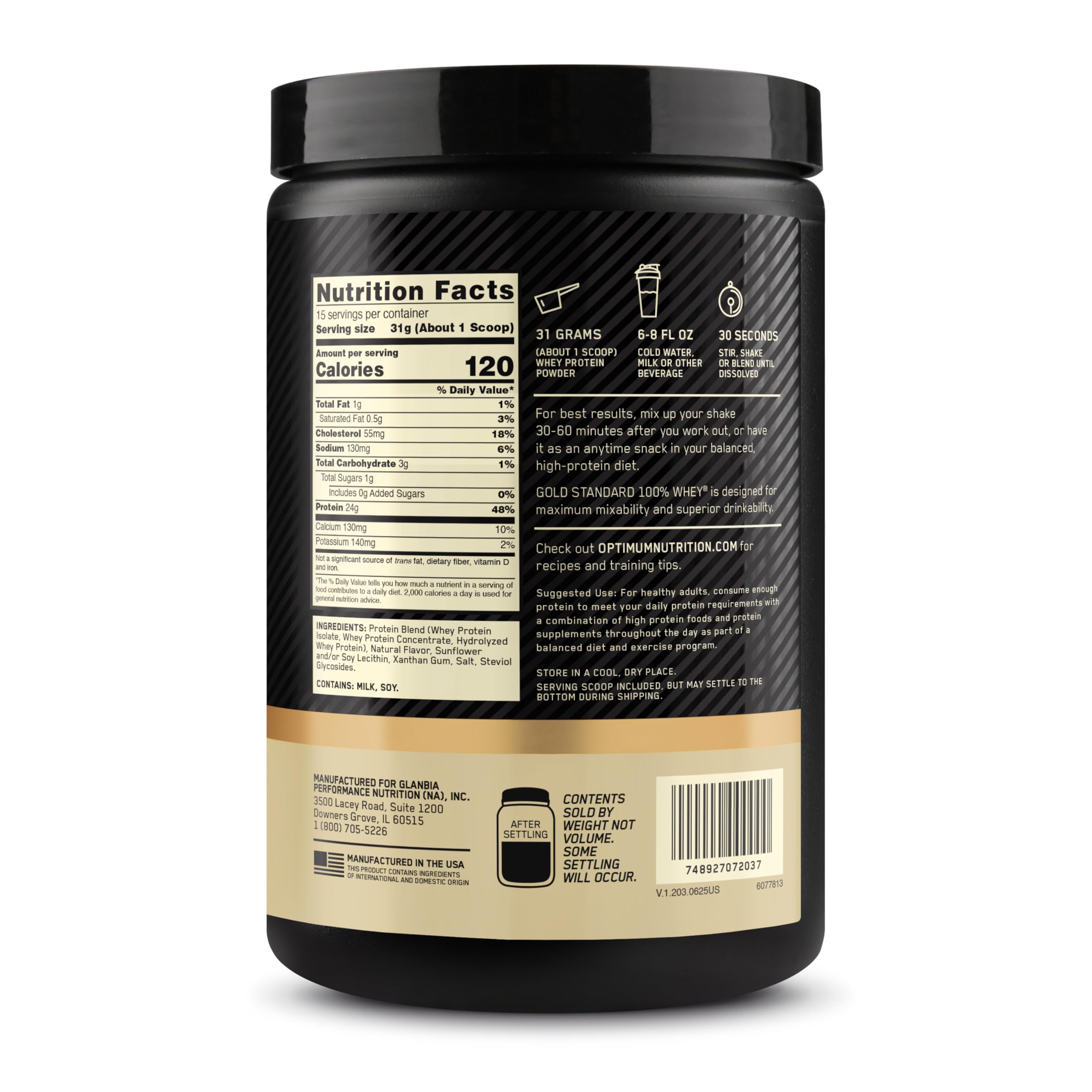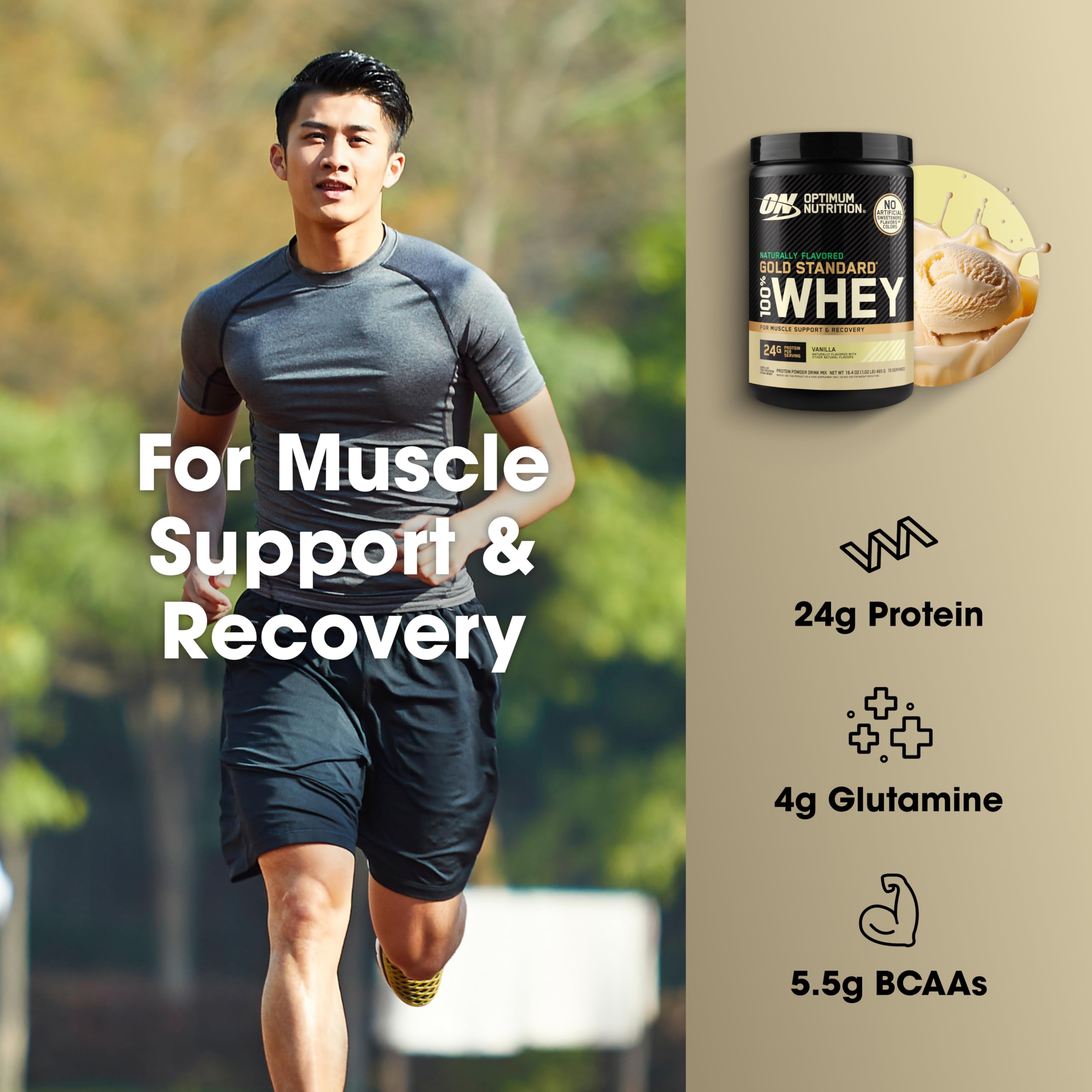 Gold Standard 100% Whey Naturally Flavored Protein Powder supports post-workout recovery* and helps build and maintain muscle* with 24g of protein and 5.5g of naturally occurring BCAAs per serving. Along with high-quality protein and easy mixing, every scoop serves up smooth, delicious flavor – all without the artificial flavors, colors, or sweeteners you choose to avoid in your performance nutrition routine. Crafted to be a complete, fast-digesting protein with whey protein isolate as the primary source – it’s a filtered form of whey that can support protein goals for people at every level of fitness – from regular gym-goers and daily runners to elite, competitive athletes in any sport or discipline.