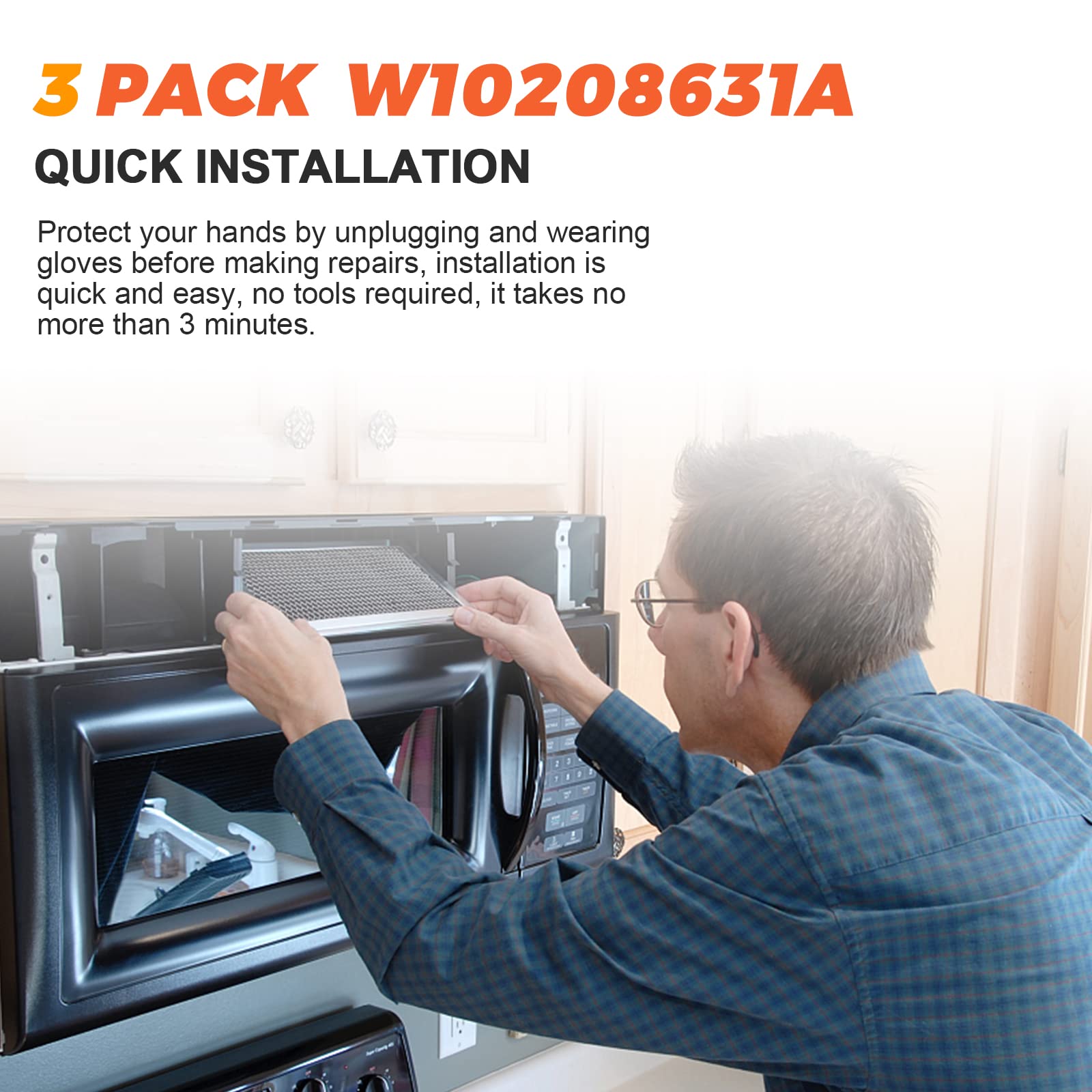 【INSTALLATION TIPS】- Installation requires no tools, just unplug and wear gloves to protect your hands.The entire installation process takes no more than 3 minutes. Install quickly and easily, saving you time and effort, convenient for you to replace the W10208631A Whirl-pool microwave grease filter in time to maintain the good performance of the microwave oven, eliminate the odor caused by cooking in time, and keep the kitchen air fresh