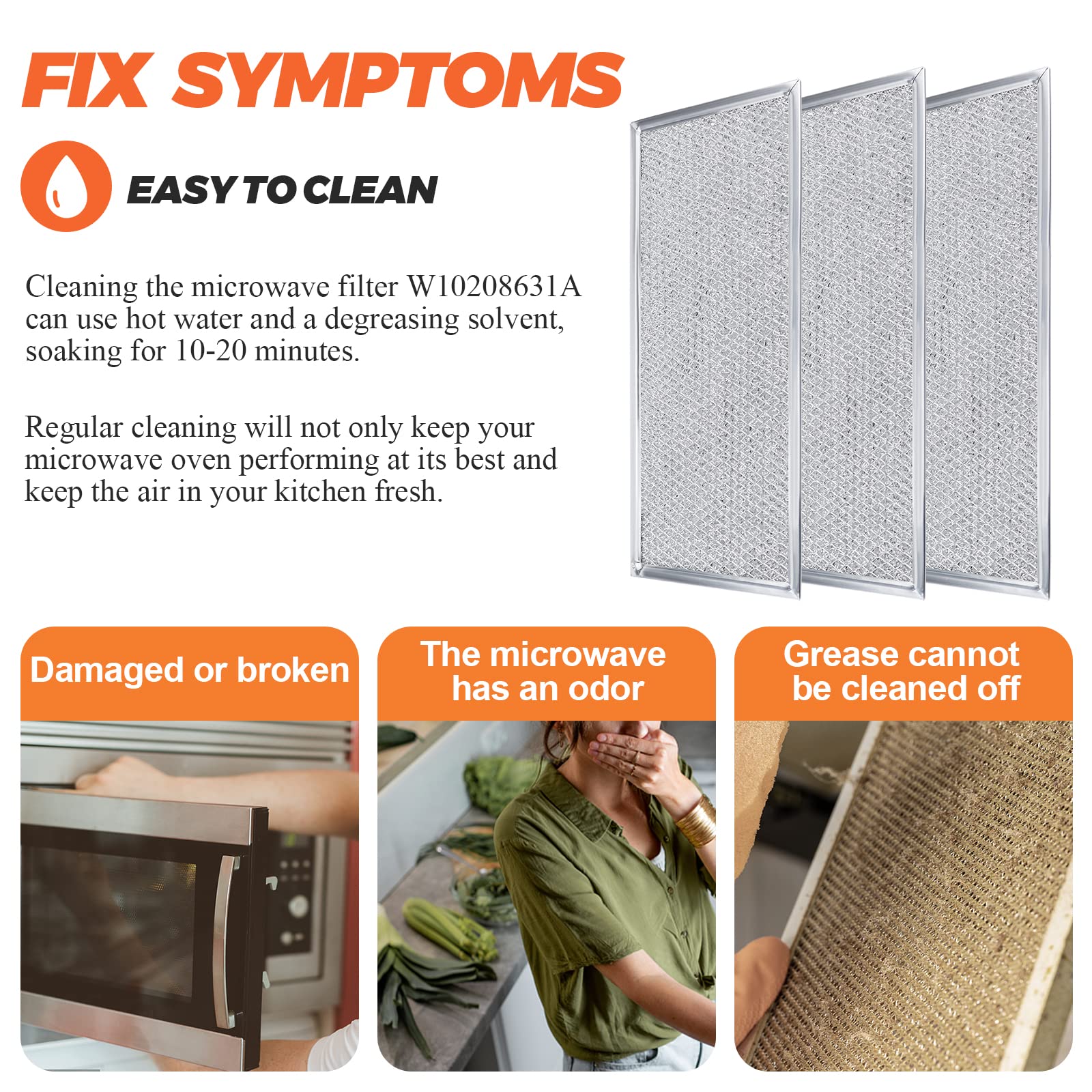 【PACKAGE INCLUDES】 - 3 X W10208631A whirl-pool microwave filter. Approximate size: 13" X 6". Just make sure to measure your old filter before buying new ones, make sure its the exact size or it will not fit. For best performance, to ensure air circulation and to remove odours, it is highly recommended to change your microwave filter every 6 months
