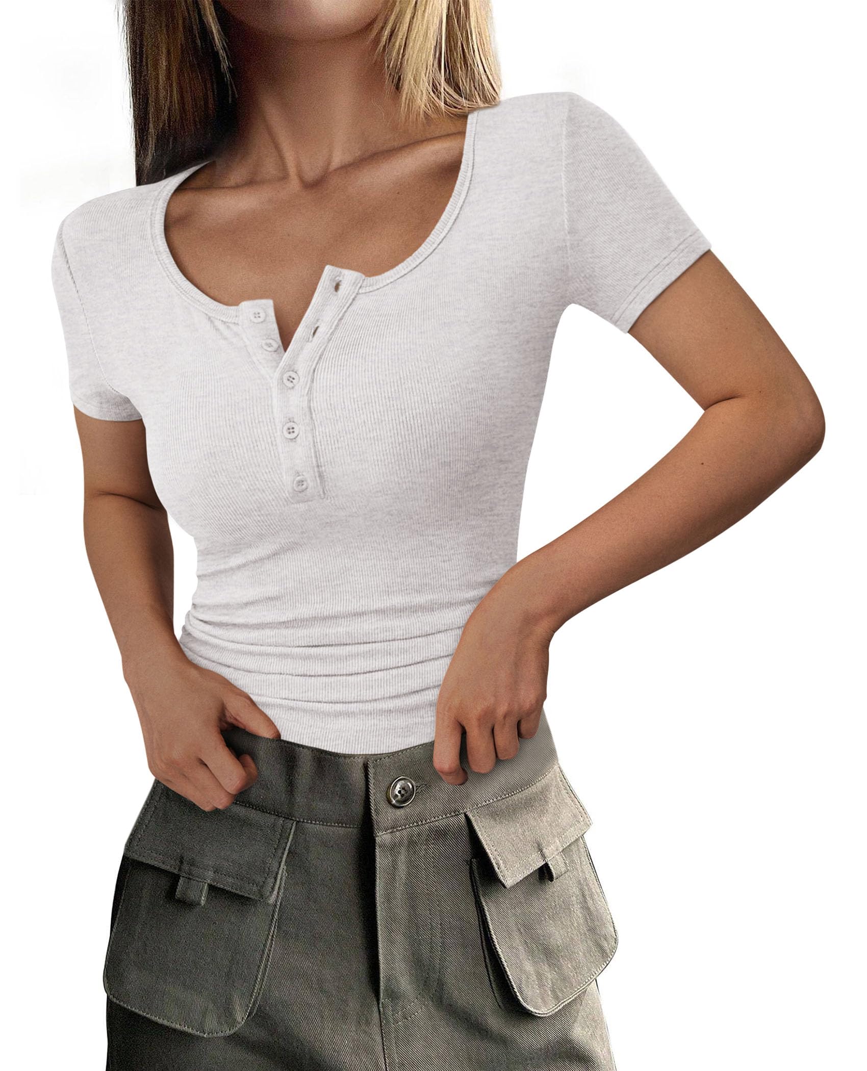 FEATURES: Short Sleeve Womens Tee Shirt; Henley Shirts for Women; Button Up Summer Tops; Fitted Tops For Women; Ribbed Casual Tops For Women; Solid Color Ladies Tops And Blouses; Going Out Tops For Women; Spring Women's T-Shirts; Basic Tops For Woman
