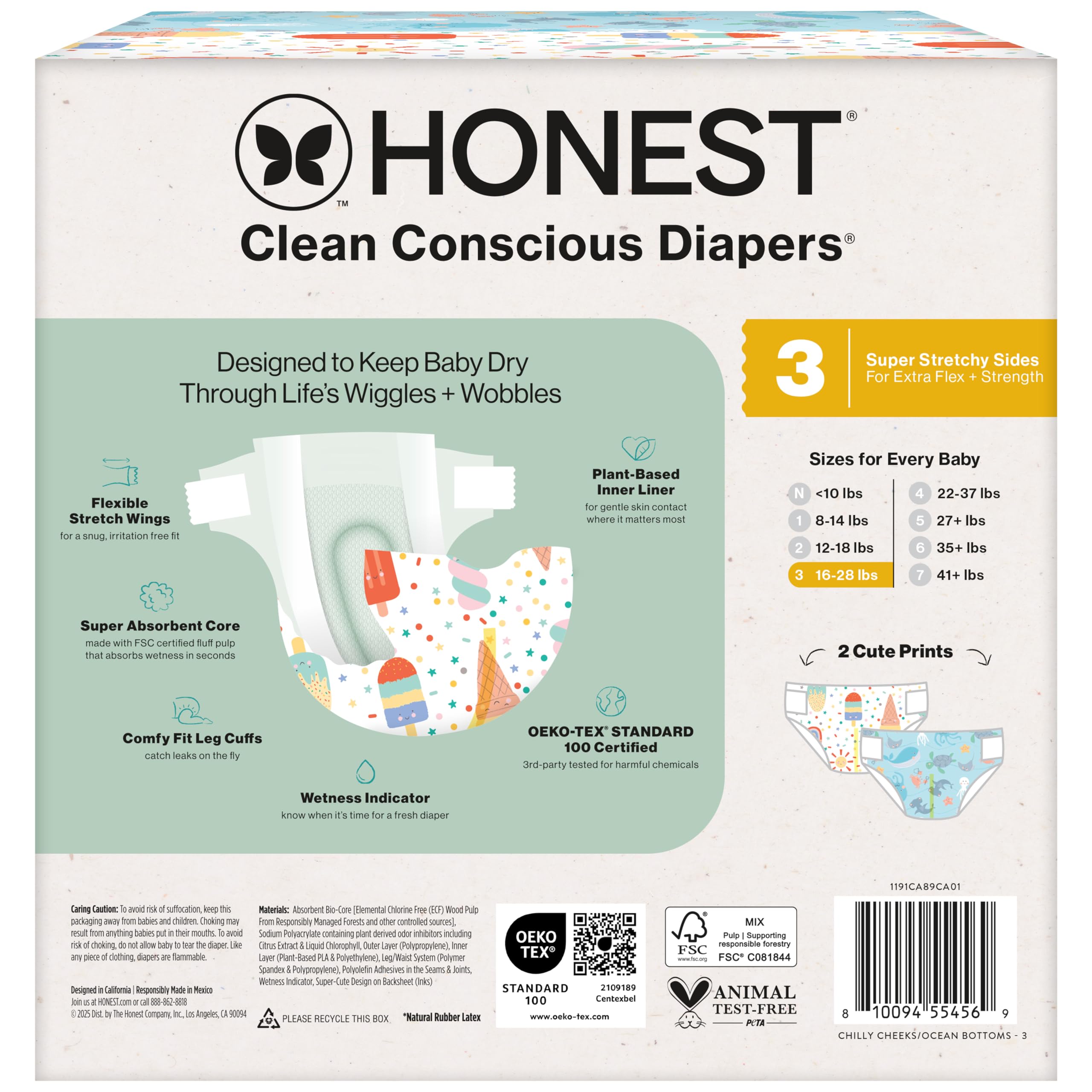 Designed to protect delicate skin, Honest Clean Conscious Diapers keep baby comfortable and dry through all the wiggles and wobbles! Our softest diaper yet delivers up to 100% leak protection with Comfort Dry Technology. The hypoallergenic, plant based inner liner, flexible stretch wings, super absorbent core, and channel technology provide a comfy, secure fit for all ages and stages. Because safety is top priority, these diapers are OEKO-TEX STANDARD 100 Certified, a 3rd party that tests for 350 harmful chemicals, and made with FSC Certified Fluff Pulp and other controlled materials. And for cuteness overload, each diaper features a super cute print!