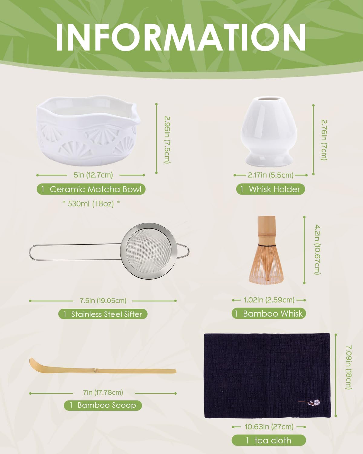 Complete Matcha Set:This matcha set includes everything needed for an traditional matcha experience: - 1x handmade bamboo matcha whisk (chasen) - 1x bamboo scoop (chashaku) - 1x stainless steel sifter - 1x 530ml/18oz ceramic matcha bowl (chawan) - 1x whisk holder - 1x tea cloth - 1x Hand-Book