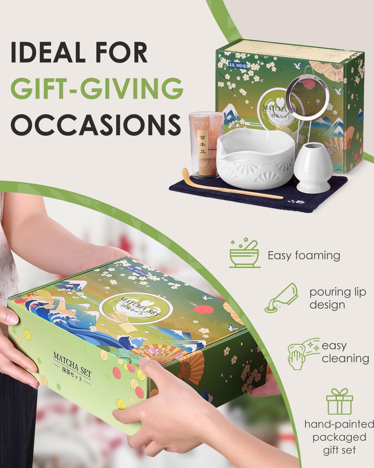 The Ideal Matcha Gift Set: Curated as a functional work of art, this matcha set reflects timeless craftsmanship—from the traditionally made tools to the hand-painted gift box.It bridges traditional Japanese tea culture with modern elegance, honoring heritage while serving as a practical statement of refined living. Whether gifted or kept for personal ritual, this set offers a tangible piece of culture and a moment of mindful practice every day.