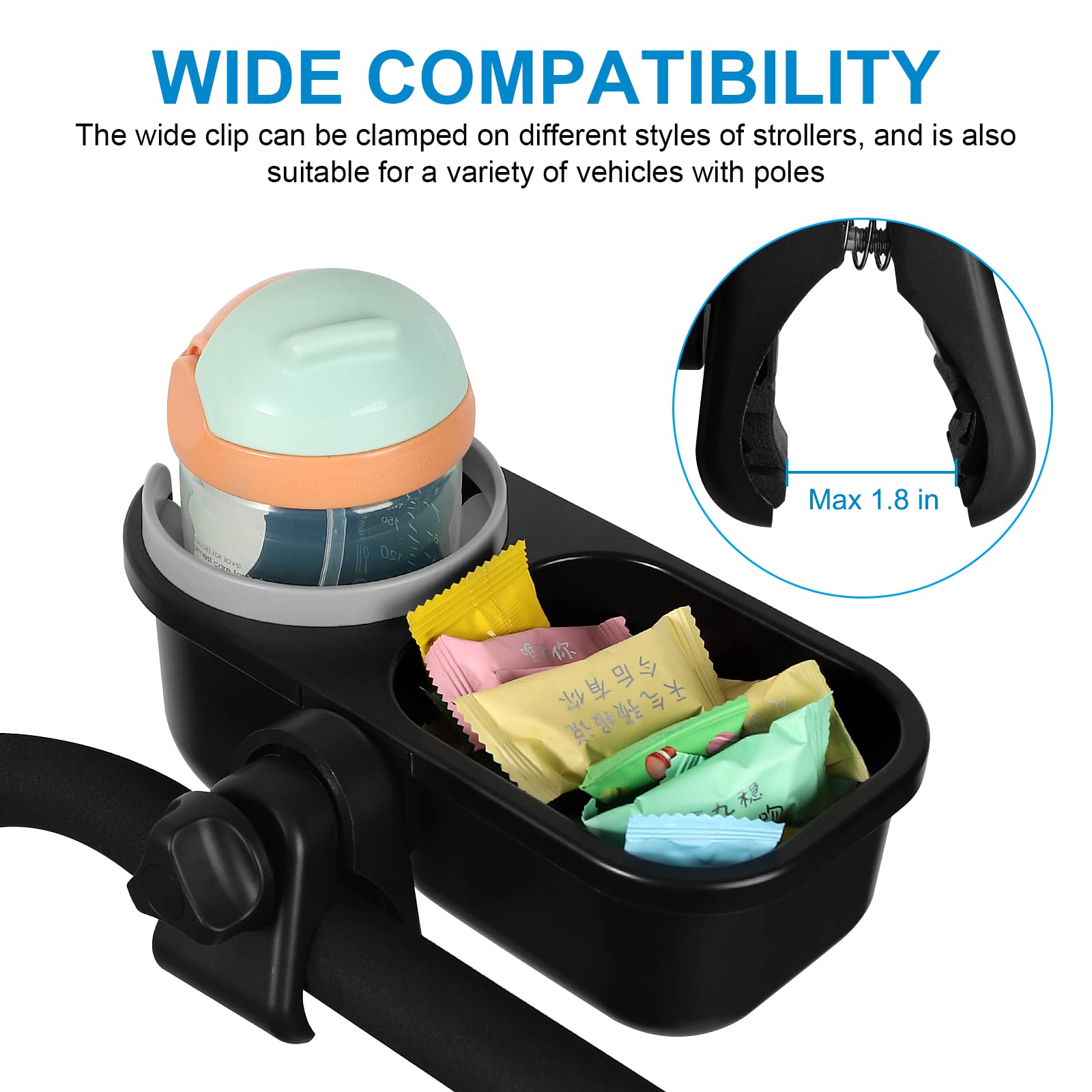 The clamp designed with rubber pad, firmly clip on the stroller rod to avoid sliding. The clip range is 0.55-1.77 in / 14 mm- 45 mm, the width of the clip can freely adjust and firmly clamp on the stroller rod to avoid sliding easily. It also allows 360 degree rotation, so it can be installed on different angle.