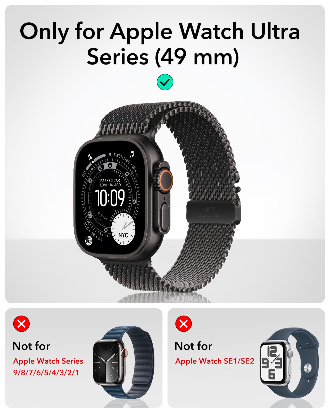 Compatibility: compatible with Apple Watch Ultra 3/Ultra 2/Ultra (2025/2024/2023/2022) 49 mm; not for Apple Watch Series 10/9/8/7/6/5/4/3/2/1 and Apple Watch SE1/SE2