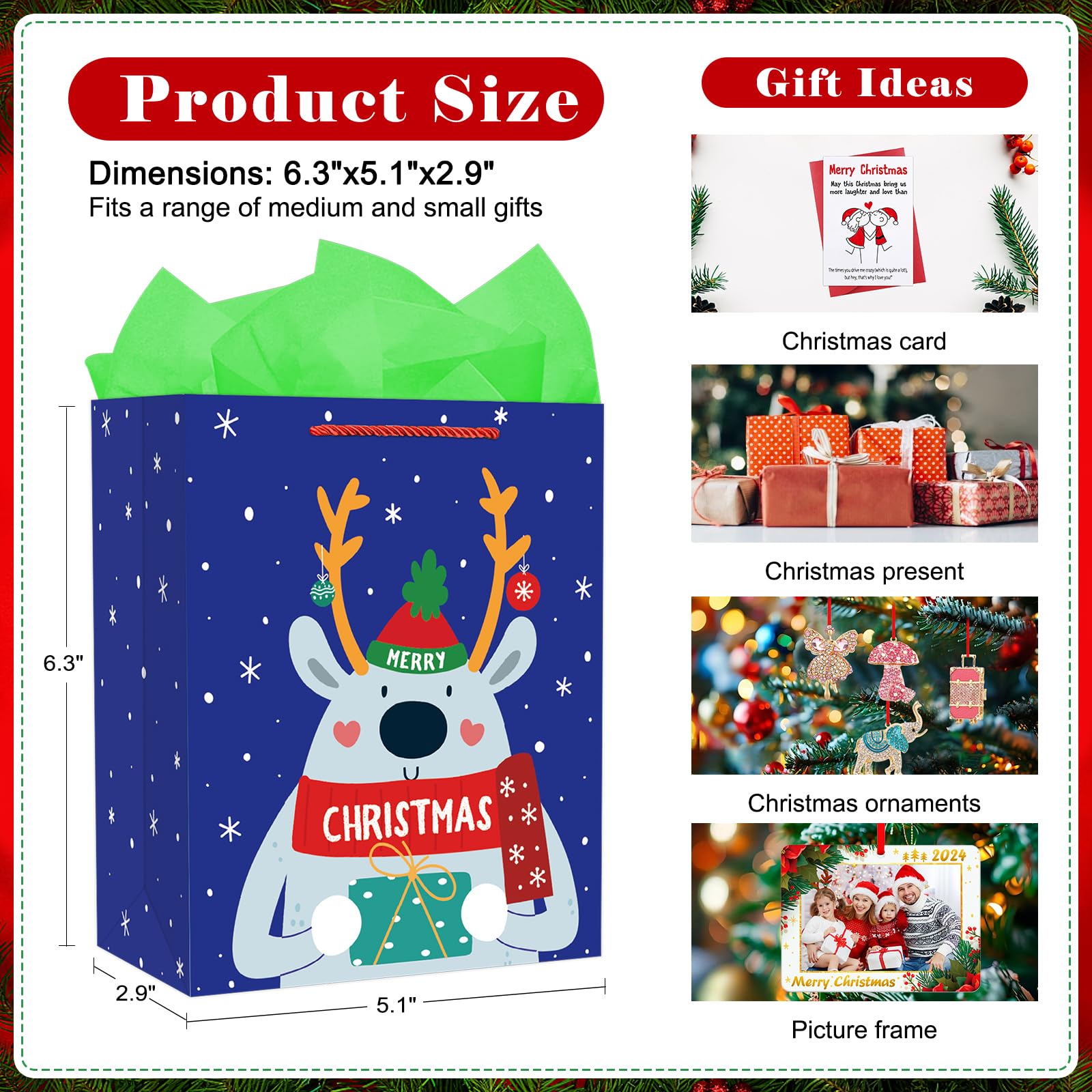 【Charming Design】: Featuring a charming design, our gift bag adds a festive touch to any holiday gift. Its elegant appearance makes it a great choice for wrapping up presents for loved ones.