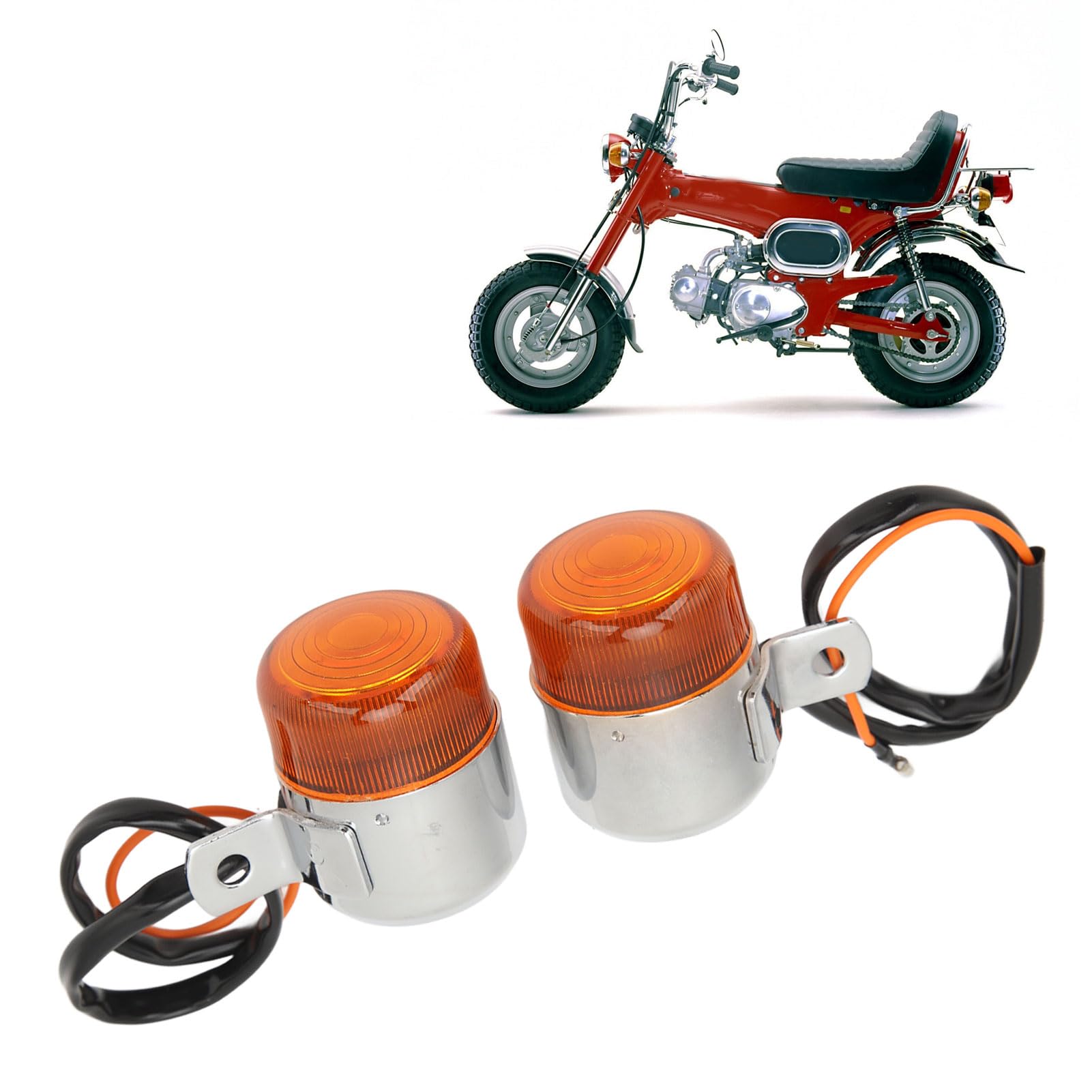 1. Applicable : Motorcycle turn light is fit for CF50 CF70 CT70 ST50 ST70, for Z50J?4L, and for Z50J1?4L. Please confirm whether your model is applicable before buying. 2. Driving: Lights will be emitted when you are driving to remind the car in front and behind to pay attention to safety. It can also be used as a safety alarm light on rainy days, making your driving safer and more secure. 3. Fashionable Appearance: Turn lamp indicators feature a simple design that adds to the overall aesthetics of your vehicle and greatly enhances the styling and appearance. 4. Rugged Construction: steel alloy chrome plated licence plate bracket and rugged red ABS light housing ensure high durability and stability for long lasting use. 5. Ideal Replacement: Fine craftsmanship, this is your ideal option and replacement for your original damaged and old turn blinker lamps, for you. Spec: Item Type: Turn Lamp Indicators Material: Steel alloy + ABS Voltage: 6V Fitment: For CF50 CF70 CT70 ST50 ST70 For Z50J-4L For Z50J1-4L Package List: 2 x Turn Lights
