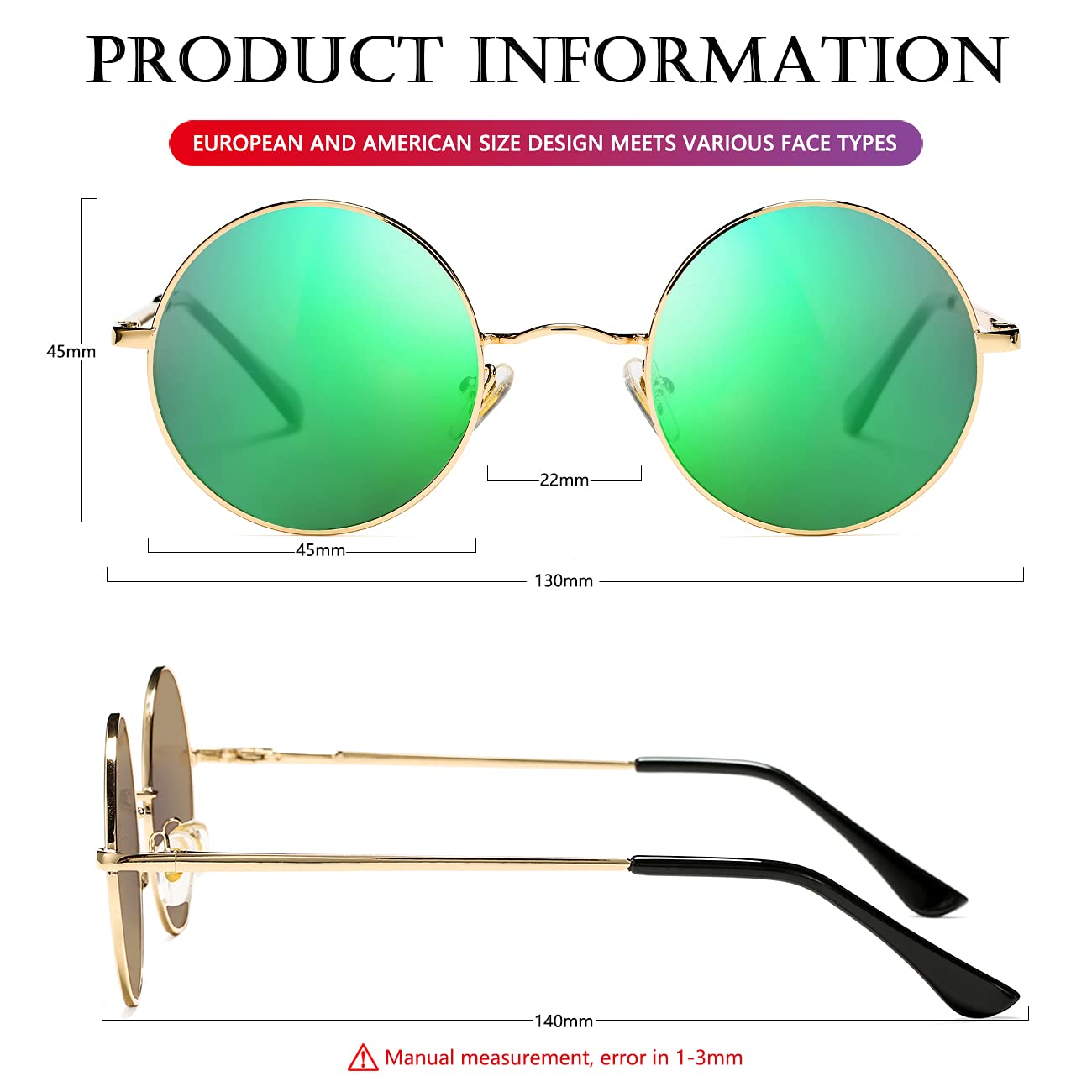 STAINLESS STEEL METAL MATERIAL ►This round sunglasses is made of ultra-pure stainless steel materials, so the frame is very thick, and very strong. The classic design makes men and women polarized sunglasses suitable for almost all face types, let you wear will feel very comfortable and there will be no pressure on your nose.