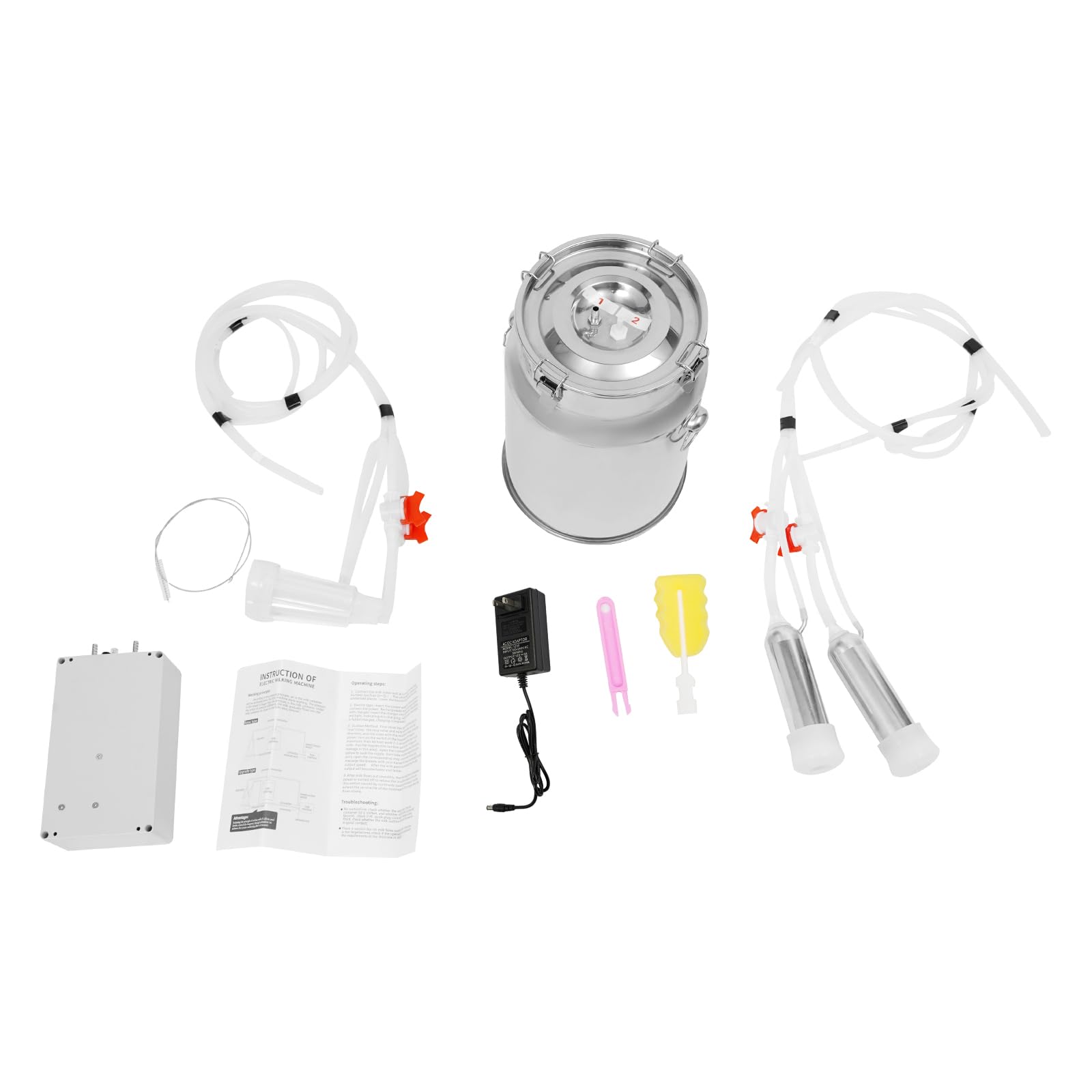Details Snap Fasteners: They can firmly hold the bucket lid and the milk bucket. Milk Bucket Brush and Milk Tube Brush: They make your cleaning more convenient. Application It is suitable for cows and goats and is appropriate for both household and farm use. How to Install 1. Check if the silicone ring on the inner side of the lid is displaced and tighten the four clips on both sides of the lid. 2. Connect the silicone tubes according to the numbers on the motor. 3. Connect the silicone tubes according to the numbers on the milk bucket lid. 4. After installation is complete, connect the power supply and it can be operated. 5. After the connection is completed, turn on the switch, put both pacifiers on the nipples simultaneously, and seal them well. Wait for 15 to 20 seconds, after the vacuum pump evacuates the air inside the milk can, you can start sucking milk normally. Specification Color: Silver Material: Aluminum Alloy, Stainless Steel, Silicone Process: Spray Painting, Injection Molding Style: Modern Applicable Animals: Cows, Goats Plug Standard: US Standard Input: AC 100-240V, 50/60Hz Output: 12V, 3A Motor Power: 12W Battery Capacity: 5200mAh Milking Machine Flow Rate: 15L/3.96 Gal/ min Vacuum Pressure: 35-45 kPa Pulsation Period: 43-46 times/min Motor Size: 20*12*7.5cm/7.87*4.72*2.95in Goat Milk Lining(D*H): 6*17cm/2.36*6.69in Cow Milk Lining(D*H): 6*17.5cm/2.36*6.89 in Milk Bucket Size(D*H): 23*23cm/9.06*9.06 in Milk Bucket Capacity: 10L/ 2.64 Gal Hose Length: About 140cm/55.12 in Power Adapter Cable Length: About 90cm/35.43 in Package Size: 37*24*23 cm/14.57*9.45*9.06 in Gross Weight: 3.5 kg/7.72 lbs Net Weight: 3.33 kg/7.34 lbs Package Included 1* Motor 1* Stainless Steel Milk Bucket 2 Set* Milk Linings with Hoses 1* Power Adapter 1* Milk Bucket Brush 1* Milk Tube Brush 1*English Manual