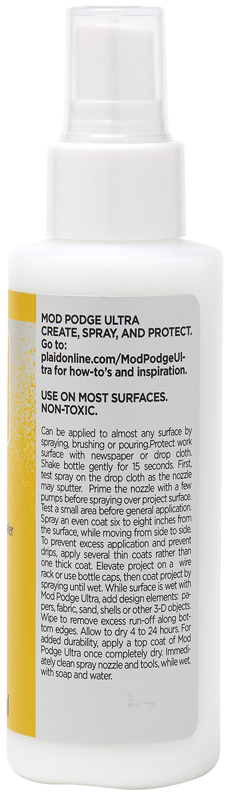 Mod Podge Ultra is a super-strong, spray formula that works as an all-in-one glue and sealer with a high adhesion level. Mod Podge Ultra is a part of the Mod Podge family of brands but is different compared to any other Mod Podge formula. Though this is a thinner formula, it has the same strong durability as Mod Podge. This versatile water-based, non-toxic decoupage formula comes in a gloss and matte finish that naturally self-levels, and leaves no brush marks. Use this spray decoupage glue to apply decorative and 3D elements to your projects. You can spray, pour, or brush on this unique formula of Mod Podge. Before using Mod Podge Ultra shake the bottle well. Prime the nozzle with a few pumps and spray away from your project to test the spray strength, as the nozzle may sputter. To prevent excess application and drips, apply thin coats rather than one thick coat to your project. For best results elevate your project off of your work surface so Ultra can flow over the edge. While your surface is wet with Mod Podge Ultra, feel free to add any design elements. Allow your project to dry for 4 to 24 hours. Immediately clean the Mod Podge Ultra spray nozzle after each use so that it remains open and clog-free for future use.