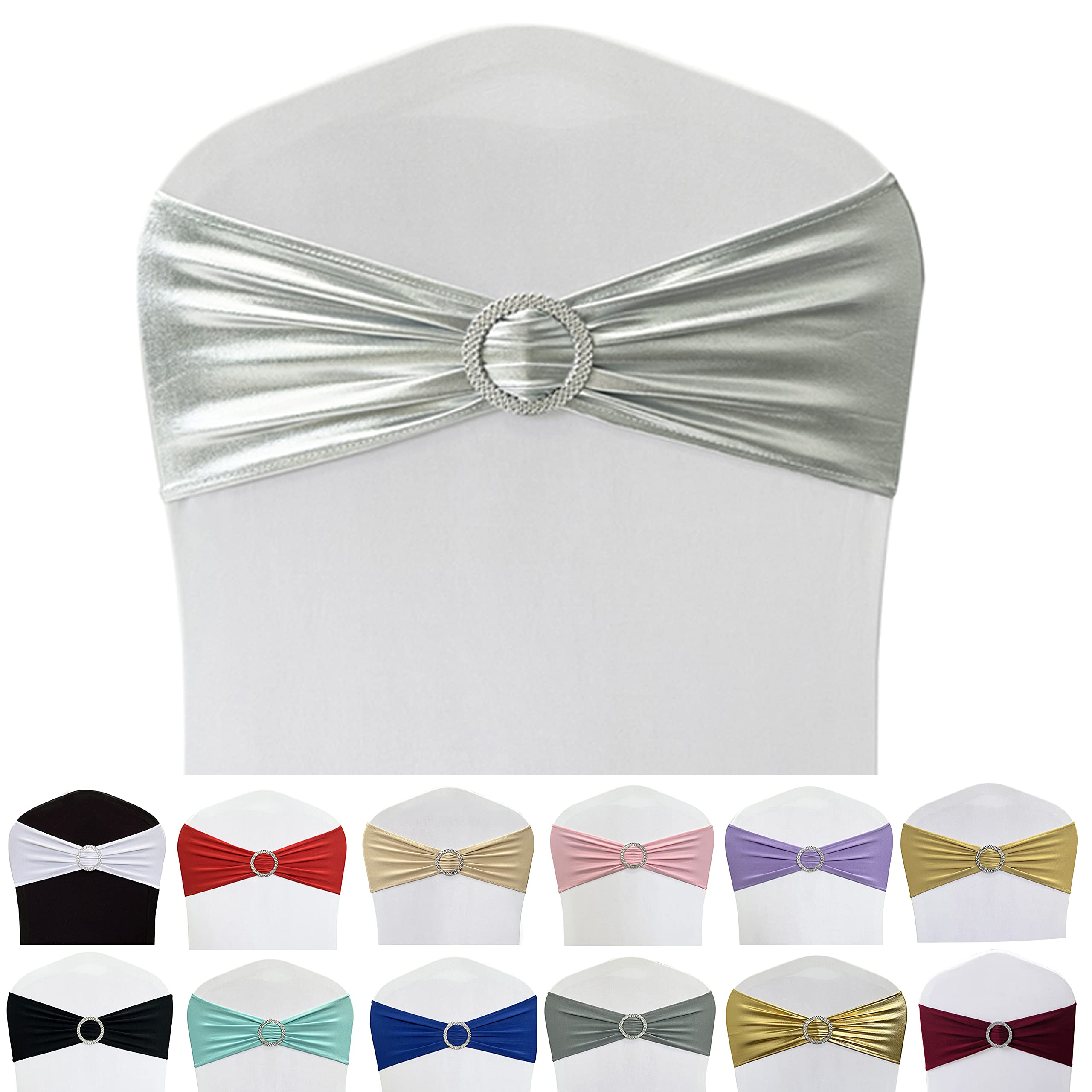 Spandex Chair Sashes Bands-Maiangel 50PCS Stretch Chair Ties Bows With Buckle Slider For Wedding Party Banquet Decoration(Metallic Silver )