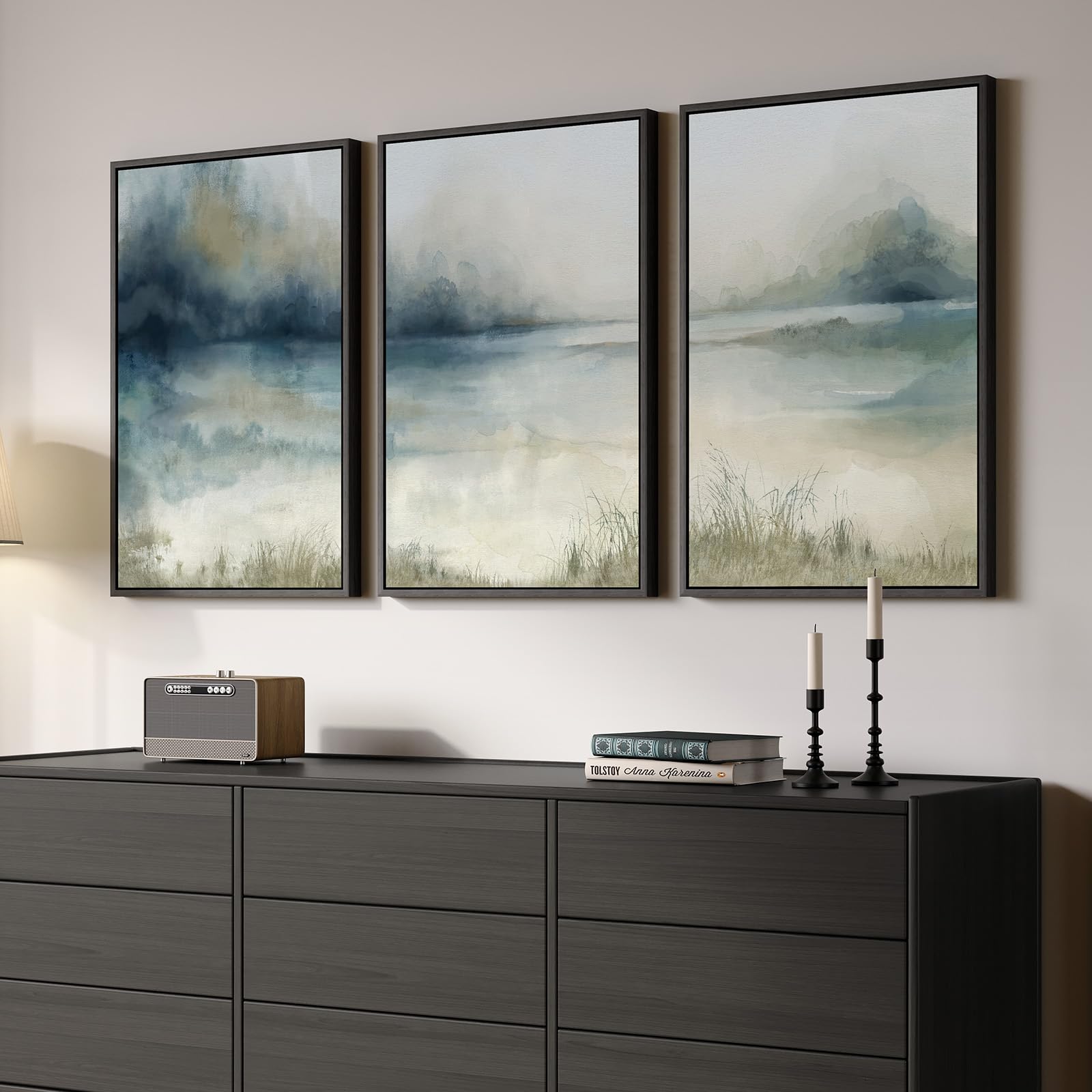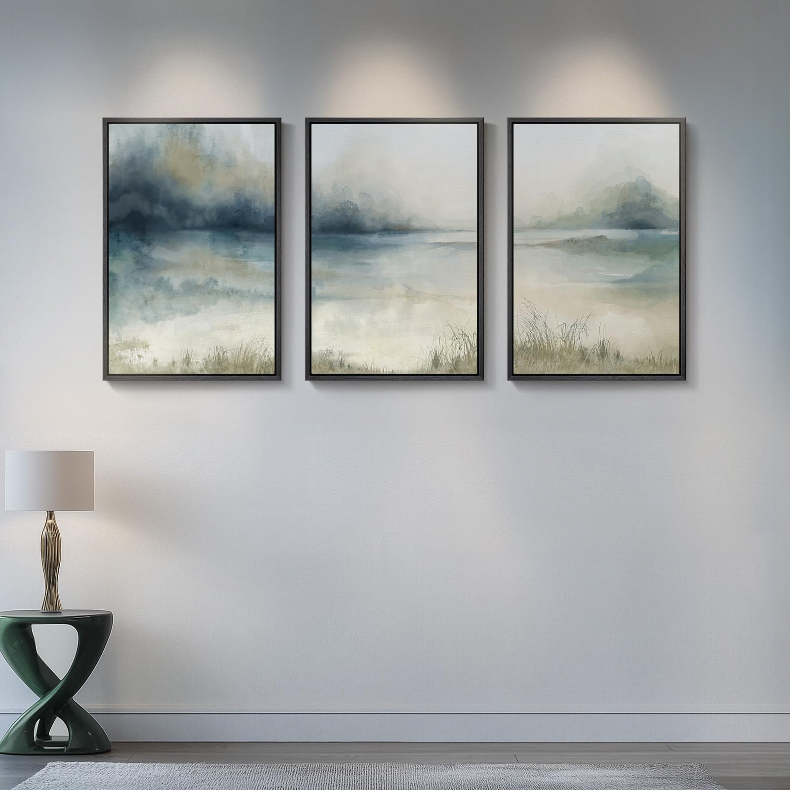 [Abstract Landscape Wall Art]: This 3-piece decorative wall art set features a serene, abstract landscape design inspired by misty lake and distant mountain. Soft watercolor blends of blue, grey, and beige create a calm, airy, and sophisticated atmosphere. The tranquil color palette is timeless and versatile, making it a perfect fit for the living room, bedroom, dining room, lounge, hallway, office, or any space that could use a touch of modern elegance