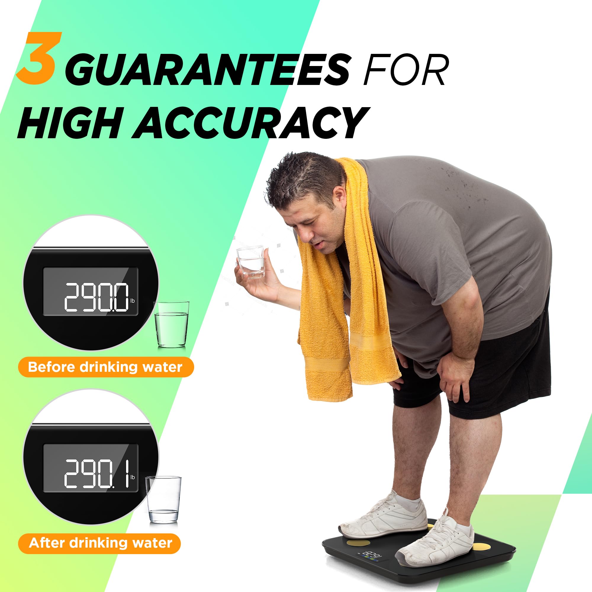 3 Guarantees for High Accuracy: This ultra-precision body fat scale, adopting the advanced BIA technology, is equipped with 4 high sensitive electrodes and 4 high precision G-shape sensors that have passed 100,000 times sensor performance tests to enhance accuracy.The scale ensures accurate measurement results to within 0.2lb/100g and has a maximum weight capacity of 400lb/180kg