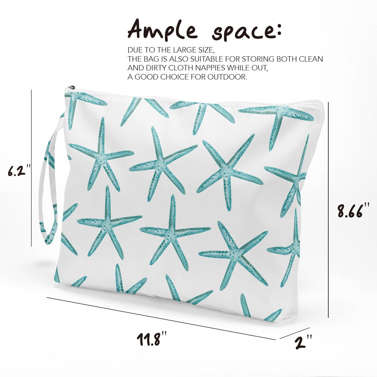 Ample space: the size of the bag is approximately 11.8 x 8.66 x 2 inches. It is designed with zipper, easy to open and close. Comes with a handle, you can hang the bag on the door knobs, towel rod, anywhere you want. Due to the large size, the bag is also suitable for different kinds of cosmetics and other stuff, a good choice for indoor outdoor.