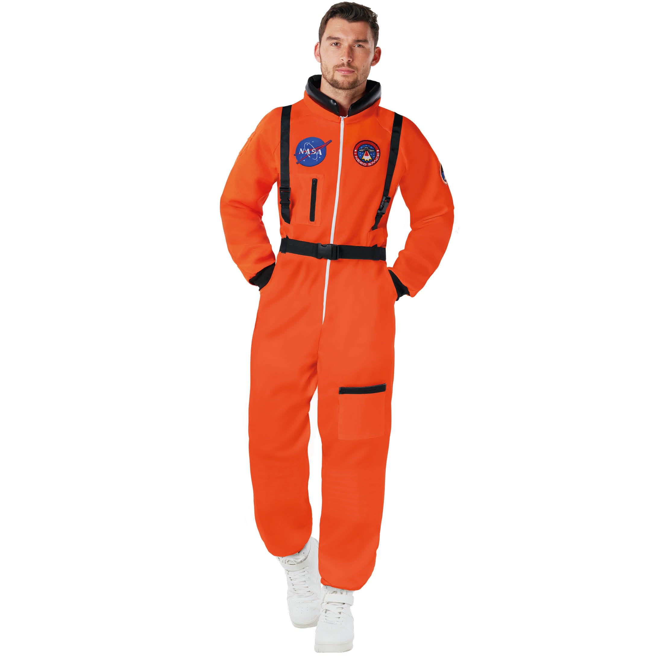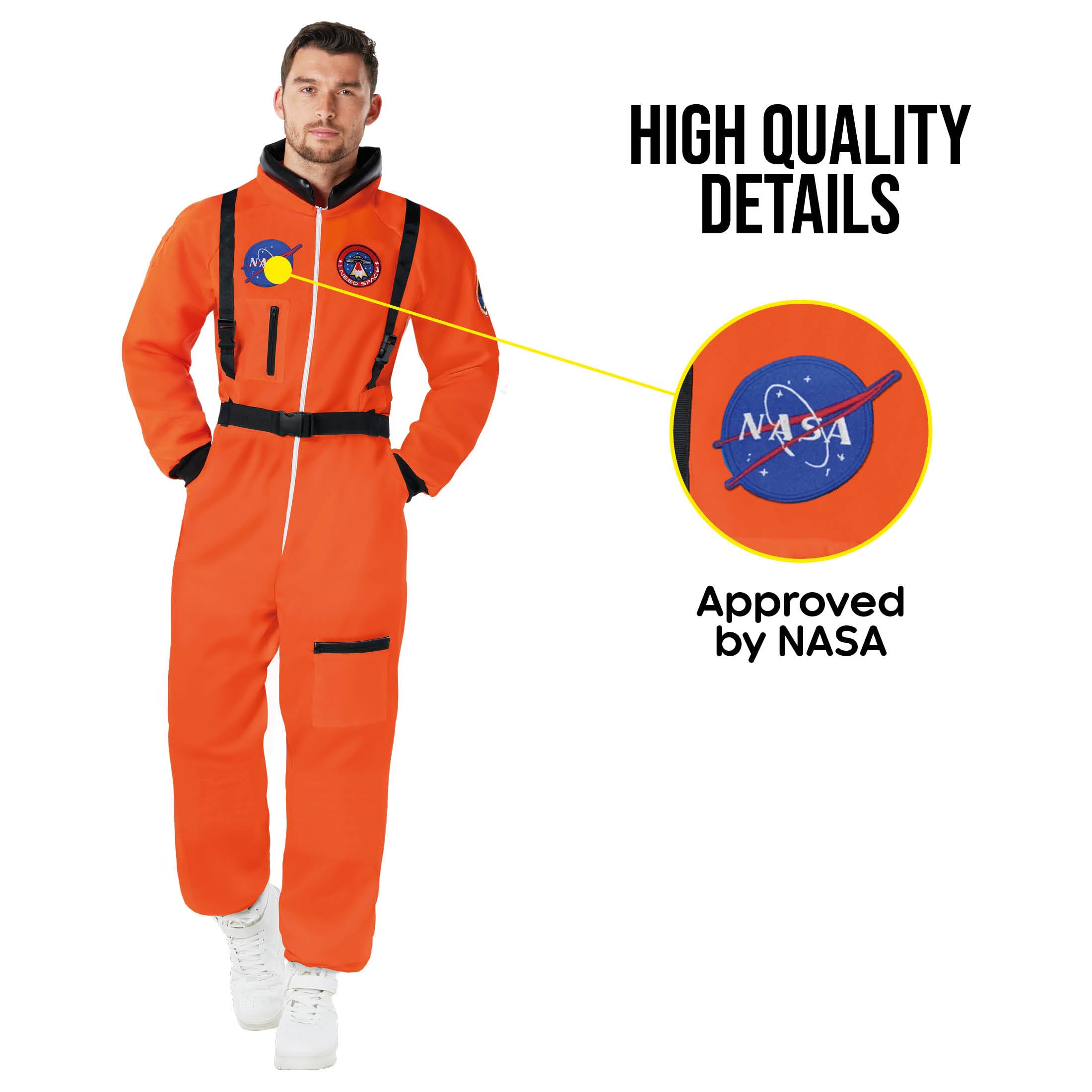 Complete astronaut look: Includes a vibrant orange all-in-one space suit jumpsuit featuring authentic NASA-style embroidered badges, front zip closure, and adjustable buckled belts for a realistic finish.