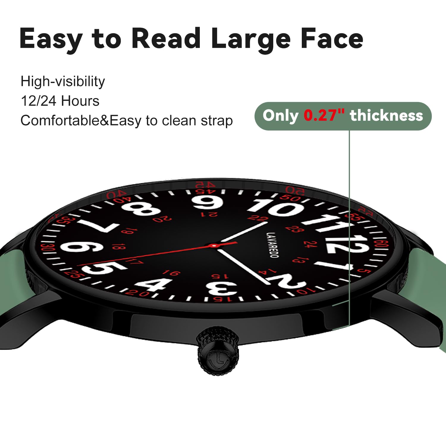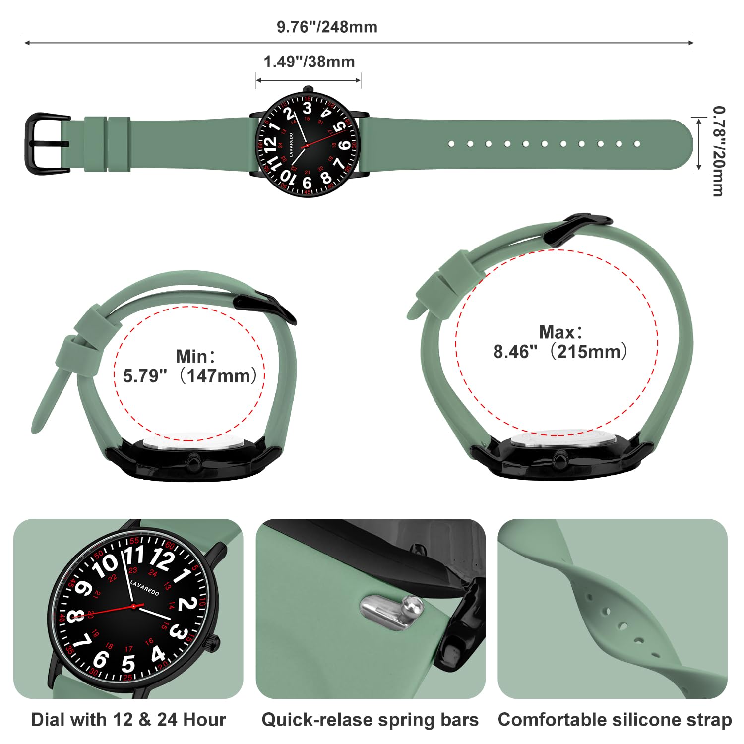 EasyRead & Military Time:Easy-to-read dial with 12/24 hour,luminescent numbers and MINUTE/HOUR hand for night-time visibility.The soft silicone strap is extremely comfortable to wear and the lightweight size is perfect for use at work
