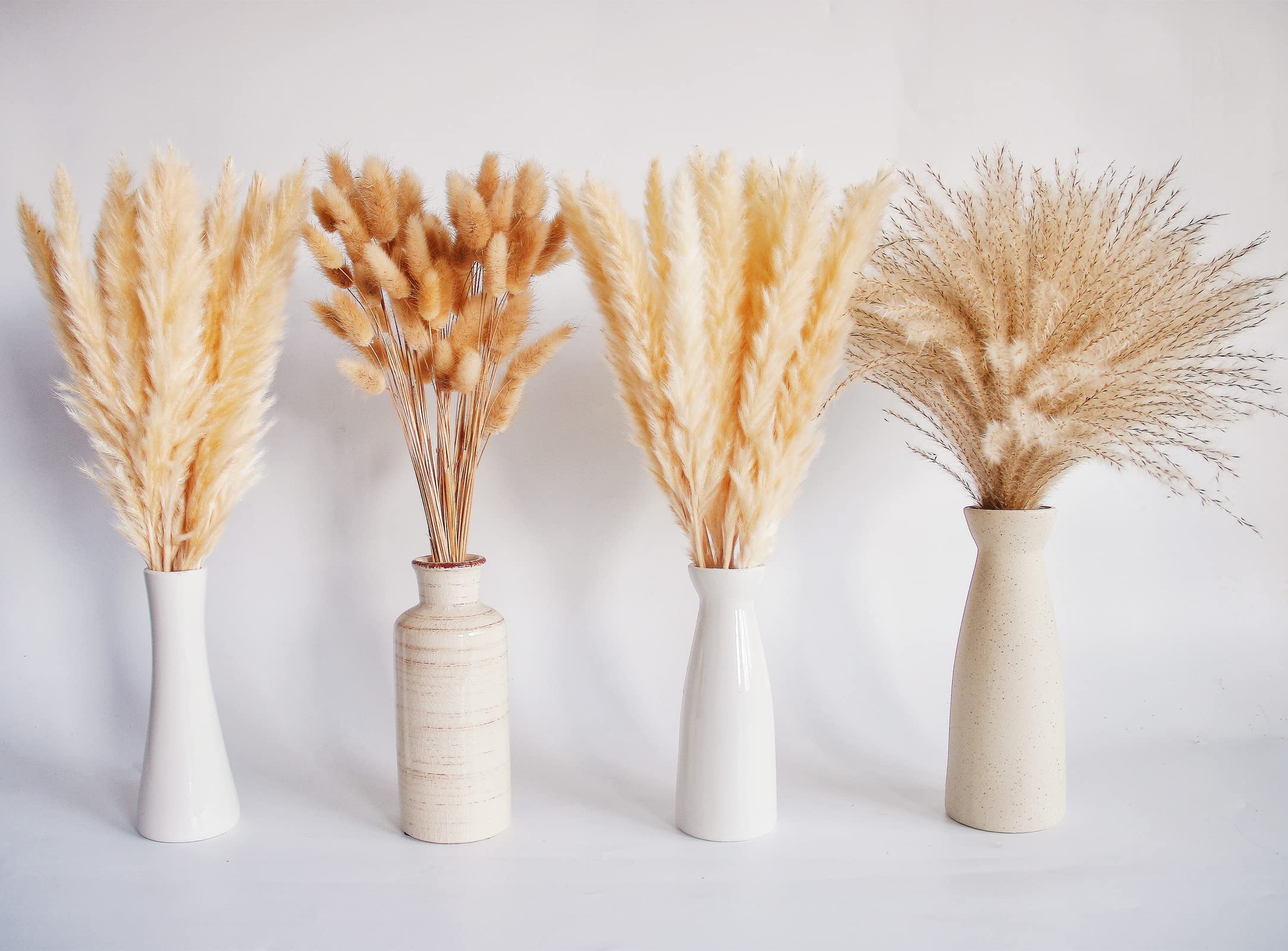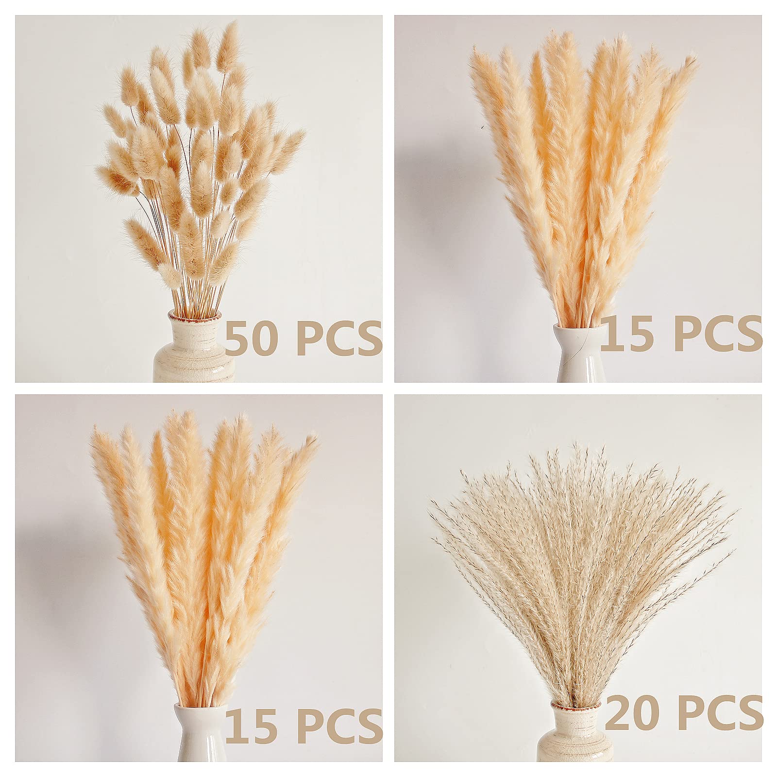 e have carefully selected a sufficient number of 100 pieces of pompuss grass, with 50 pieces of bunny tails dried flowers, 20 pieces of dried grass, 30 pieces of white pampas grass, These pampas grass decor are natural and charming in color, fluffy and smooth in feel, warm and elegant, perfect for fall pampa The decorative flowers are 14-17 inches in height and fit into small to medium-sized vases, open the package and insert it into the vase and you get an ample amount of natural driedpampas grass decor. pampas grass bouquet are very easy to care for, and after 2-3 hours of drying in the sun, the pampas decor will be fluffier, smoother, softer, and full of the scent of fall, and with no watering or maintenance, the dried bunny tailswers will not dry out and can be stored longer! Dried pampas grass have a warm color palette and fit almost anywhere, this boho flowers is suitable for boho table wedding decor centers parties living rooms bedrooms kitchens vintage country farmhouses etc This is a special gift that you can treat yourself or your family friends and colleagues with this decorative flowers. Great for birthdays, wedding anniversaries, Halloween, Thanksgiving, Christmas, etc. By the way: the composition of natural dried pampas grass decor is natural plant, there will be a small amount of pieces falling off when you just take out the grass decor will not affect the final appearance of the bouquet, after gently shaking, the dried flowers will not fall off again, keep the dried flowers away from fire and moisture, they can be stored for a longer time. Thank you for your order, if you have any ideas please post your comments and we will provide you with friendly service