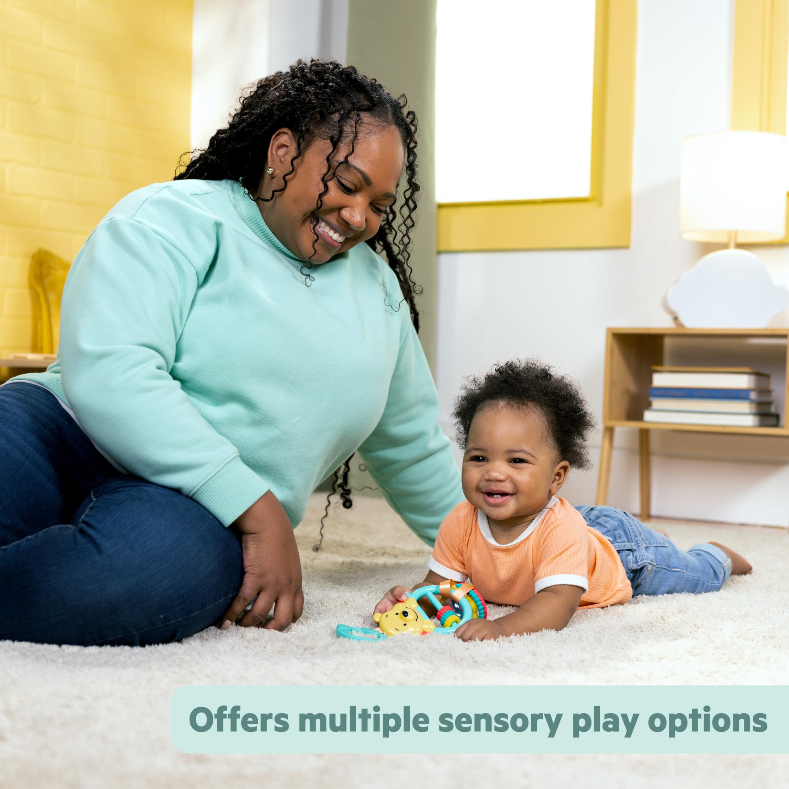 Spin and slide the colorful beads for fine motor skill development, shake the rattle for auditory stimulation, and feel the textured rings for tactile stimulation