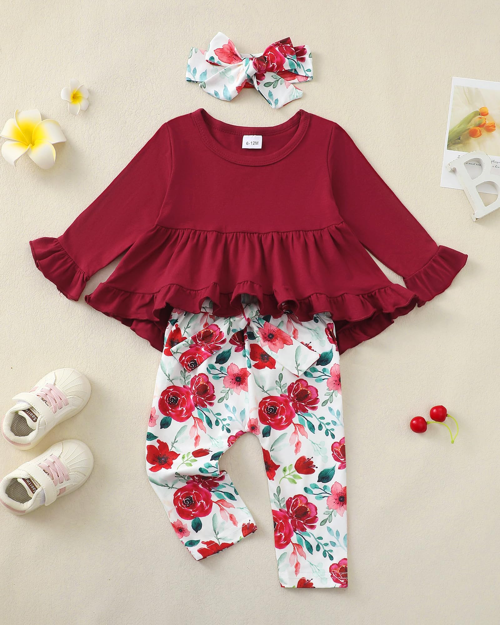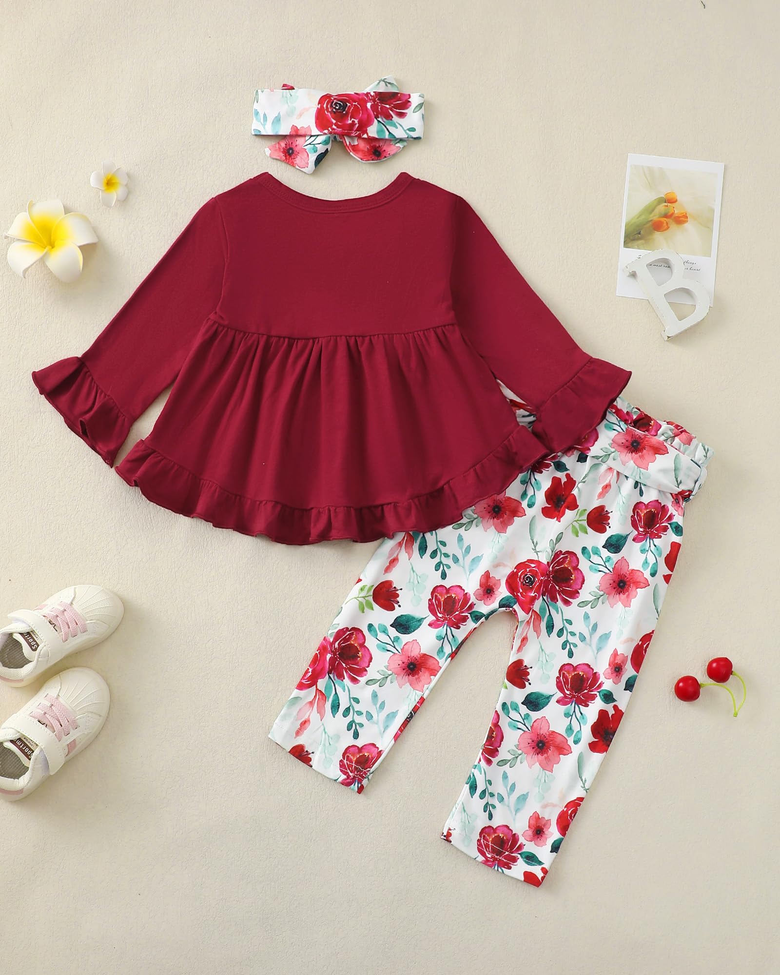 3 Pieces Toddler Little Girl Outift for Fall Winter: 1pc baby girl shirt + 1pc baby girl pants + 1pc untied headband