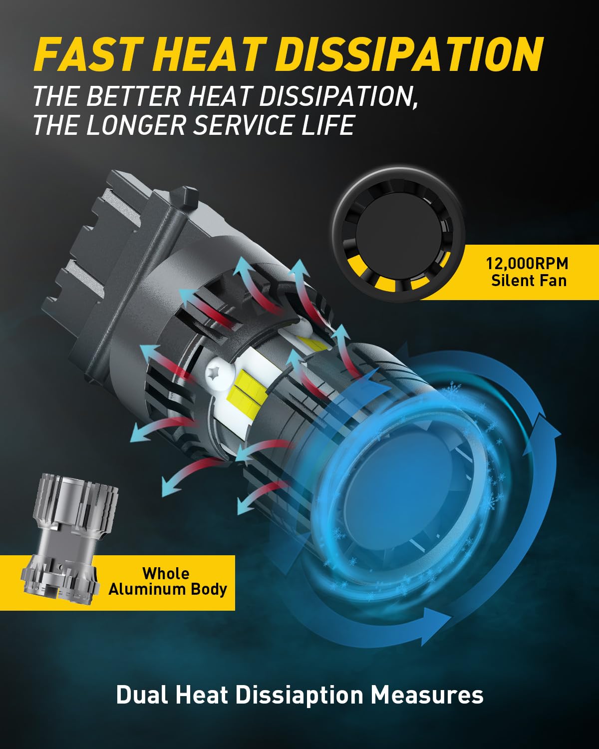50,000 Hours Lifespan: Whole aviation aluminum body and 12,000RPM turbo cool fan that diverts heat away from the light's critical components, our 3156 led bulbs offer 50000hr lifetime, reducing the need for frequent replacements.