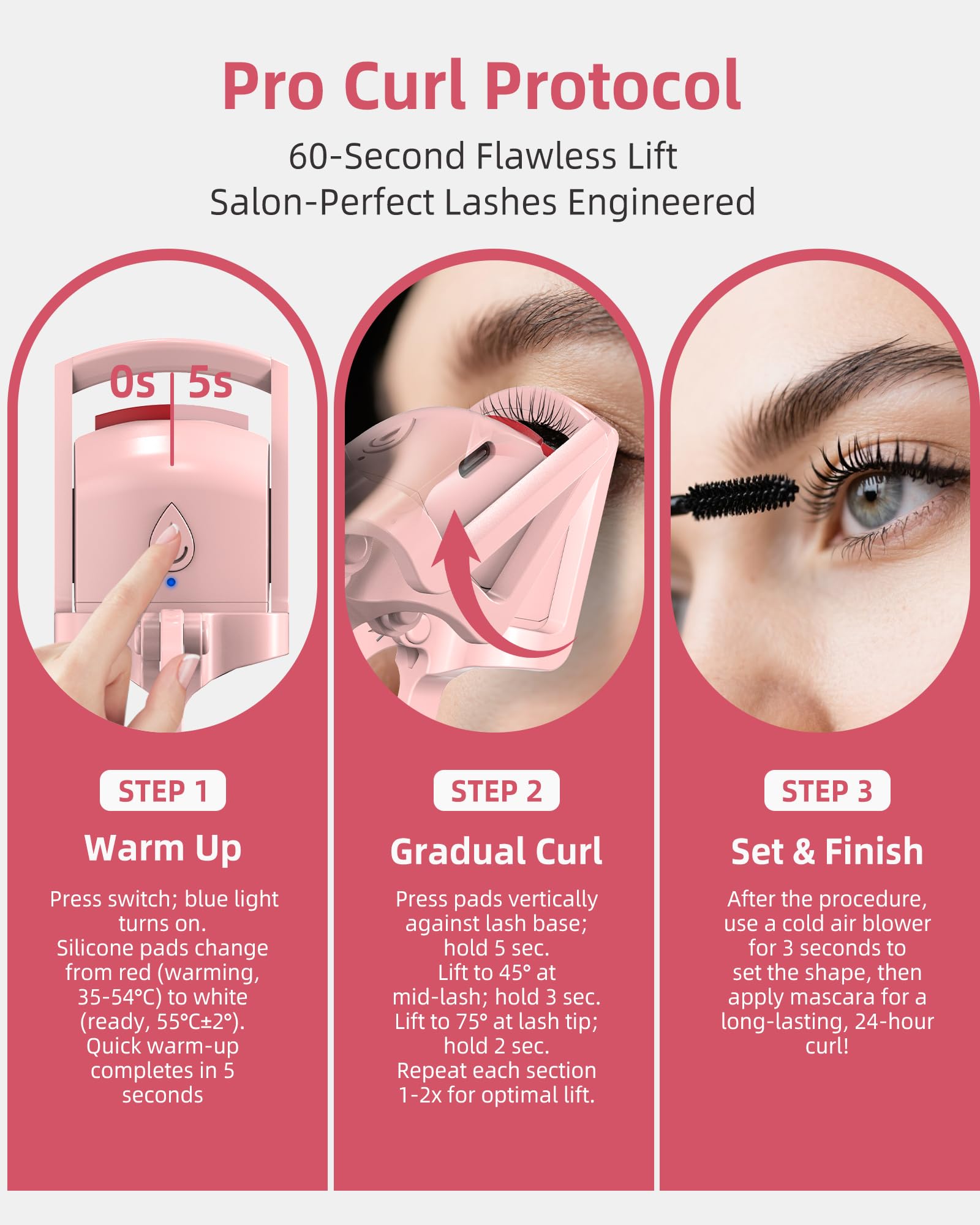 STEP 3: Set & Finish After the procedure, use a cold air blower for 3 seconds to set the shape, then apply mascara for a long-lasting, 24-hour curl!