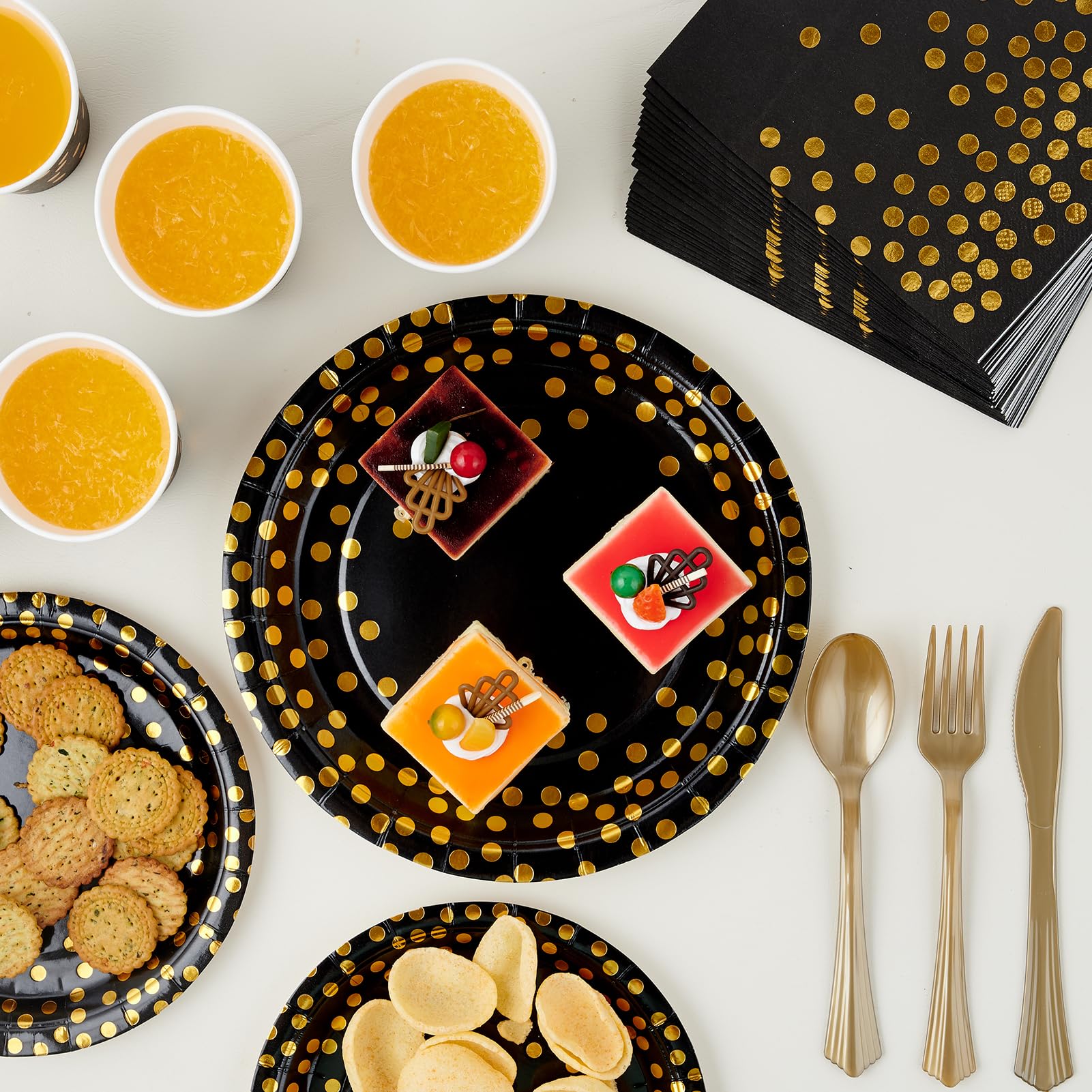 🎄🎄EXQUISITE AND ELEGANT DESIGN - Designed with a black background and gold foil dot pattern, disposable plates set really adds dimension to your parties. Gold plastic forks knives spoons adding an elegant, modern touch to any party. Black and gold are perfect for Halloween themed parties