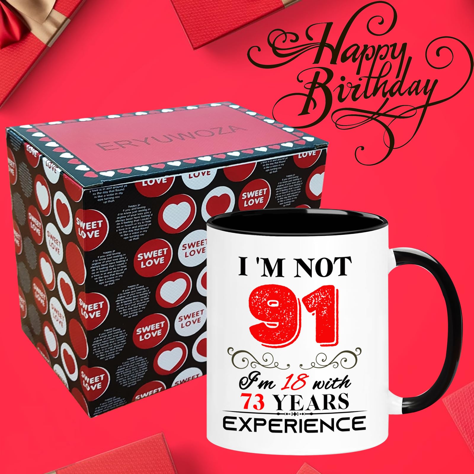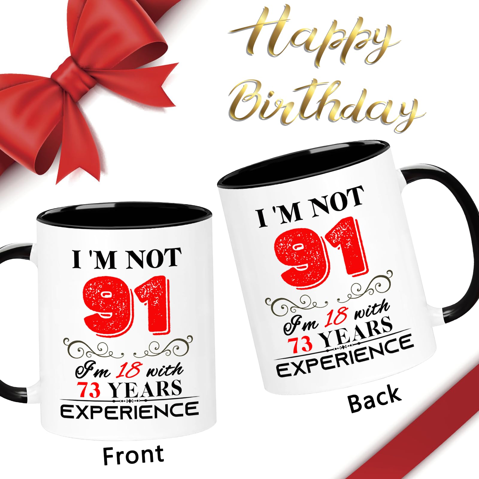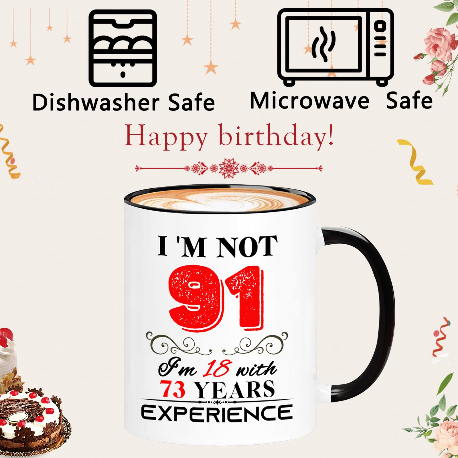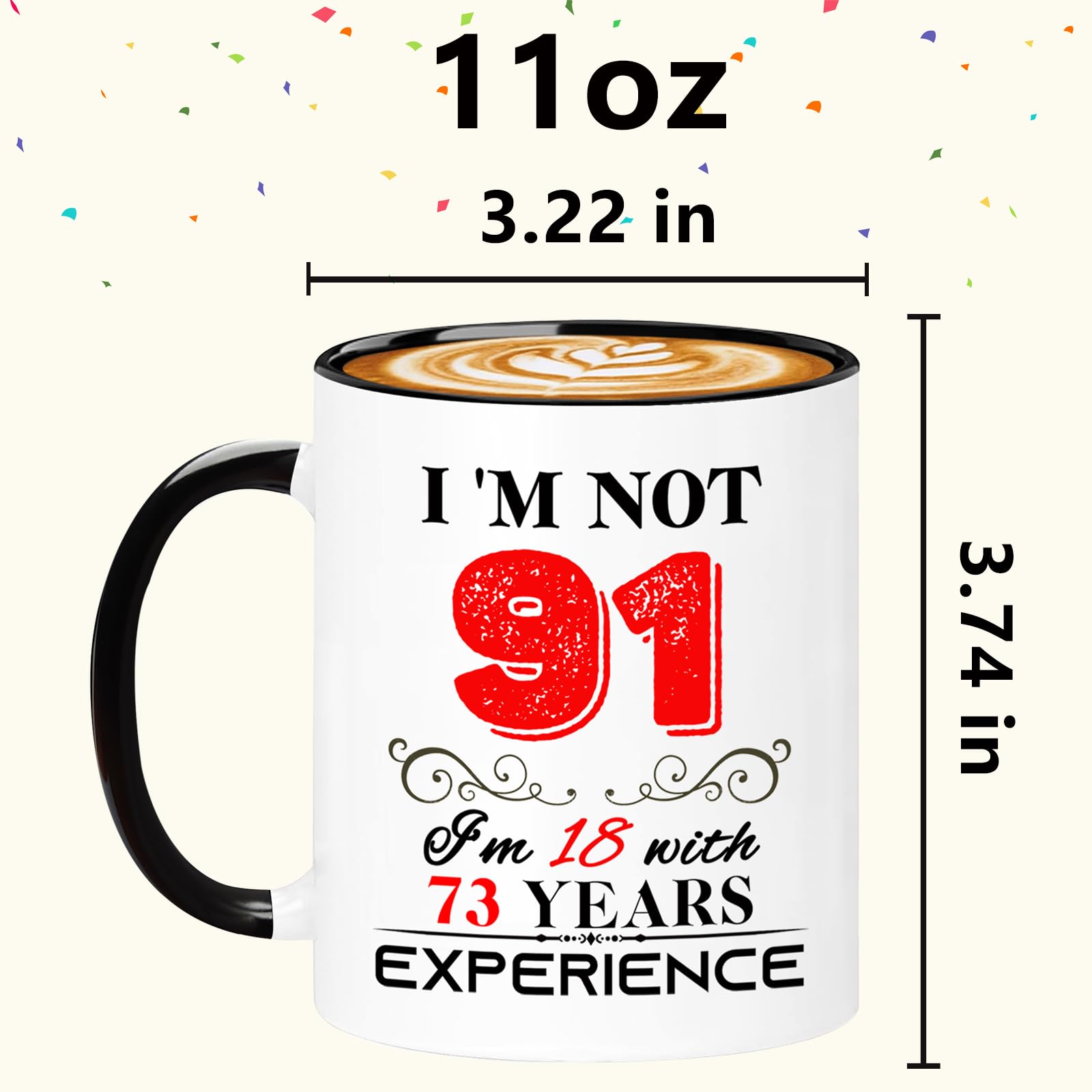 【Birthday Gift】: This funny "I'm not 91, I'm 18 with 73 years experience" Mug is the perfect birthday gift for a 91 year women men! Give it to your mom, dad, papa, mama, grandma, grandpa, brother, sister, husband, wife, aunt, uncle, cousin, son, daughter, boyfriend, girlfriend, boss, coworkers, bestie, granddaughter, or your best friend for her he birthday.