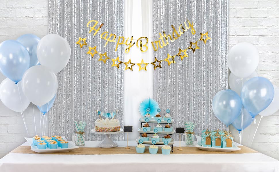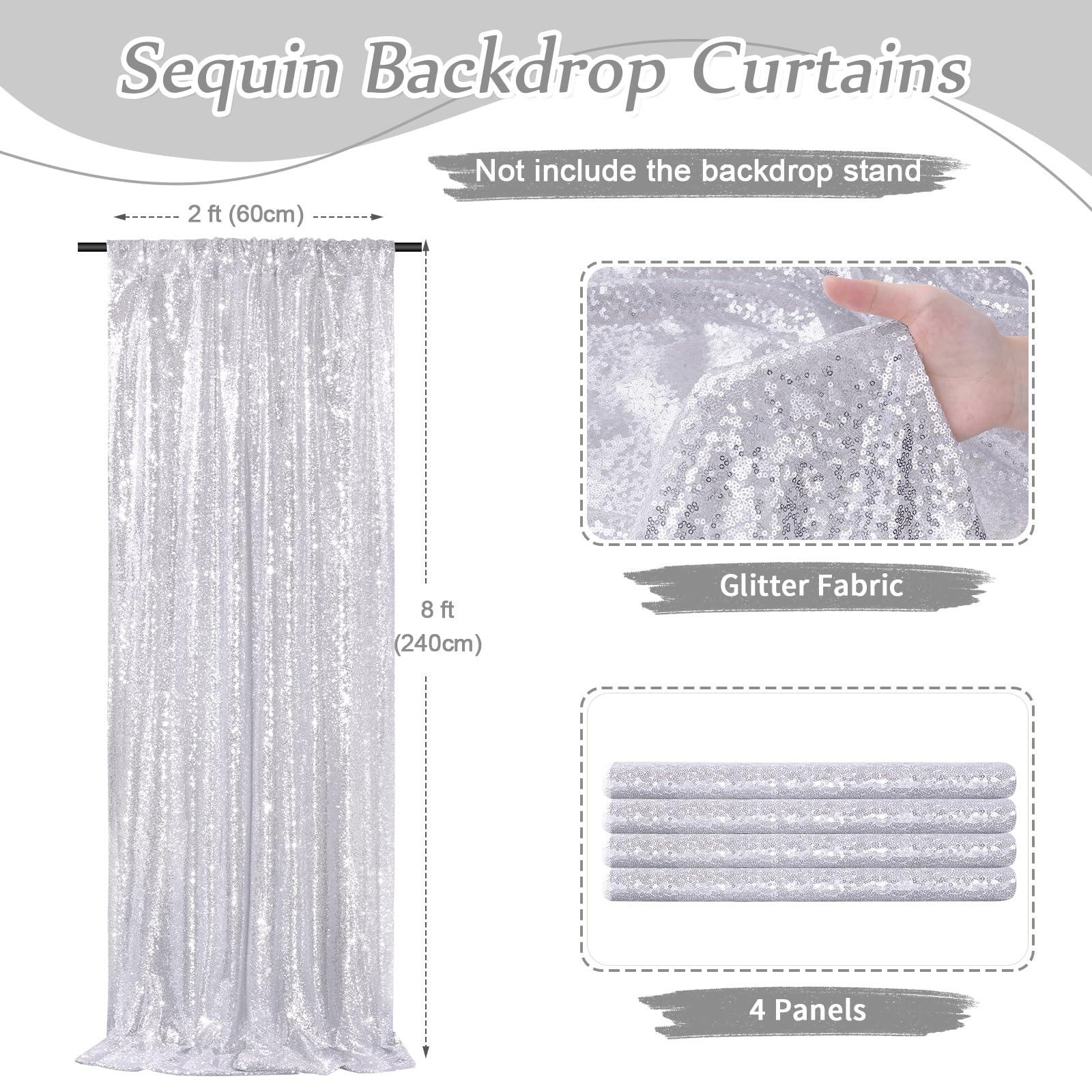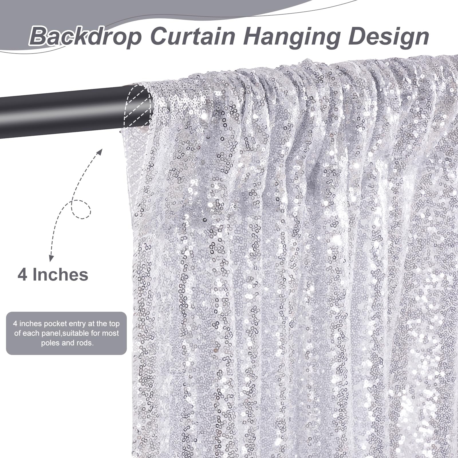 Sequin Backdrop Curtains: Package contains 4Pcs 2ft width by 8ft height backdrop curtains. With a 4-inch rod pocket on the top for easy to be hung on most backdrop stands or curtain rods, and all sides over locked with folded and hemmed edges to ensure the stability during hanging.