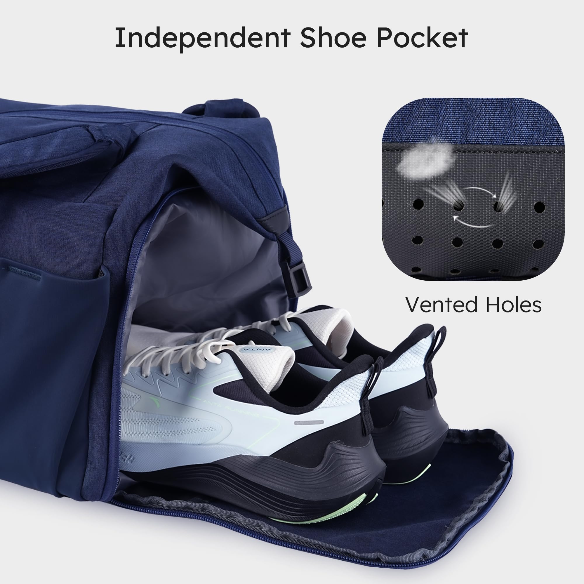 Separate Shoe Compartment: The sports duffle bag comes with a dedicated shoe compartment keep your shoes separate from your clean clothes or other items. When not in use, the shoe compartment can be folded and secured with the attached Velcro. Vented holes provide ventilation and breathability to help keep the interior dry and fresh, preventing any odor or dirt from spreading.