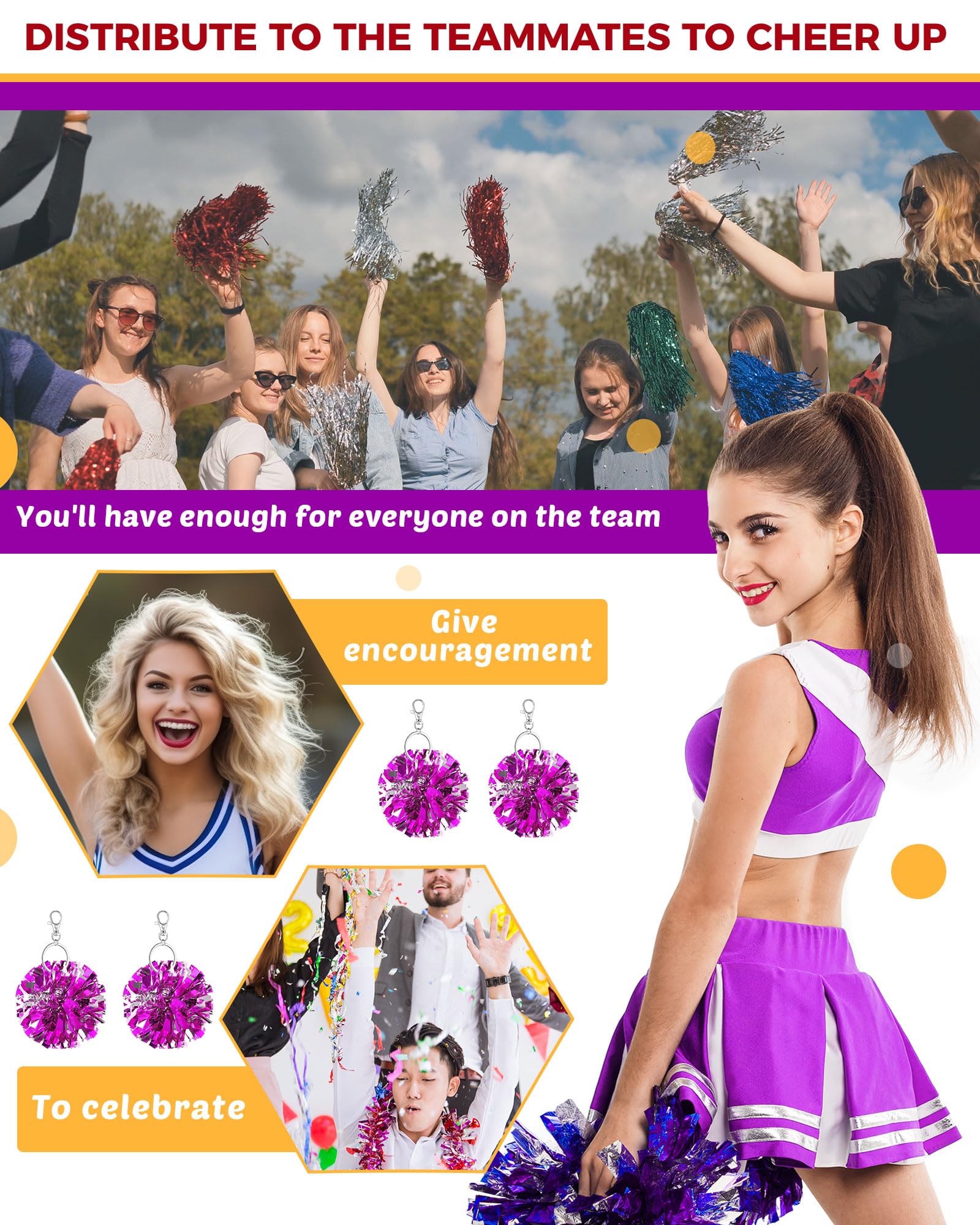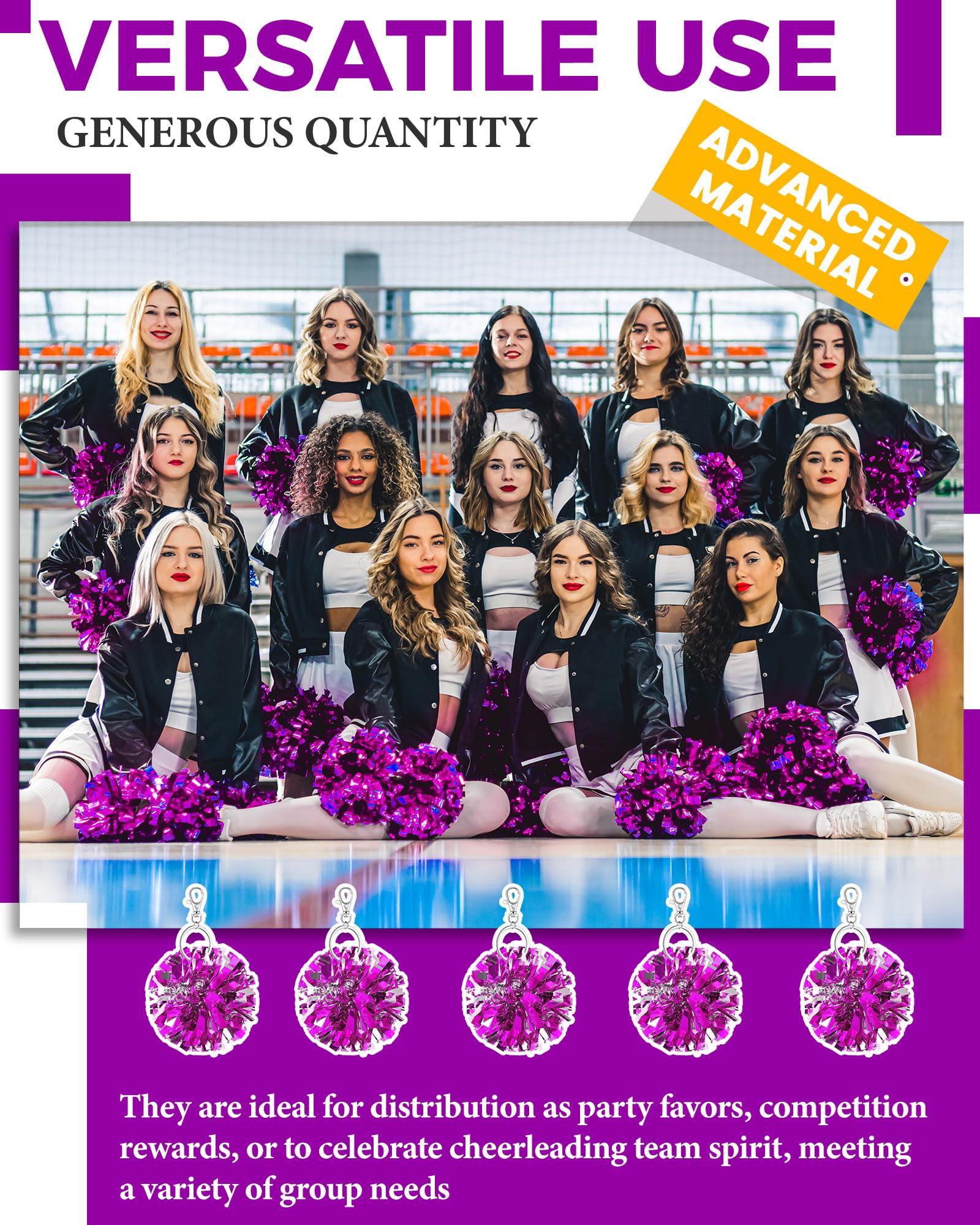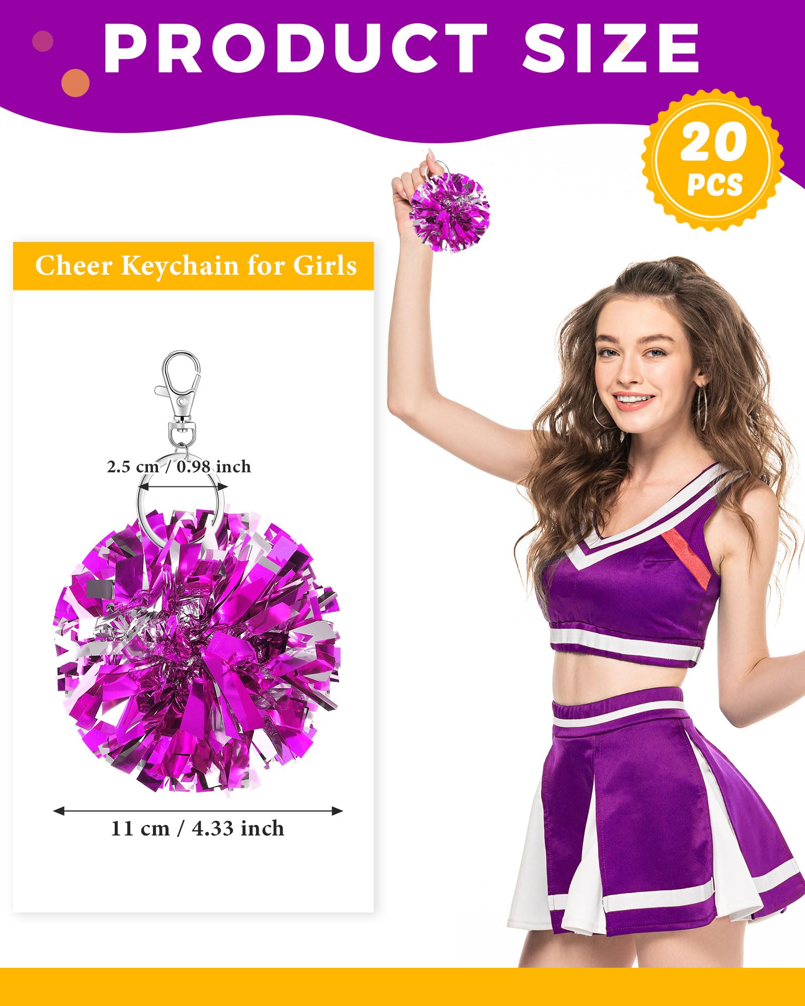 Generous Quantity and Versatile Use: this package includes 20 pieces of cheer pom pom keychains; These are not just ideal for adorning your keys but can dress up your bag, purse, or backpack; They are ideal for distribution as party favors, competition rewards, or to celebrate cheerleading team spirit, meeting a variety of group needs