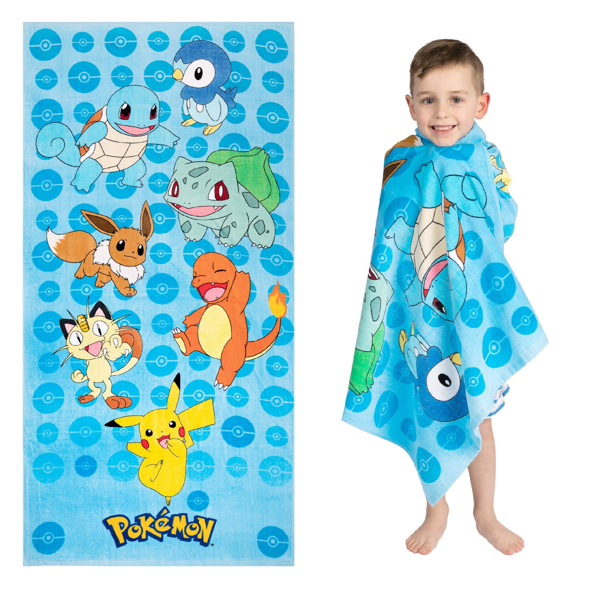 POKEMON DESIGN: Your little Pokemon trainers will love this cool and colorful beach towel. Featuring a power group of popular Pokemon that includes, Pikachu, Squirtle, Charmander, Bulbasaur, Meowth, Eevee and Pinlup this towel is sure to be a hit with kids who gotta catch them all.