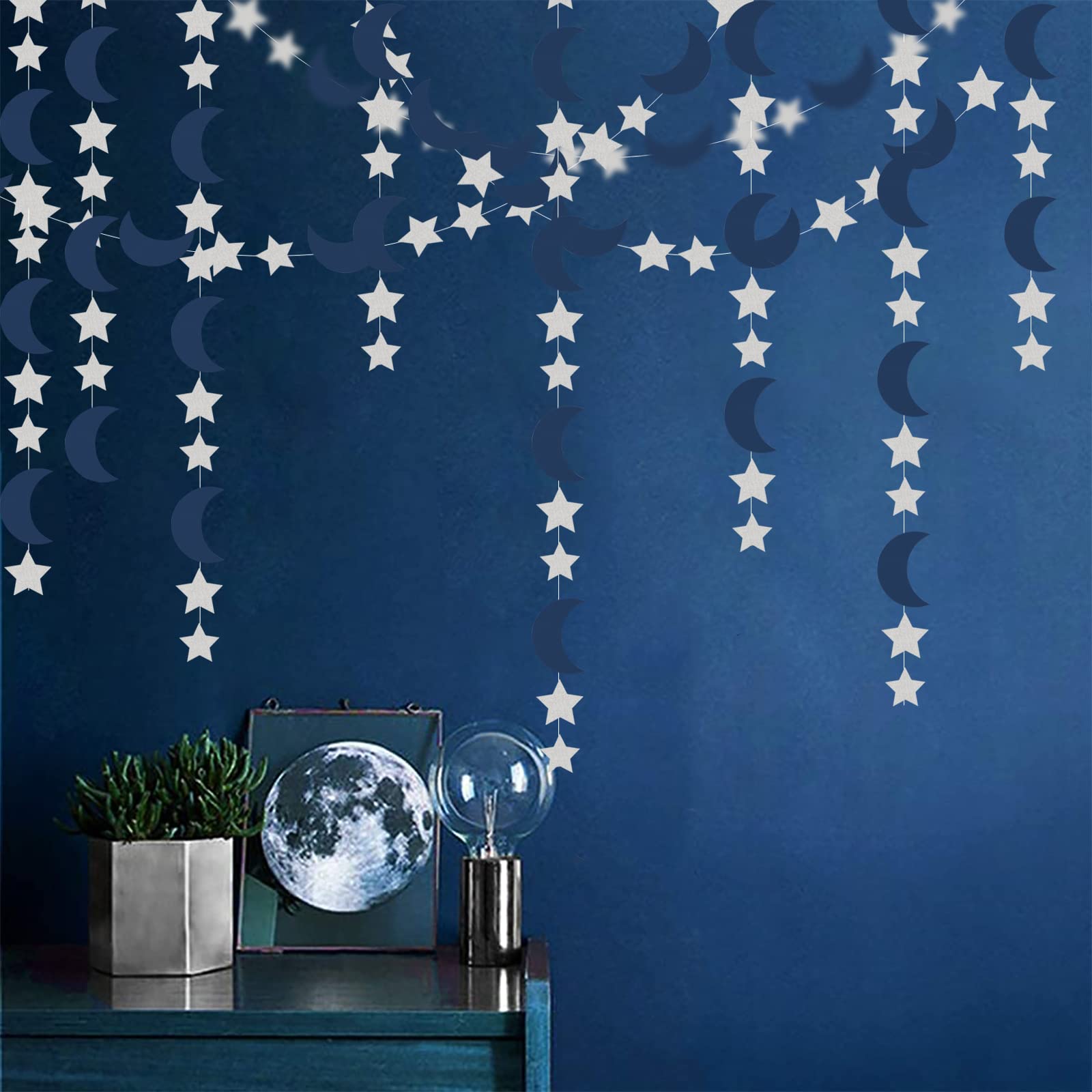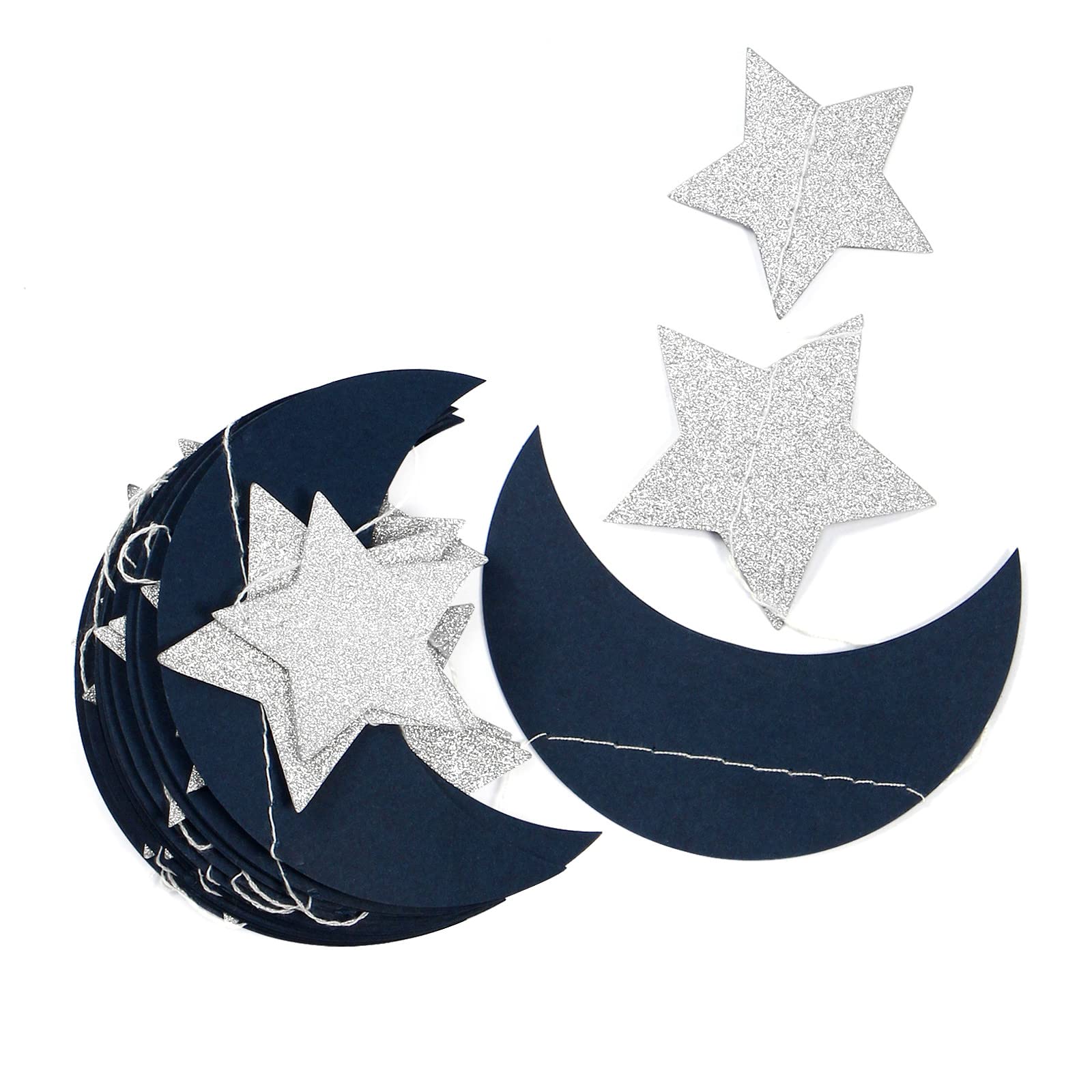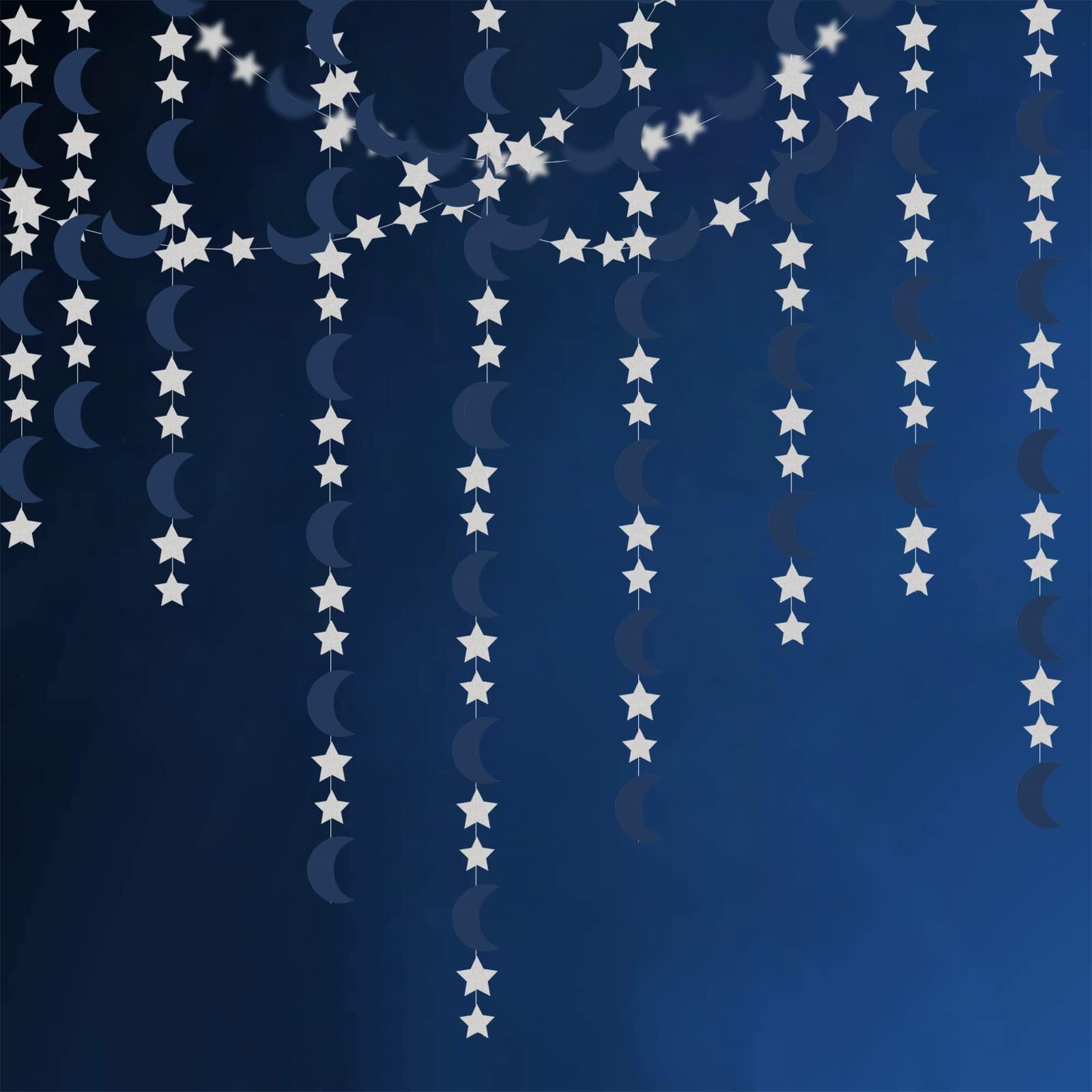 【Package Contains】4 sets of the party banner garland,each is 13 feet/ 4 meters long, total length is 52 feet/ 12 meters.Every Banner has 40pcs moon and star. 【Material】The material is eco-friendly navy blue and double side gittler silver which don't drop glitter.You can cut to any length you want if you need shorter length. 【 Easy to hanging 】Just open the package to hang it directly no need to diy again.Because they have been sewn together, which is really convenient for you. 【Using Occasion】They are perfect for eid decoration,ramadan mubarak decor,bridal shower,weddings,anniversaries,birthday,royal blue party twinkle twinkle little star decorations,eid mubarak decor. 【Quality Guarantee】If you ever have any concern with our paper garlands,just contact us and we"ll make it right!
