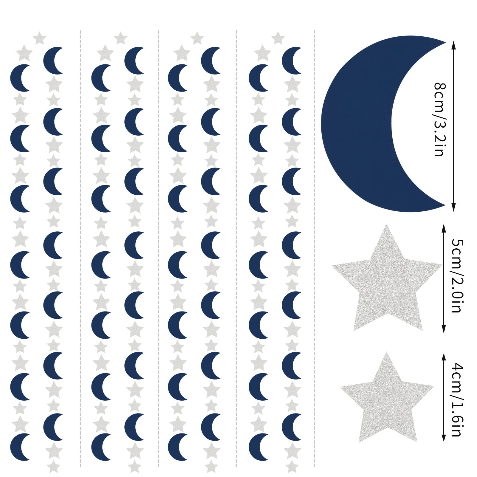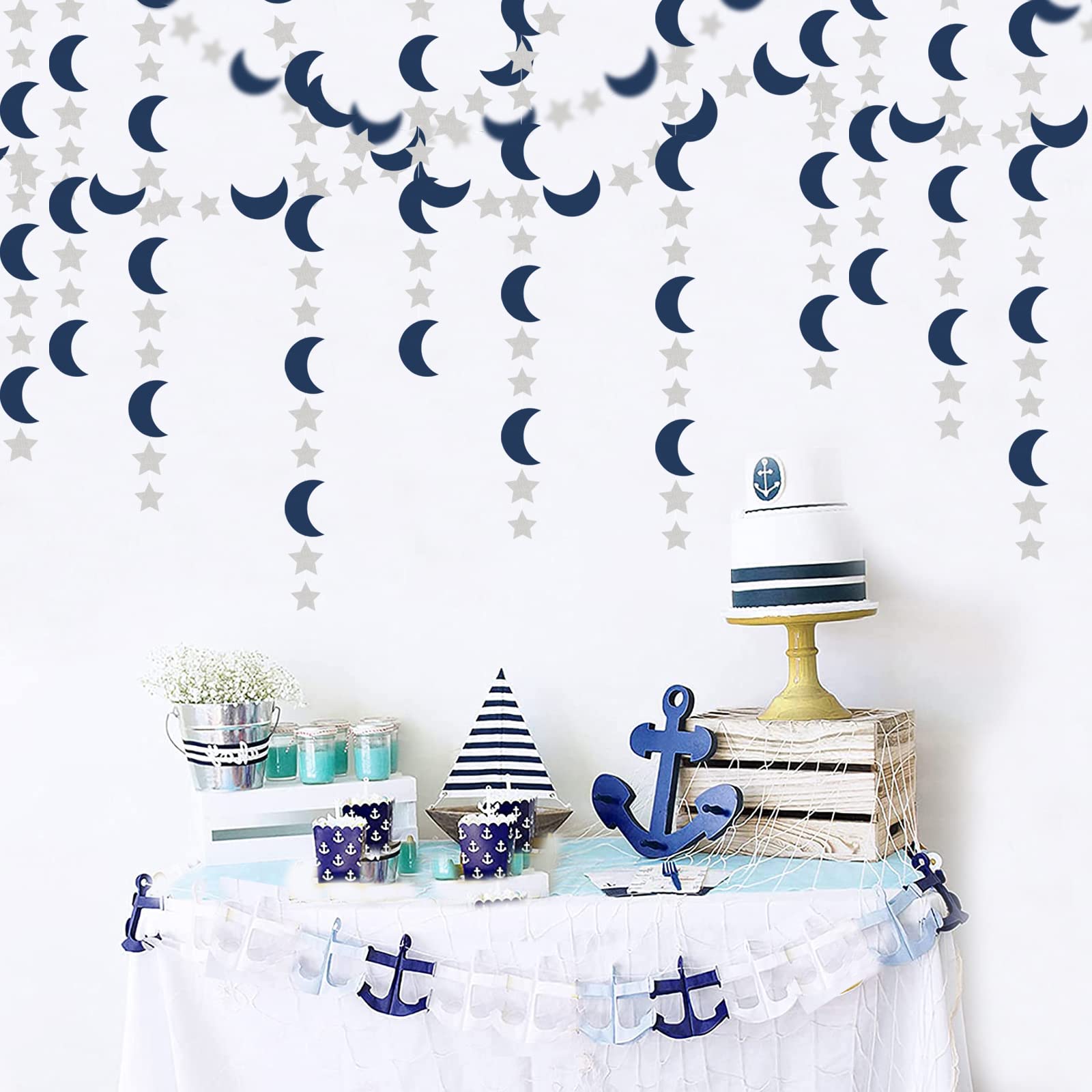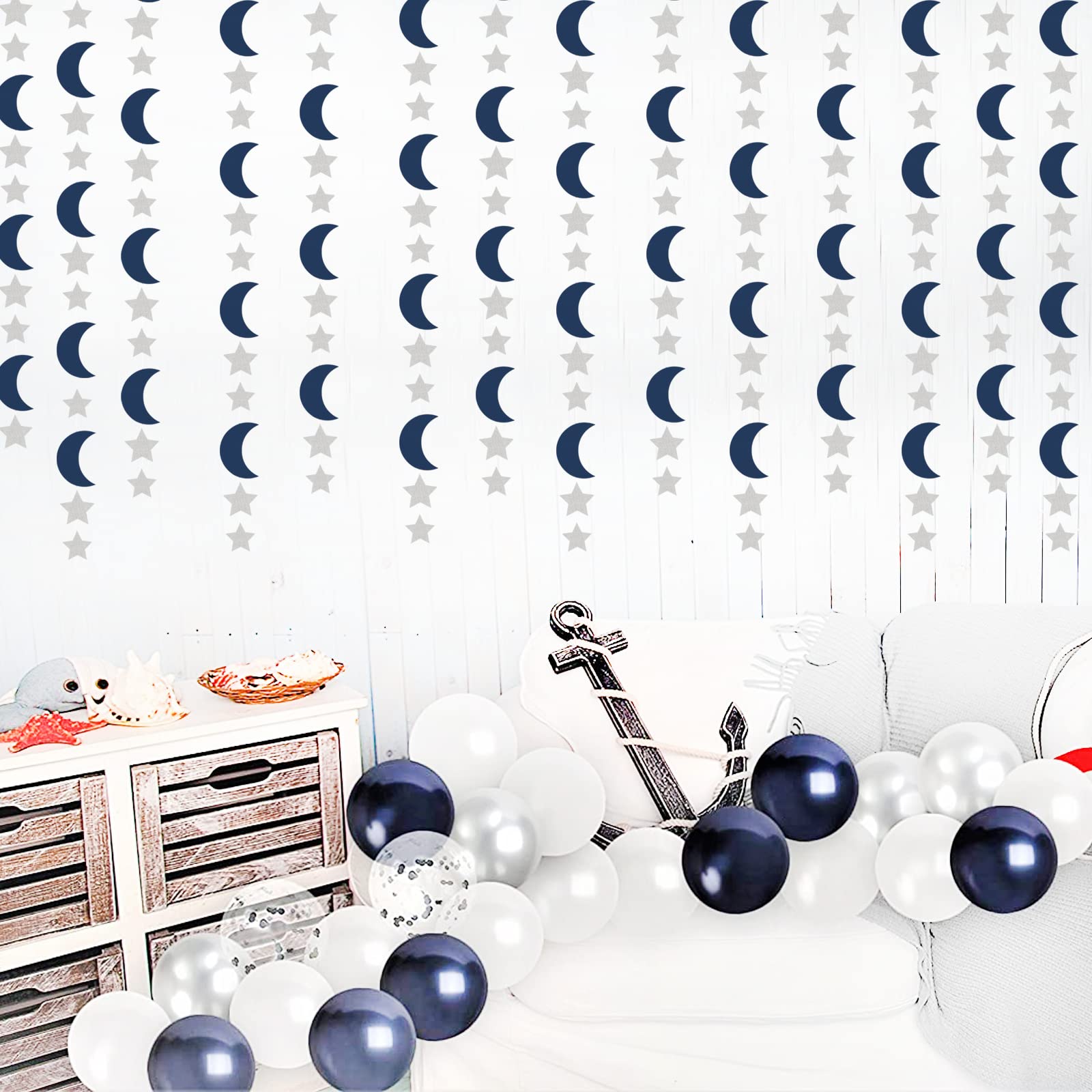 【Package Contains】4 sets of the party banner garland,each is 13 feet/ 4 meters long, total length is 52 feet/ 12 meters.Every Banner has 40pcs moon and star. 【Material】The material is eco-friendly navy blue and double side gittler silver which don't drop glitter.You can cut to any length you want if you need shorter length. 【 Easy to hanging 】Just open the package to hang it directly no need to diy again.Because they have been sewn together, which is really convenient for you. 【Using Occasion】They are perfect for eid decoration,ramadan mubarak decor,bridal shower,weddings,anniversaries,birthday,royal blue party twinkle twinkle little star decorations,eid mubarak decor. 【Quality Guarantee】If you ever have any concern with our paper garlands,just contact us and we"ll make it right!