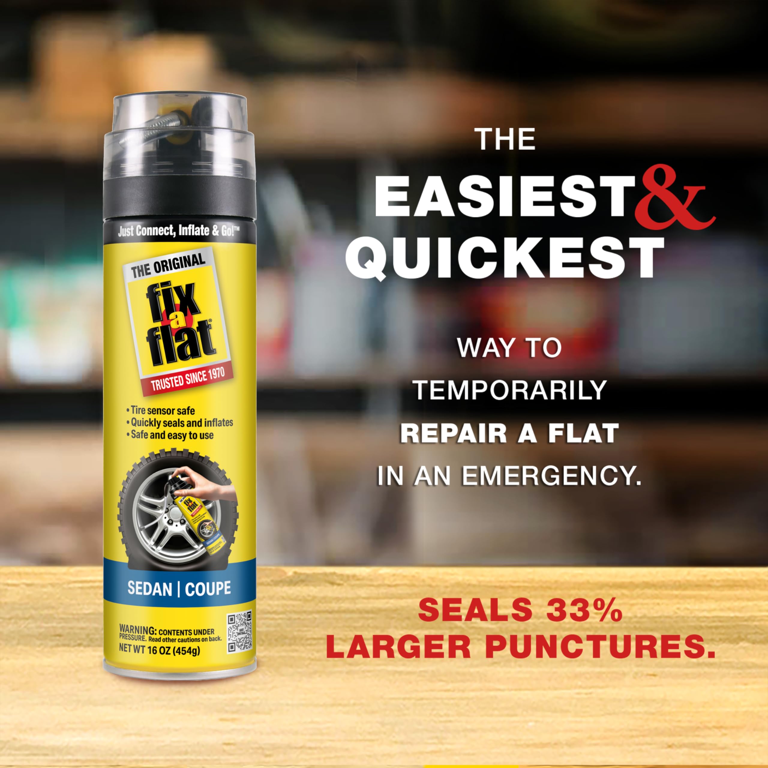 Fix-A-Flat Aerosol Tire Inflators seal punctures and inflate the tire in seconds without the need for a jack, spare tire, or any tools, allowing you to get off the road and to a service station where an approved repair can be made. This non-flammable formula is easy and safe to use, and cleans up easily with water. Fix-A-Flat Aerosol Tire Inflators are the cheapest and quickest way to repair a flat tire in an emergency. Fix-A-Flat Aerosol Tire Inflators are designed to seal small tire punctures and provide enough inflation to lift the rim off the ground.