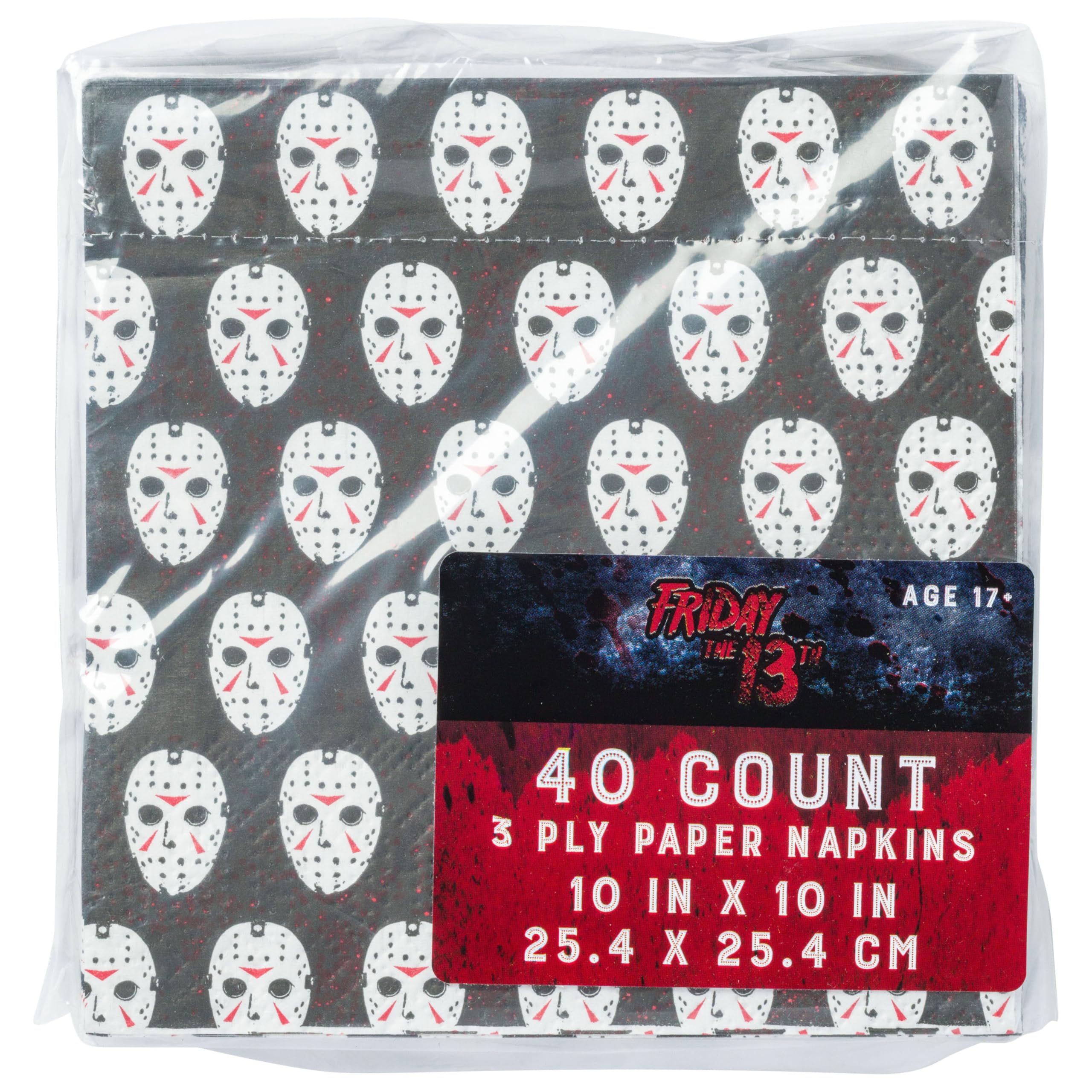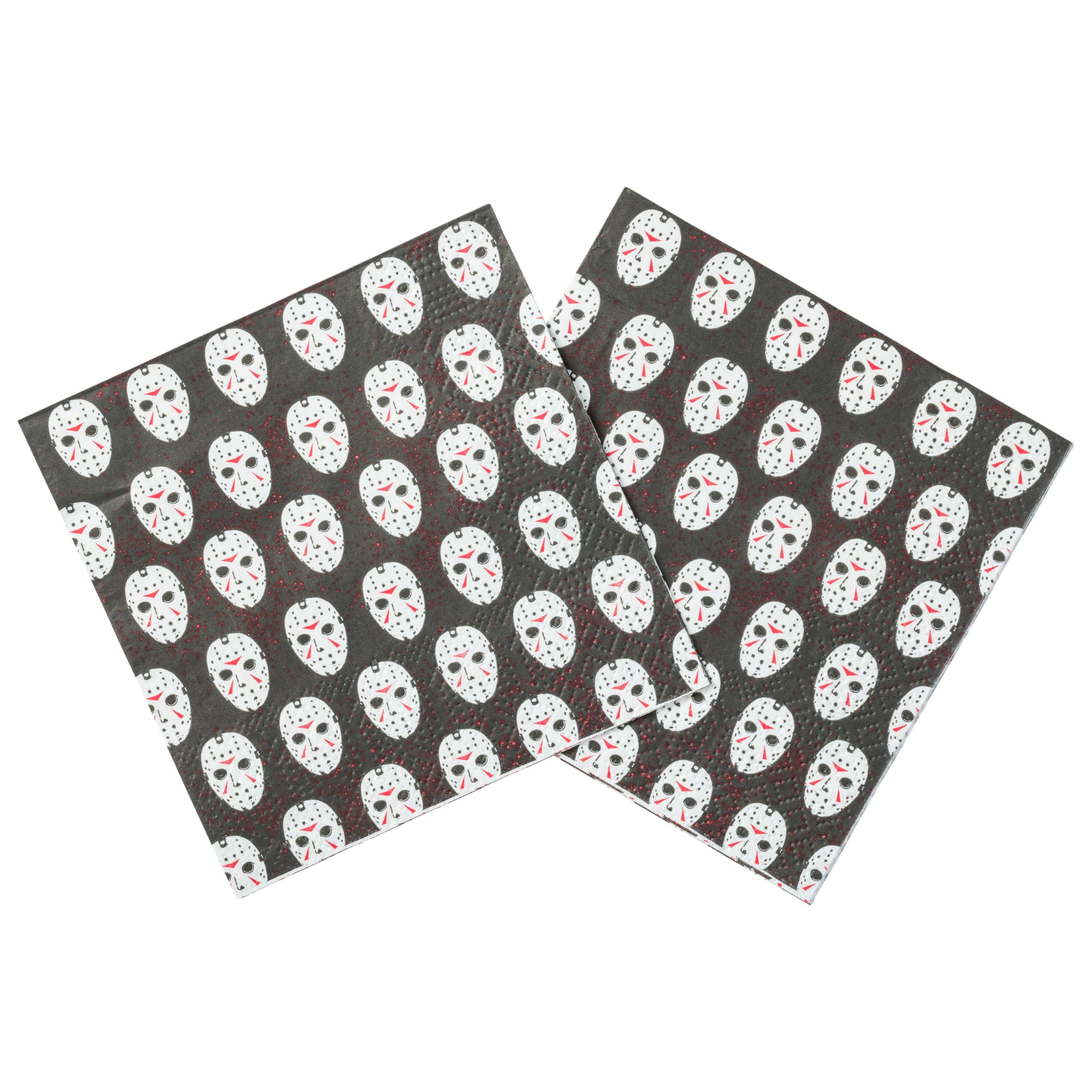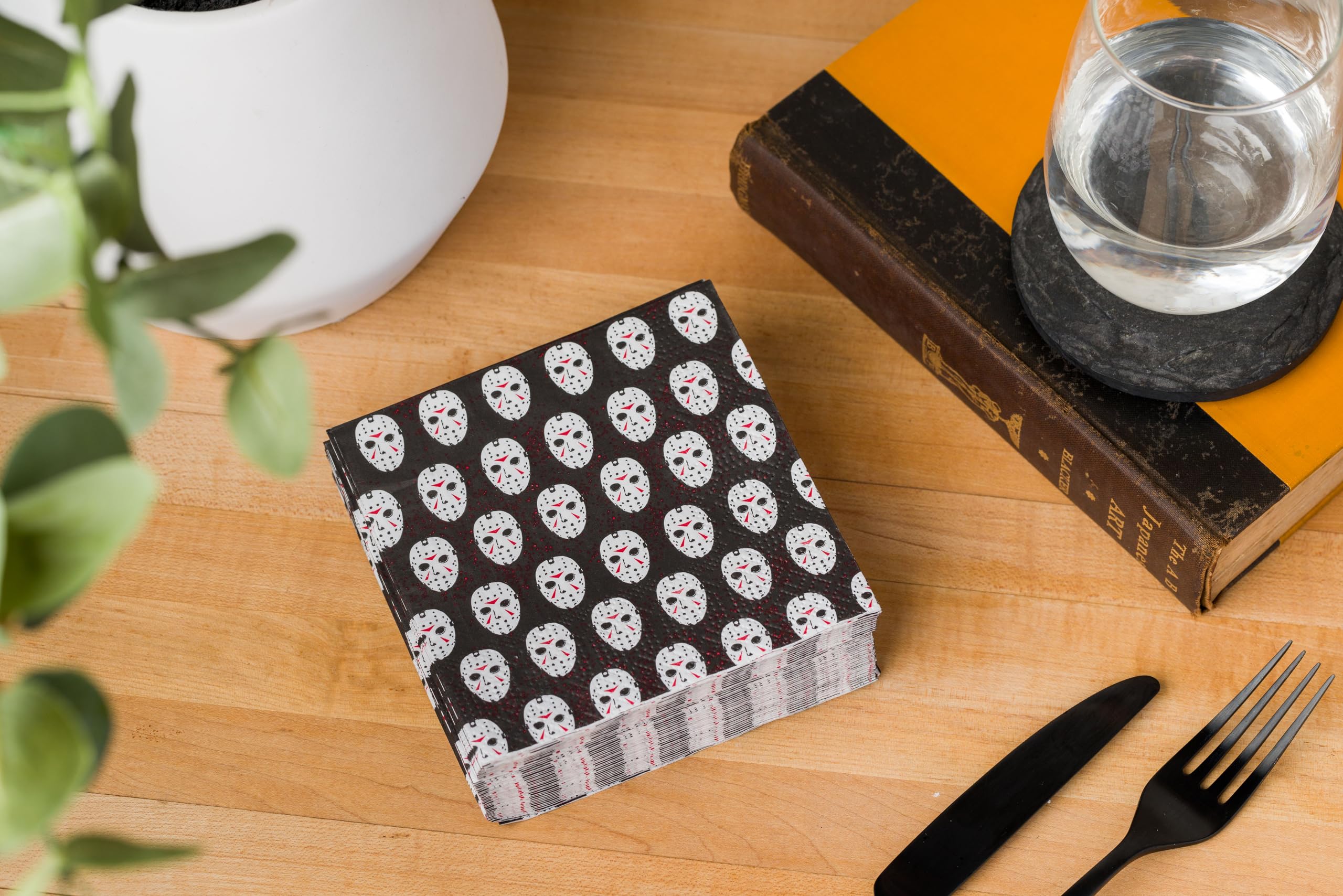 FRIDAY THE 13TH: Themed napkins are dark grey and feature a pattern of Jason Voorhees’s spinechilling mask.