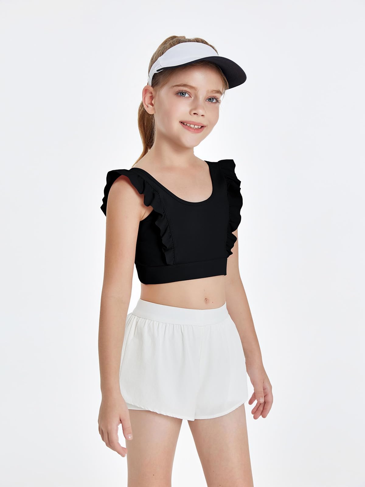 Features: Girls Sport bras deliver superior hold and support. Scoop neckline and the ruffle design looks cute and fashion.The widen elastic band underneath the breast ensures a tight secure fit, which makes sure this sports yoga bra don't easily slide or roll up, and helpfully keeps your boobs in the place when you're doing low-medium impact exercises, such as yoga, jogging, dance