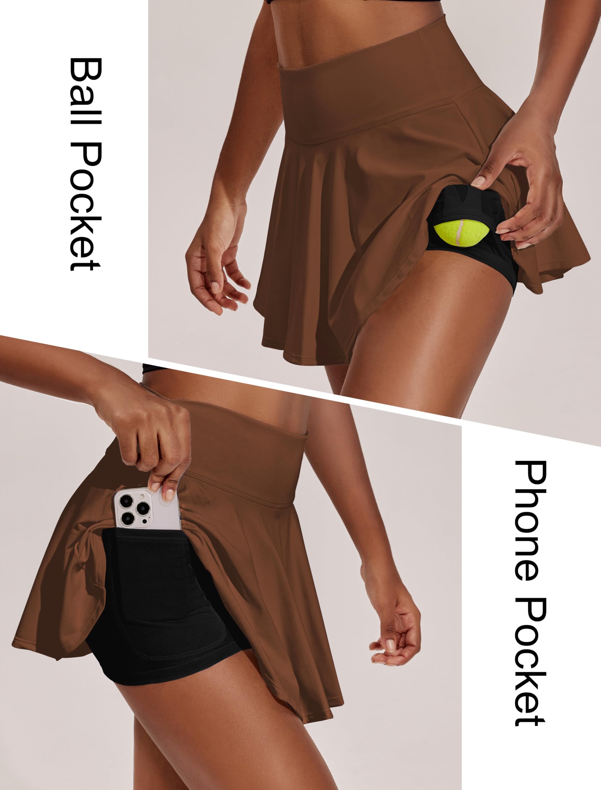 2 Pockets on Inner Shorts: The athletic skort features a built-in shorts liner with a left upside down pocket and a right phone pocket.