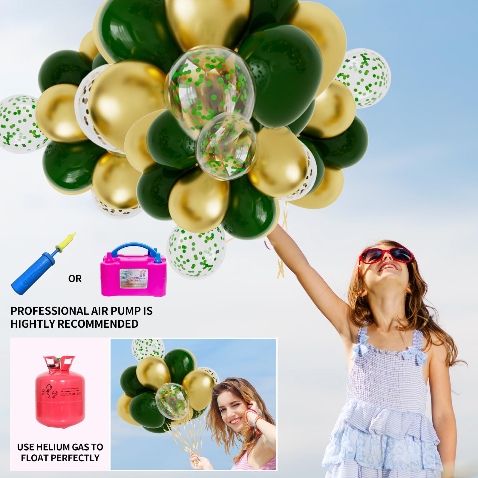 👑Package Include: including 100pcs balloons(green, gold, green confetti), 1pcs pre-strung large happy birthday banner,1*dot glue, 1*balloon strip,2*ribbons.