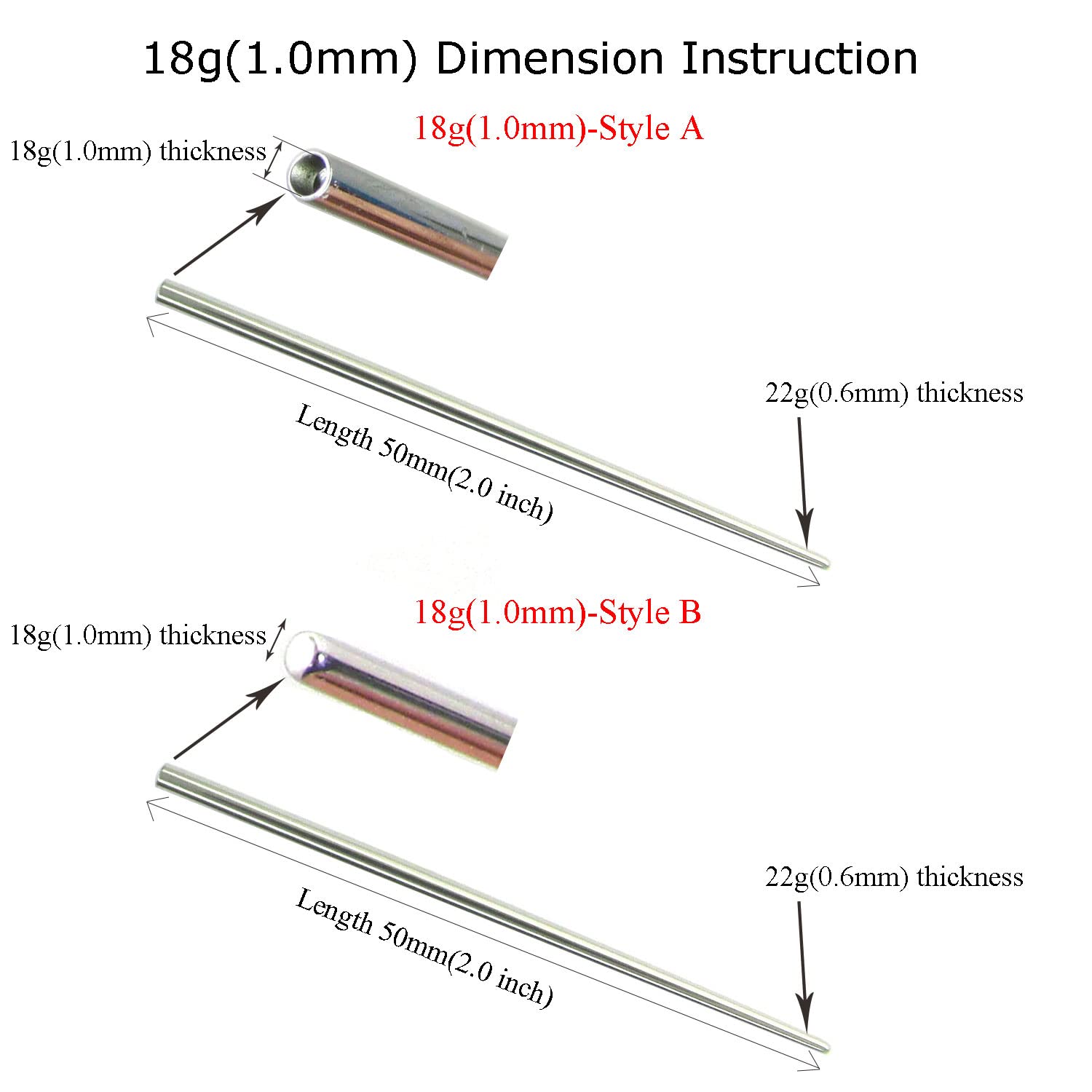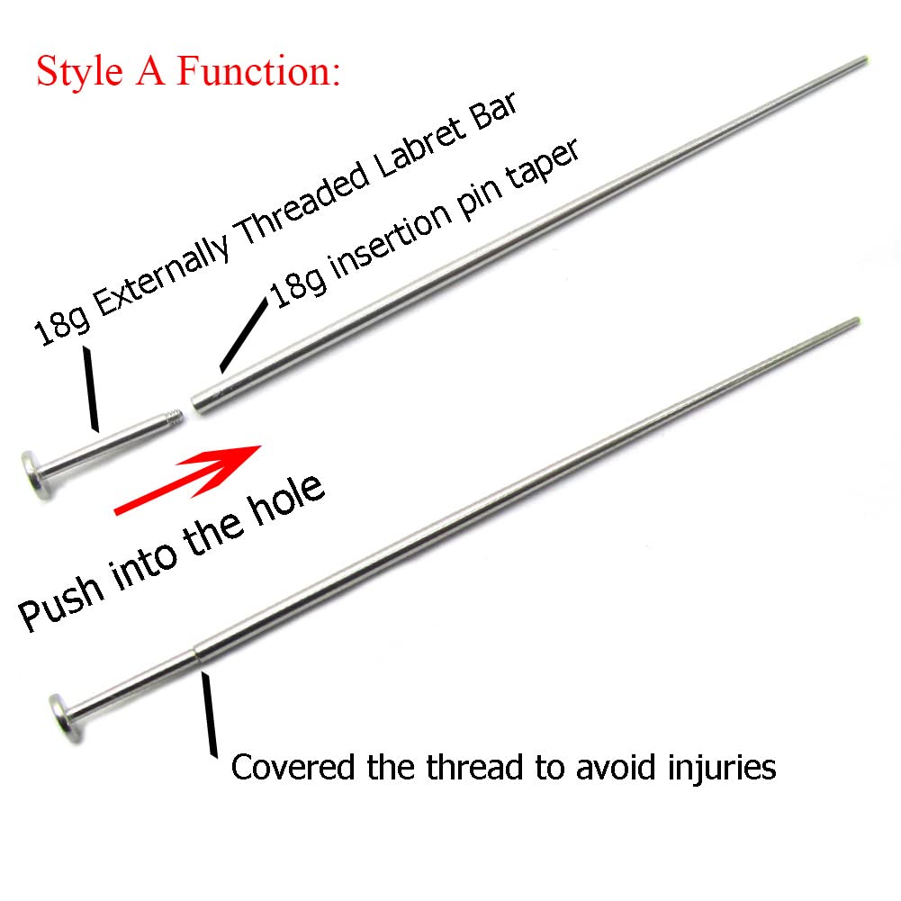 Size: 18g(1.0mm) thickness,2.0'' length(50mm). One package contains 2 insertion pins. ① Style A: a hollow at the end, ( "No Thread Inside" will NOT screw onto your externally threaded jewelry,Just holding). ② Style B: No hollow,just stretch piercing hole to 18g(1.0mm) thickness.