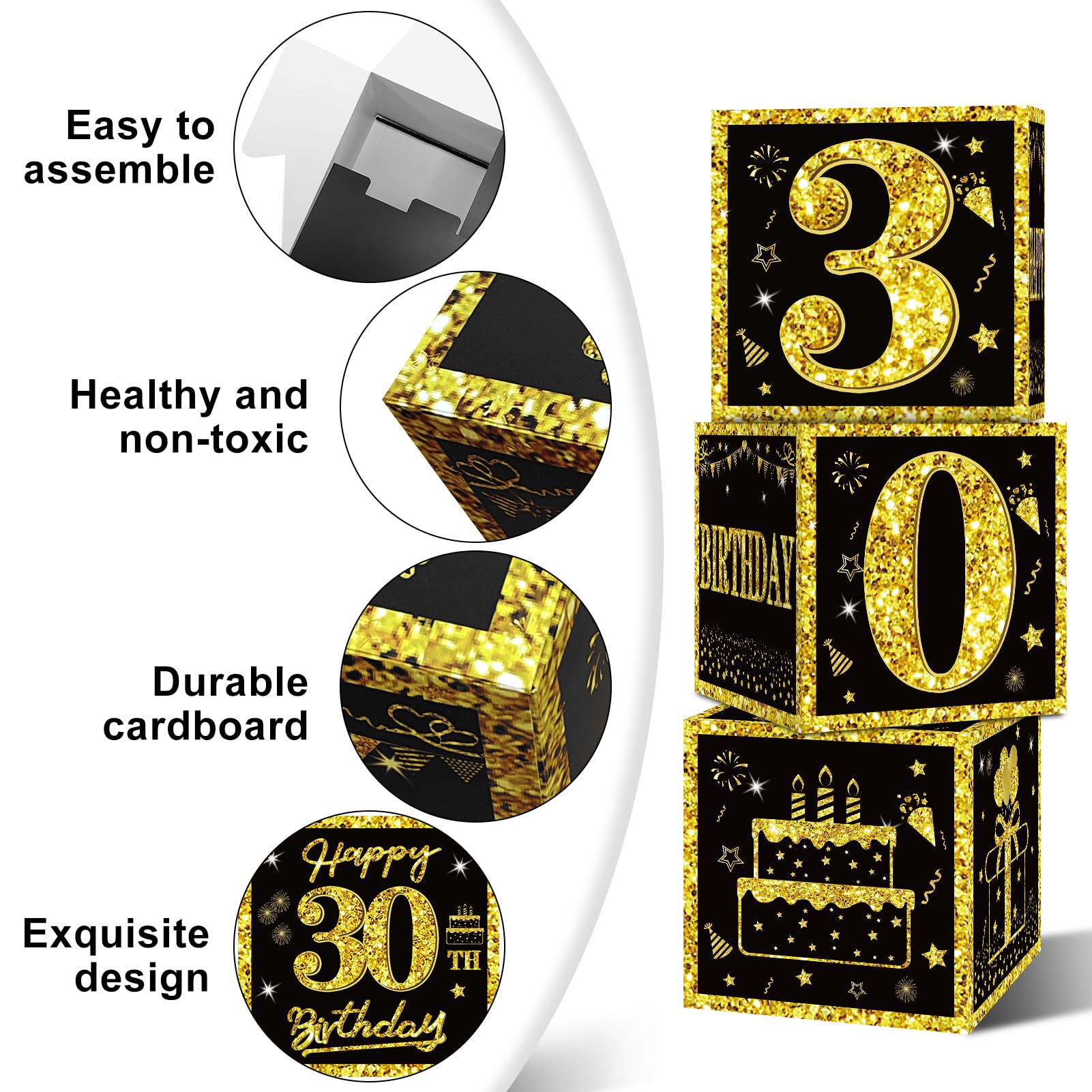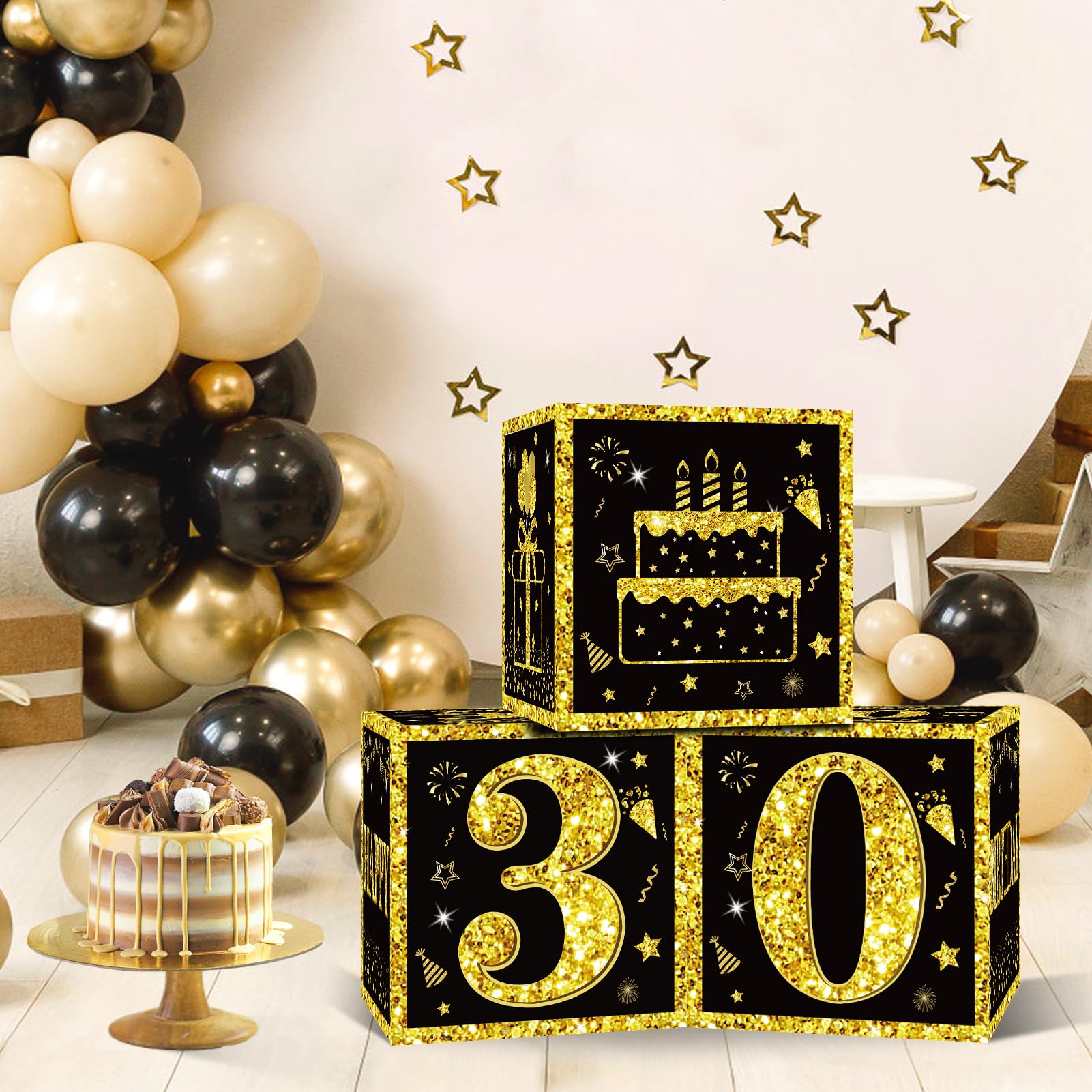 [You Will Receive] -3pcs black gold 30th birthday balloon boxes decorations, the size of each box is 10.62×10.62×10.62inch. This set of great 30th birthday party display decorations. (Note: This set of decorations does not include balloons).